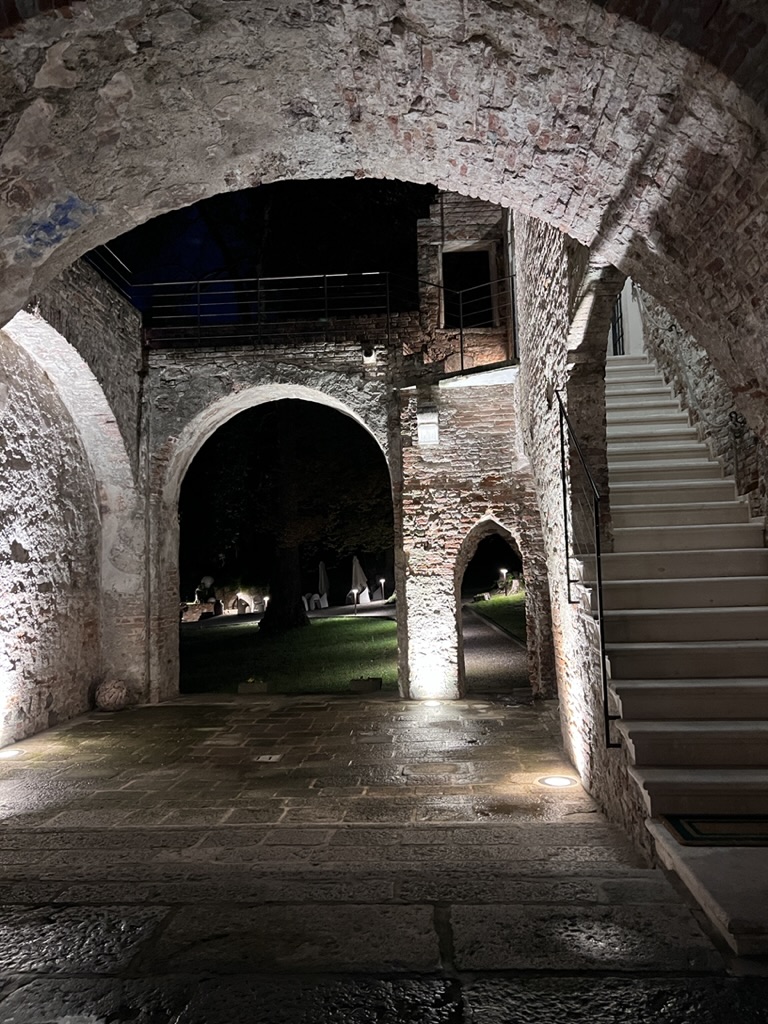 Then we finally got serious about getting to our hotel in Padova which would be about a two hour drive. All was going well, but we never saw any signs for Padova.. just Verona and Milan. Jokingly , I said… “gee maybe there are two hotels with the same name”… and one is in Verona!!” We pulled over and googled to learn that there is a Massimago Wine Suites Hotel in Verona and a Massimago Wine Tower Hotel in Padova. When I entered the name into the GPS as we left Dozza the hotel in Verona popped up quickly and I never checked that it was Verona.. only looked at the name and focused on Massimago. Both were two hours from Dozza and fortunately both were to the north. Readjusted and redirected and we were finally really on our way. Made it to Padova about 30 minutes later than expected but then the GPS just could not find the hotel.. so we circled a bit and finally drove over the little river that goes through the city about three times and made it to the very lovely Massimago Wine Tower Hotel with just 4 rooms. We are in a two level “suite”.. The place is wonderful (and we’ll see more of it tomorrow.) It’s very centrally located but sort of nestled in a park-like green space that feels as if it is in the countryside. Too small to have many services, but we don’t need much. They deliver a box breakfast in the morning to your door.