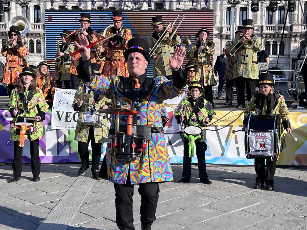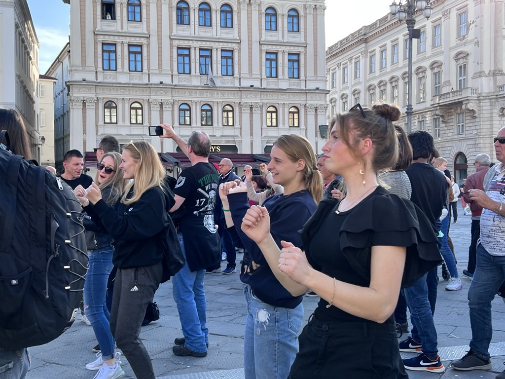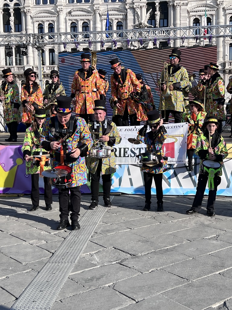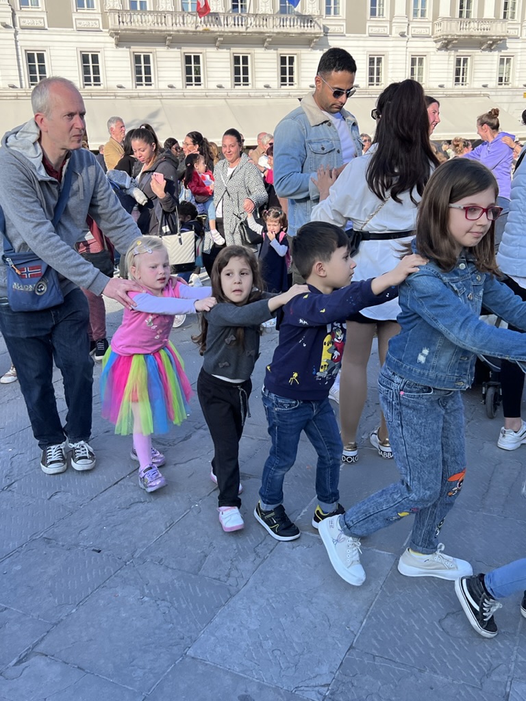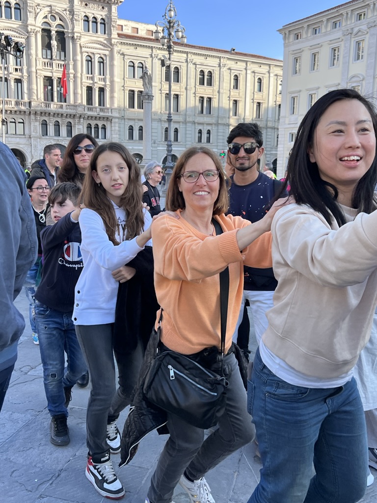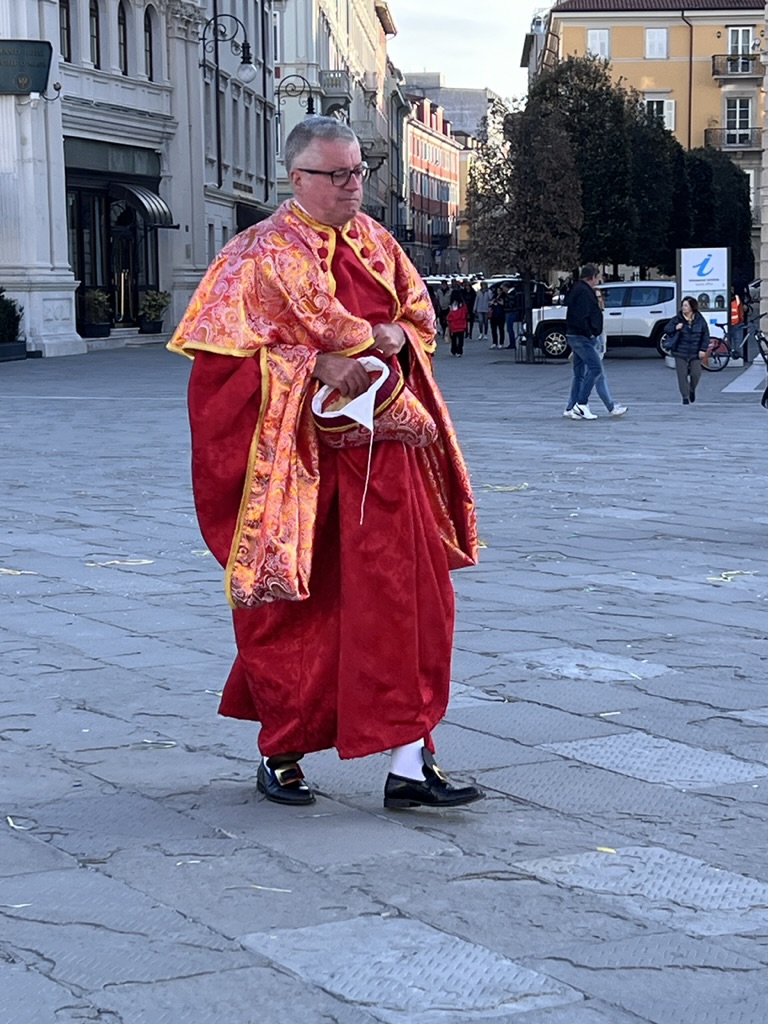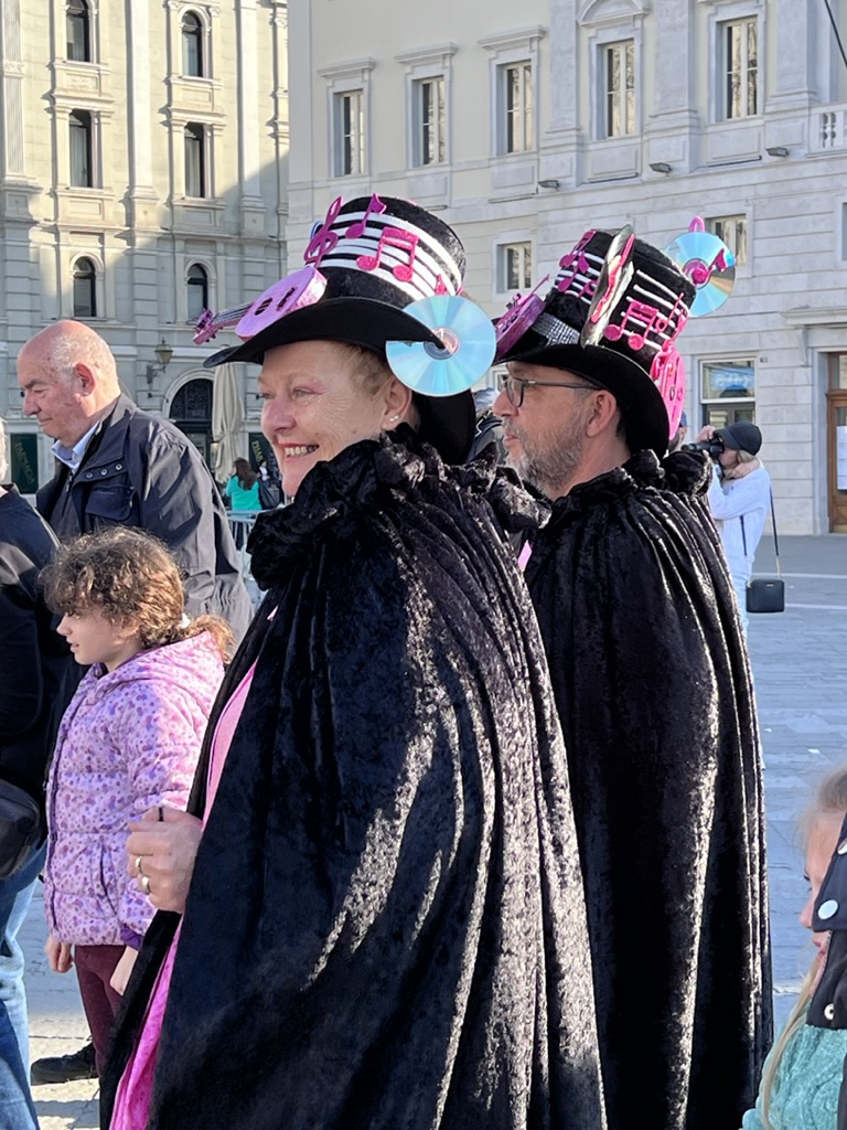 We arrived at around 4:00 and immediately left the hotel to stroll — with the intention of walking out to the big stone “pier” that is now a strolling hangout where you can watch ships come and go or just sit. It was packed with people of every age and ethnicity; actually we’ve seen more people of color here in a few hours than we’ve seen in Italy on the rest of the trip. But we were distracted by loud music and microphones coming from the square. So we headed that way. Turns out that today was “Carnival” in Trieste and the final part of it was music and dancing in the square. Many people were in costume, sort of like Mardi Gras. The emcee and singers were very funny, even though we didn’t totally understand what they were saying. One routine was having everyone in the square (about 400) dance and sing to “Y-M-C-A”… It was loud, it was raucous, it was lots of fun. Children and adults were singing and dancing throughout the square. After a few sets, we continued our stroll to the waterfront just in front of the square.