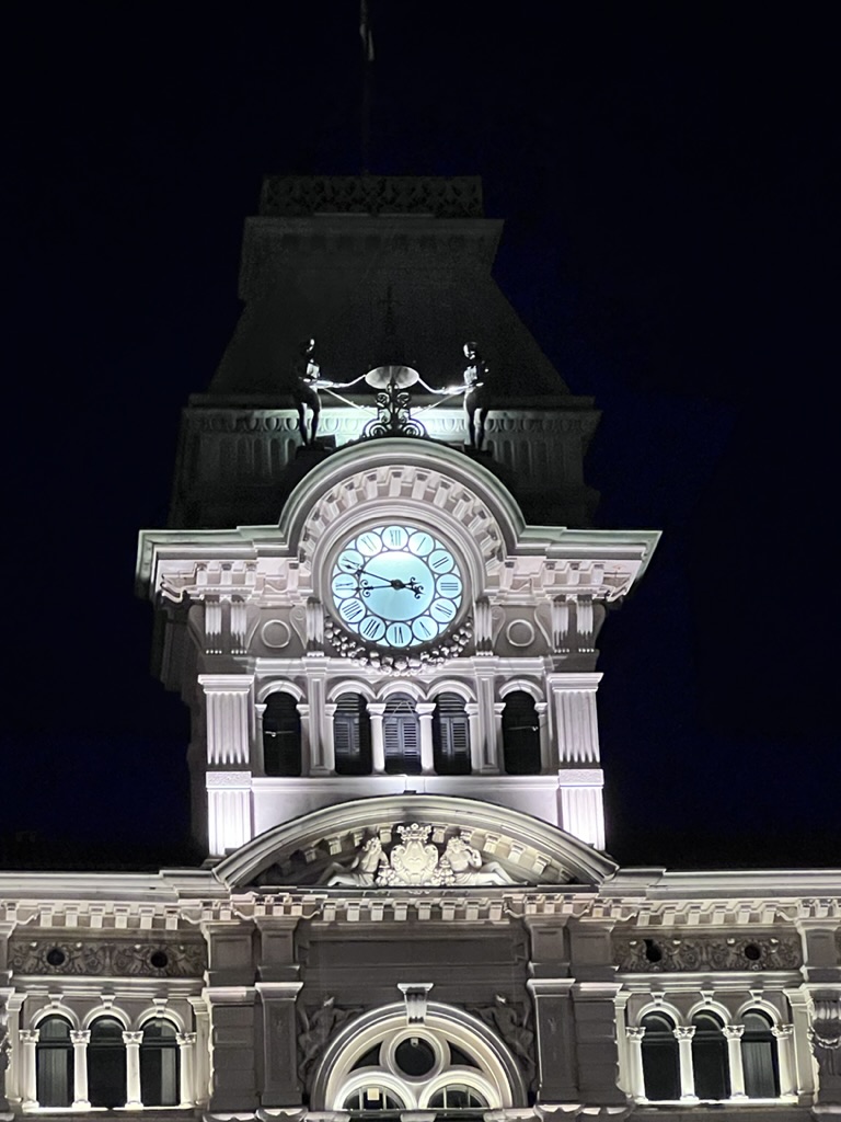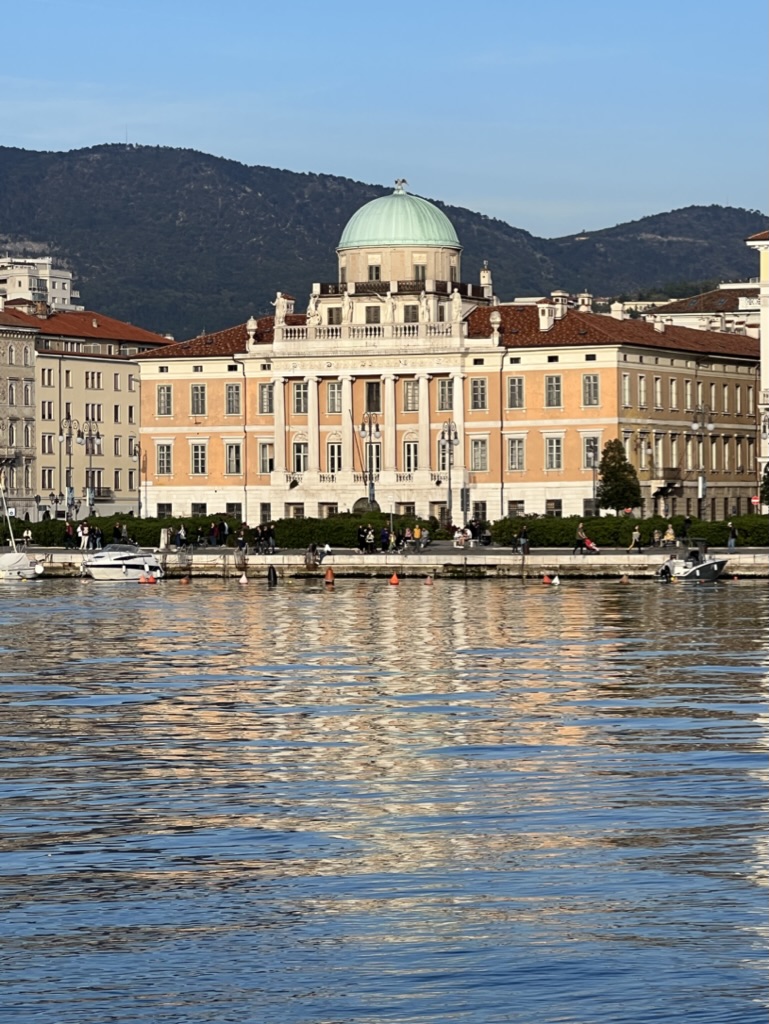 Anyway, after lunch we headed to Trieste, a city we have not been to in decades. What I remembered most about the city was that it seemed more like Vienna or Budapest than like Italian cities in the demeanor of the people. The physical nature of the city includes broader streets than in other parts of Italy, and the building stock is more 19th and early 20th century than 15th, 16th, and 17th century than the other places we’ve been traveling on this trip. I also remembered the large square and the walk along the sea, and lots of people strolling at night.