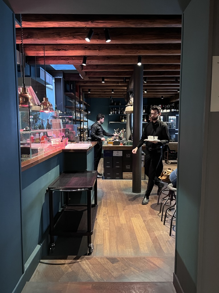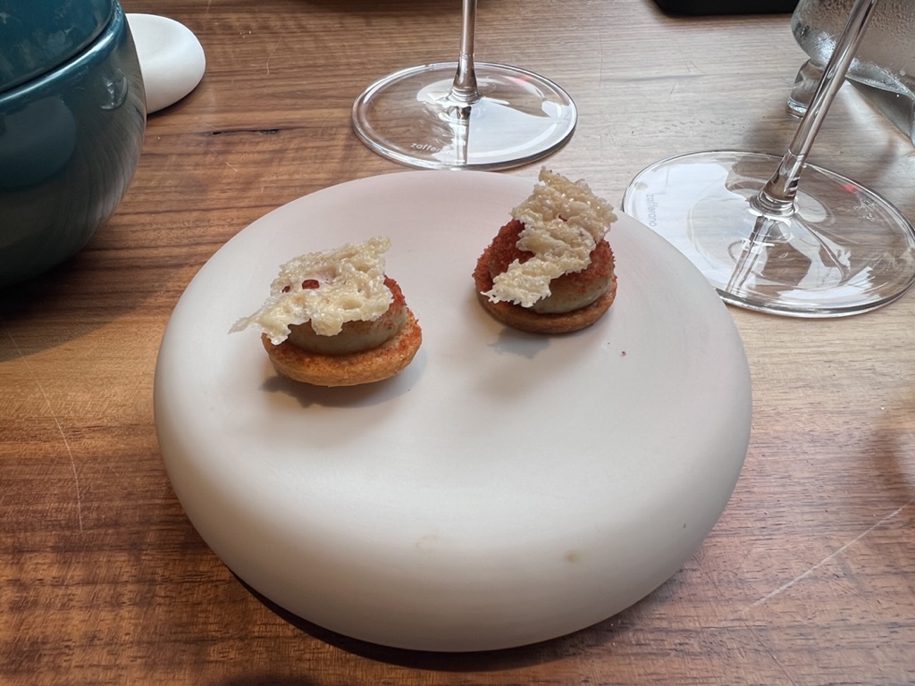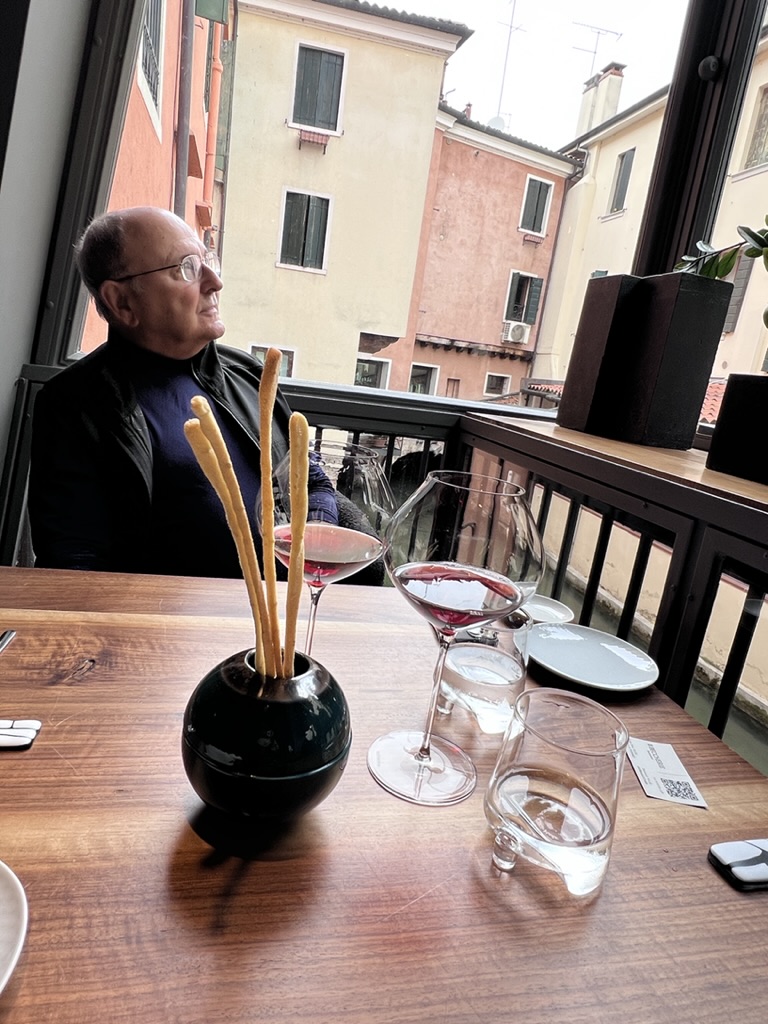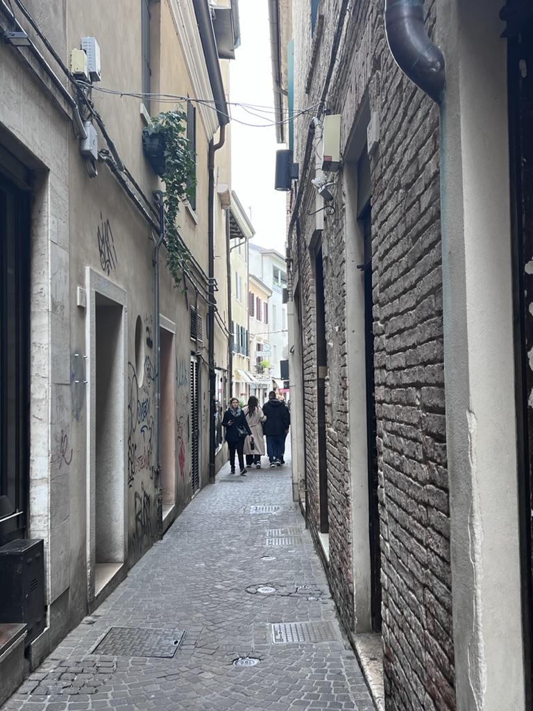 Due to the rather leisurely lunch at Le Beccherie, which is located right on a small canal, surprisingly with water clear enough to see to the bottom (Le Beccherie was worth a trip all on its own) and the fact that the weather was so uncertain, we only had time for a very short walk to and from where we had to park our car (outside the historic center) and a few detours to see some great streets. So, Le Beccherie… we really were just looking to have a simple lunch…was a huge surprise. We shared a starter and a pasta and a dessert. But before we began the meal four incredible little “nibbles” – “gifts from the chefs” (which is the norm in the high-end restaurants) arrived at the table… one more aesthetic than the other and each just wonderful little bites, along with fennel bread sticks and fantastic olive oil. Our starter was a beef tartare that looked like dessert when it arrived at the table—beef with lemongrass foam and a tart green sauce, along with some other ingredients. The pasta was a homemade egg chitarra pasta with hazelnuts and miso butter topped with grouper tartare and a little caviar. For dessert we tried their supposedly famous tiramisu…which we were told was literally invented there in Treviso and also learned that the word “tiramisu” is one of the five most famous Italian words in the world.