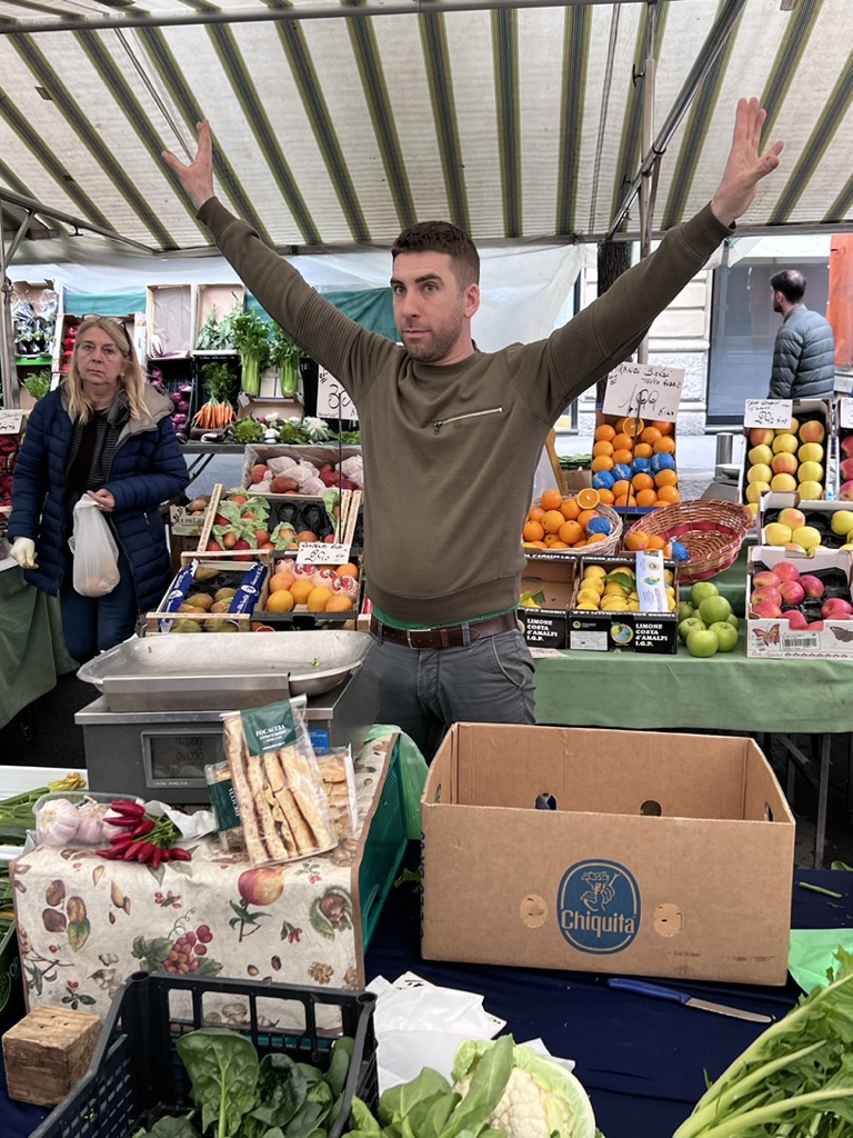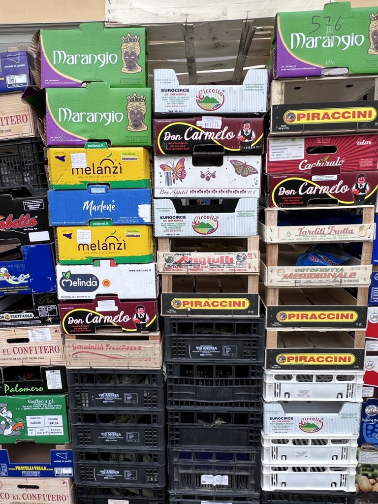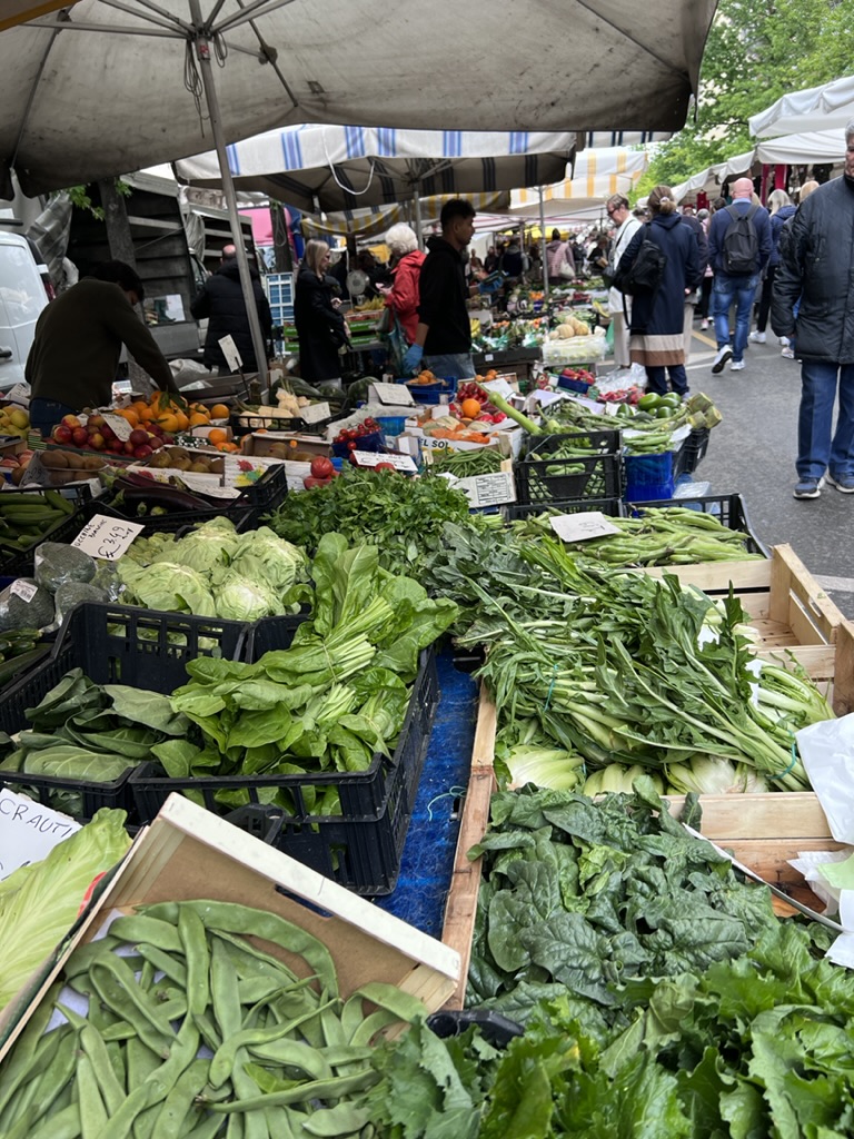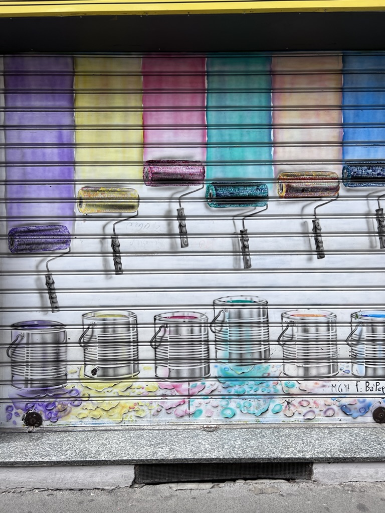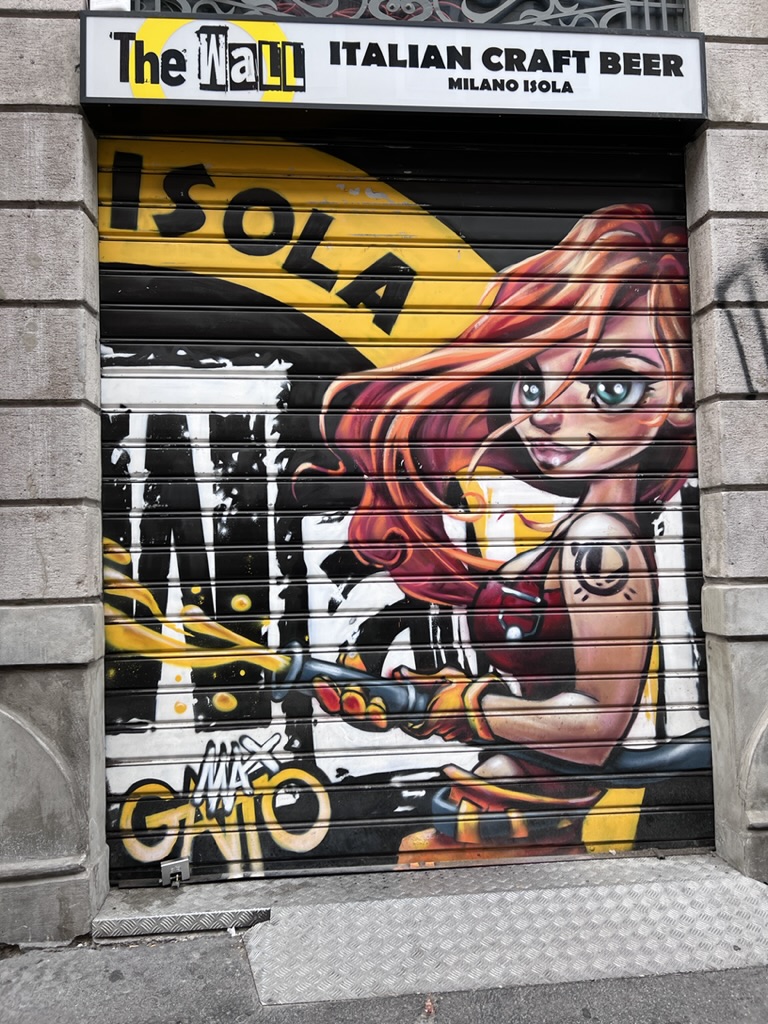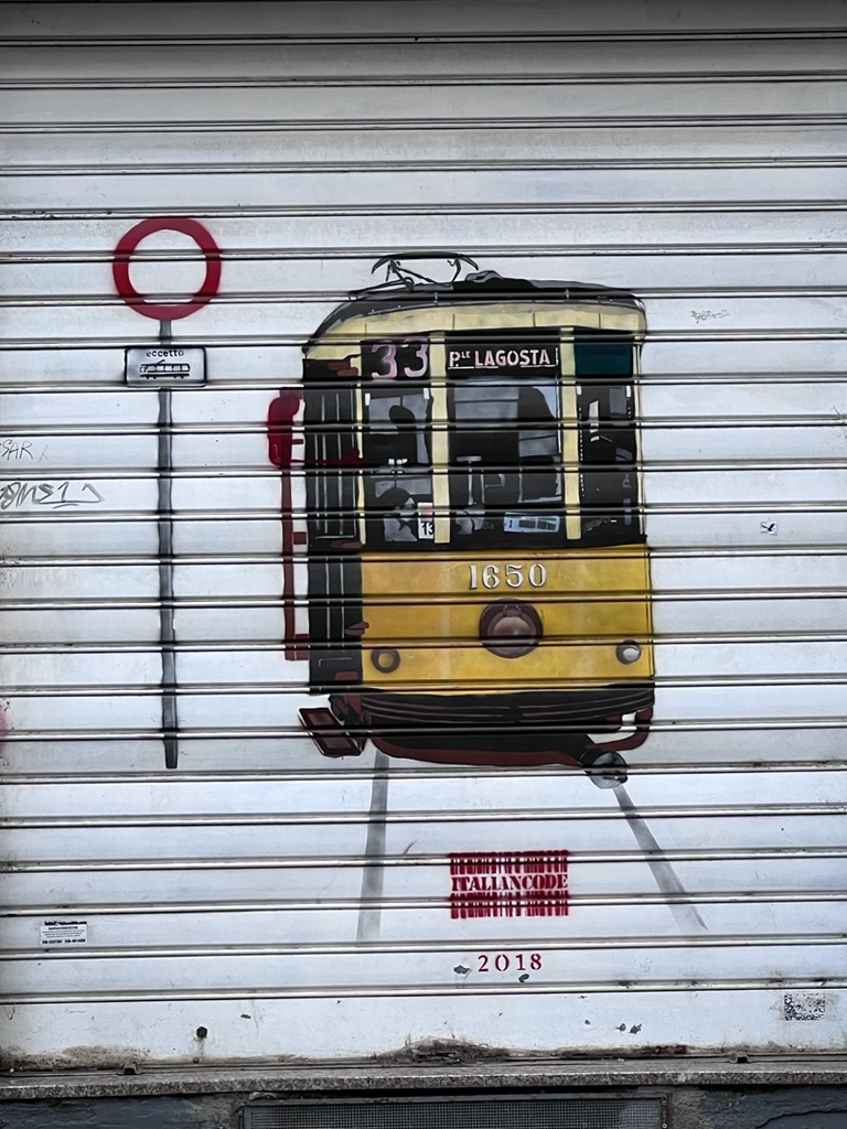 In the meantime, I’ve been explouring (or re-exploring) Milan. I headed directly for the Isola neighborhood after a quick stand-up morning snack at a local café. Took a taxi so that I could then walk around that neighborhood. Isola is one of those “up and coming” (translate—gentrifying) neighborhoods that used to be a working class area and is now hip and full of restaurants and galleries and cute boutiques. They compare it to Rome’s Trastverre but it’s not quite there yet. Today was their market day which stretched for blocks and blocks of fresh veggies and fruits and cheeses and meats and also used clothing and kitchen gear and all sorts of goodies from underwear to toys. I strolled and strolled and strolled. The taxi driver was a little confused as to why I was going to “this” market and told me about others that were “nicer.” He didn’t speak much English but I got the message; he also told me that in “this” neighborhood I needed to be sure to hold my phone and my wallet very close.