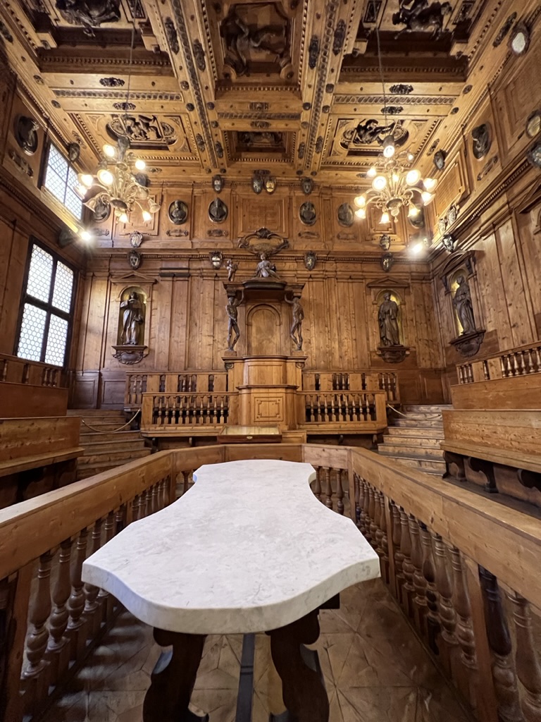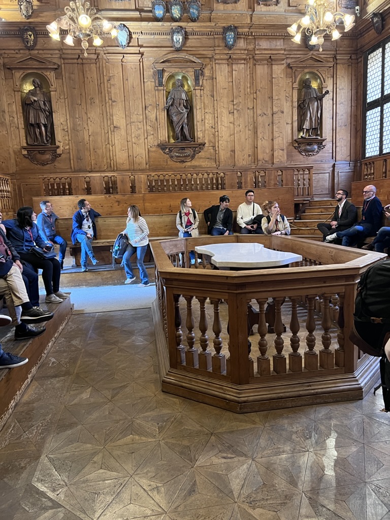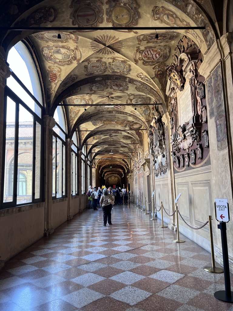Then we strolled to the Teatro Anatomica which is housed in Palazzo dell’Archiginnasio which is home to an amazing library. The Teatro is from the 17th Century and is the room where public body dissections took place. According to the literature, these dissections were done with an Inquisition priest watching and ready to intervene “if proceedings became too spiritually compromising” — whatever that means. There are wood tiered seats around the room that surround a marble topped table, where the body used for the demonstration, was laid. Above the table there is a sculpted Apollo looking down from the ceiling. Also, the lecturer’s station at the front of the room has a wood canopy that is held up by two skinless, wood-carved figures. Boy, those were the days!!!