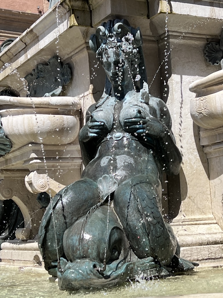 We began our day today, like probably every other foreigner who comes to Bologna, by walking to Piazza Maggiore which is really the heart of the city and the result of centuries of transformations that added important buildings around the perimeter, including the Basilica of San Petronio, the Palazzo dei Notai, the Palazzo d’Accursio, the Palazzo del Podestà and the Palazzo dei Banchi. The square itself dates back to the 13th Century, when different functions were brought to this central place. It’s roughly 200’ x 380’ which is about twice the width of a football field and half again as long. The piazza was (and I suppose is every day) filled with school kids on class trips, everyday Bolognans criss-crossing to get to work or home, and tourists. It’s got a real vibe, with cafes lining the fronts of all buildings, except the churches.