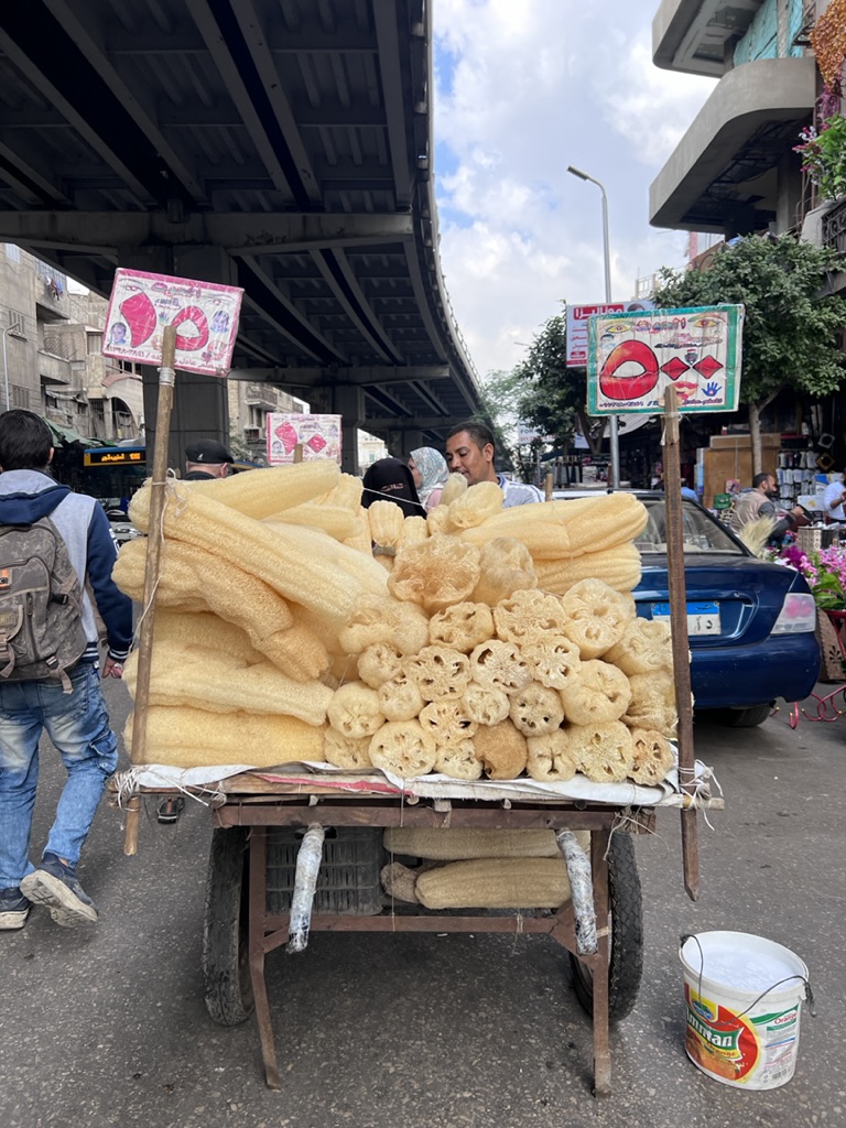 But the walk from the ATM to the Metro which took us about 40 minutes was a site to behold. Every inch of pavement was taken up by vendors selling everything from clothing and shoes to electronics, kitchen supplies, perfume, and any other item you could imagine. At this point we were outside of the walled city and in the thick of daily life. The crowds were unbelievable and we could rarely stay on whatever area remained as sidewalk; and reverted to walking in the streets like everyone else—amid the nightmare of Cairo’s traffic. I think my lung capacity dropped immensely breathing in all the fumes; cannot imagine what level of lung diseases residents here have, especially the traffic “control” people (ha ha) who are out in this all day. Everywhere you walk there are messages from vendors (marketing) blasting from speakers. We finally figured out that they tape their hawker’s pitches and then just play them through a loop on their speaker all day at their cart. So you just hear all these competing messages—very loud to drown out traffic noise. To be honest, we had a great deal of fun watching all of this go by as we sought to find the Metro.