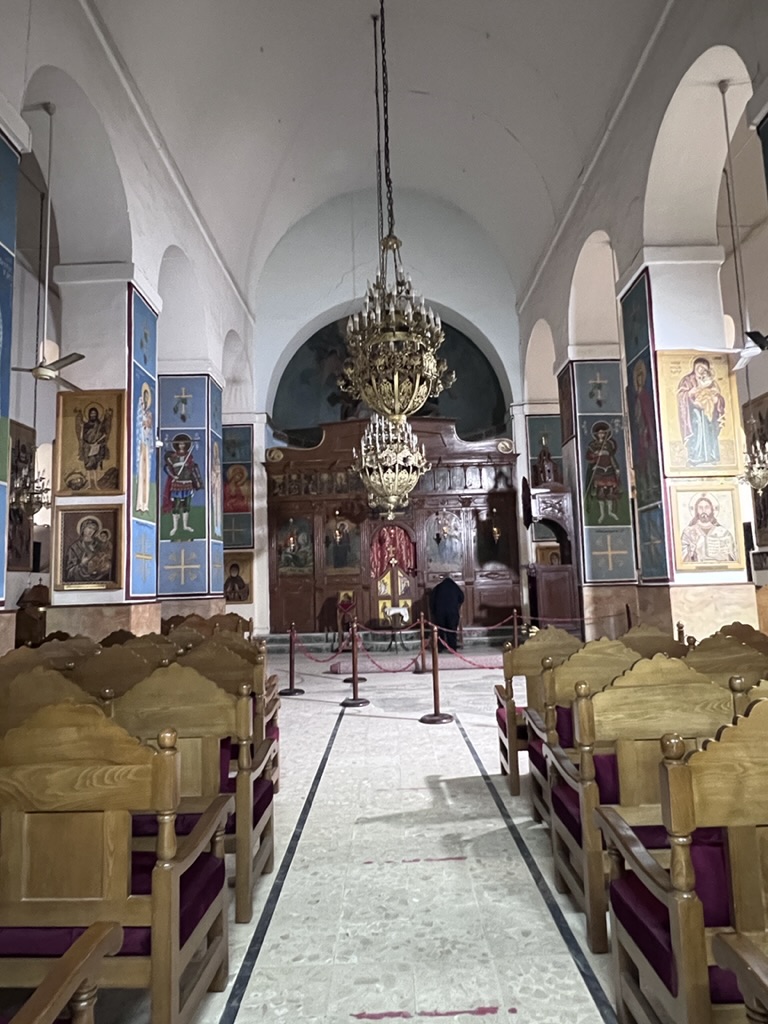 And then we were off. The rental car place gave us a little Wi-Fi hotspot gizmo that we plugged into the USB slot and that enabled us to get a strong GPS signal. Since we now had only about an hour’s drive to the Dead Sea, we decided to take a small road as opposed to the Sahara Desert “Highway.” We drove on pretty bumpy, rocky roads and went to Madaba, an ancient town with a population of about 60,000. It dates to the Middle Bronze Age and was ruled by the Romans and Byzantine empires from the 2nd to the 7th centuries; it has a large Christian population. We drove through narrow, dirt streets to get to the top of the hill and parked so that we could walk to the St. George’s Greek Orthodox Church which is known for its incredible mosaics. The church itself is pretty modest and only about 150 years old. But when they were building the church, construction workers came across the remnants of a Byzantine church. Among the rubble the flooring that was discovered wasn’t just an ordinary mosaic. It was the oldest map of Palestine and scholars say it provided many historical insights into the region. The map dates to 560 AD and depicts major biblical sites in the region. There are also many other mosaics throughout the church.