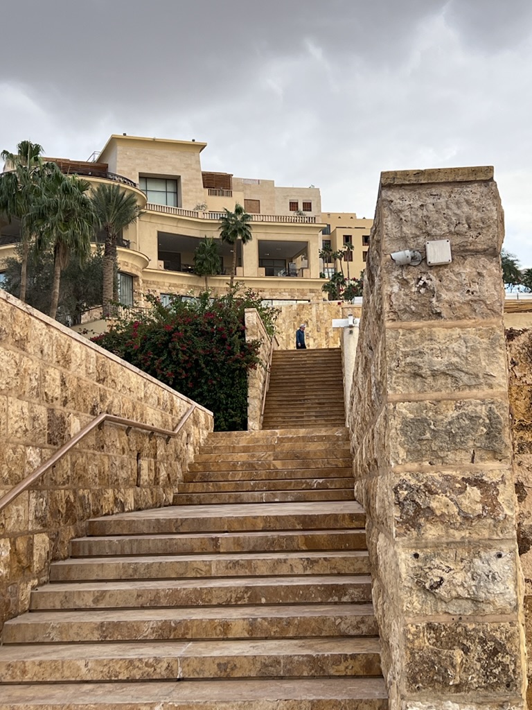 From Madaba we continued on this older, smaller road – through lots of rubble — until we eventually joined in with the “highway” and found our way to the Kempinski Ishtar hotel right on the Dead Sea. After checking in and getting our room, we walked down to the water (naturally we don’t have bathing suits with us, since we never find ourselves in ‘resort-like’ settings) and surveyed the massive hotel grounds that meander and meander. We stopped for a snack in one of the three restaurants on site. When we checked in, they said there was an Italian restaurant, a Lebanese restaurant, and an ‘international’ restaurant. We stopped at what we believed to be the Italian one. We asked the waiter, but he said (in limited English) that this used to be an Italian restaurant but was now Mediterranean. We sat and looked at the menu which was all pastas and pizzas. We also asked about the International restaurant, but he said that was now Mexican (?) In any case, there are Italian, Lebanese, and “international” restaurants on site. We decided on Lebanese for dinner, and it was fine.