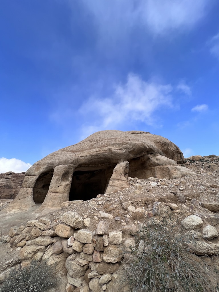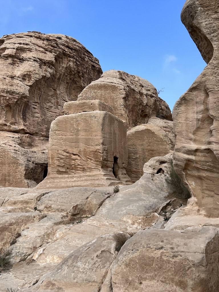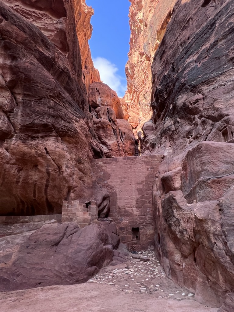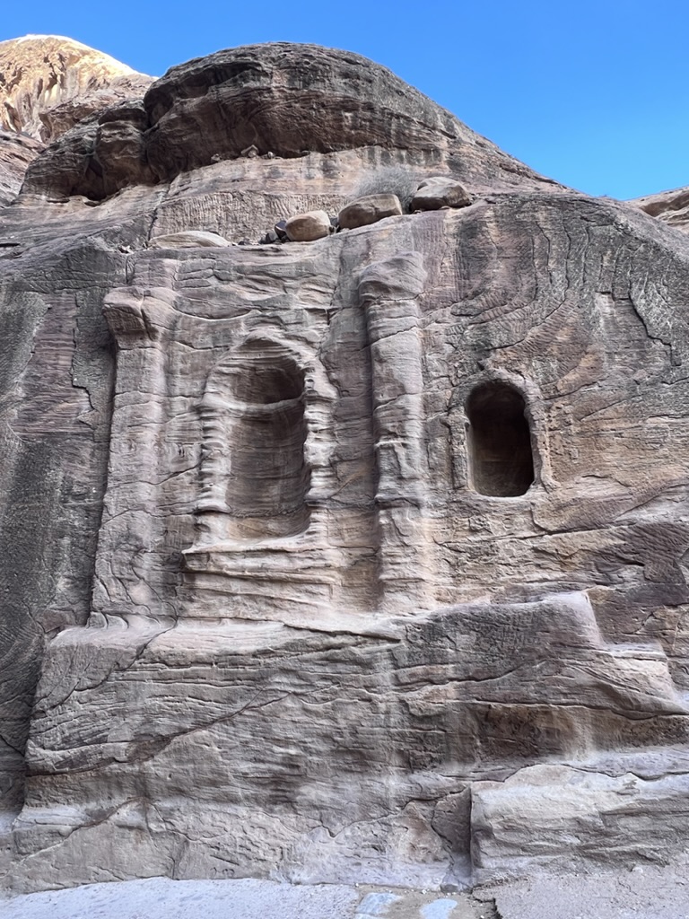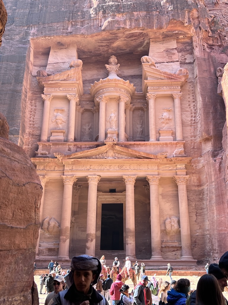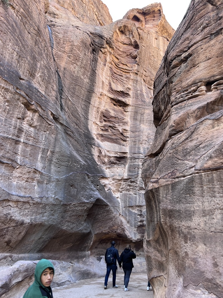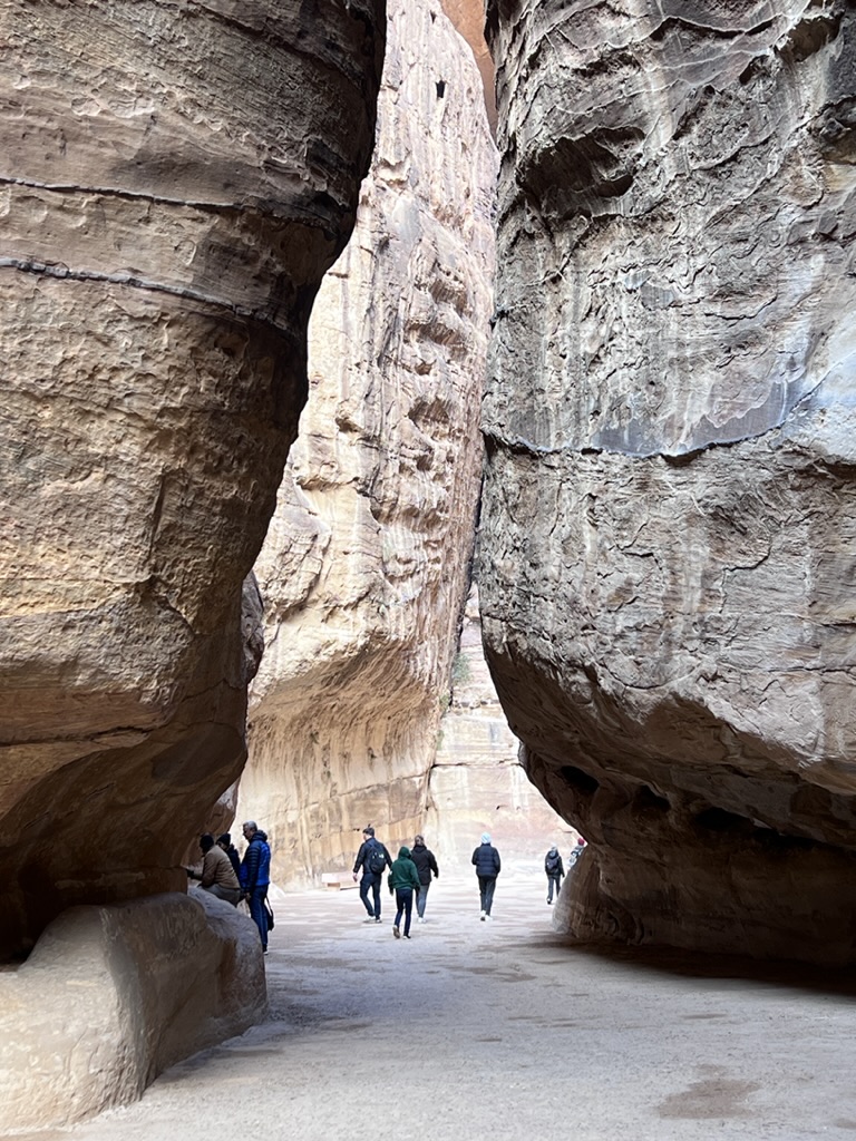 This morning, following breakfast we headed out again to Petra to see it in daylight. We drove ourselves down the winding road, which was –at times—fogged in and at others opening to bright sun. We retraced our steps through the sig which –after walking between narrow, high-walled canyons, the path suddenly open up at the 360-foot high Treasury (which is called that name because it is believed that a pharaoh’s treasures are concealed in this space). Still, it appears that no one is certain what purpose the building (constructed in the 1st Century BCE) served. But the urn at the top definitely represented a memorial for royalty. Some archaeologists think the building was a temple; others say it was a place to store documents; recent excavations have unearthed a graveyard beneath the Treasury. It looks as if there was some Greco-Roman influence when seeing the soaring columns and the “raked” pediment atop the columns. The trade routes caused all sorts of cross-pollination and you can see this at the Treasury. In any case, it’s spectacular. Definitely memorable.