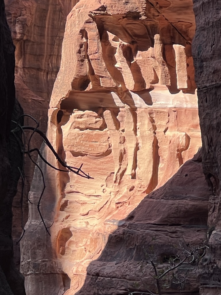 Had we arrived earlier yesterday, we would have walked to the Treasury (as we did today), and then probably would have taken one of the little carts directly to the Treasury today… and then walked deeper into the site. But given that we had now hiked to the Treasury twice (once in darkness, save for the little candles placed about every thirty feet and once in daylight) – with a change in elevation of 500 feet (all downhill going and all uphill coming back) it would have been too much to walk beyond that part. Petra is a photographer’s delight; every step and every turn is photo-worthy.