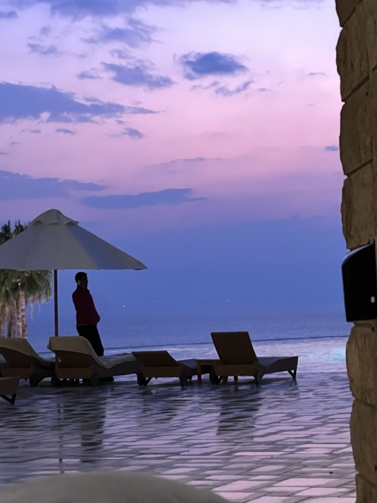 We got back to the Kempinski Ishtar at about 5:30 just as the sun was setting—tired, chilled, and ready for massages. But alas, we were too late to get a reservation for any treatment at the spa. And it was cold and damp so no real interest in swimming in one of the five or six pools here… and too cold to dip into the Dead Sea. So, we are probably the only people who have now been to this spa resort twice without getting to the spa. The irony of it all is that this night we are actually staying in the spa building… in a wonderful panoramic view room (so we can see the Dead Sea clearly and without any obstructions). Because we are in the spa building our room comes complete with yoga mats and little weights and extra space for two people to be able to lay out their yoga mats! Those of you who know us will know that these amenities are unlikely to be used.