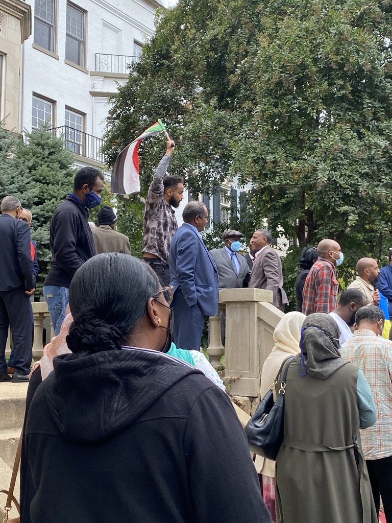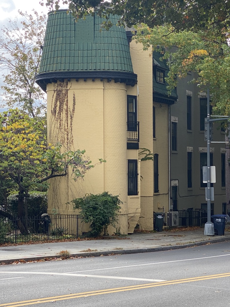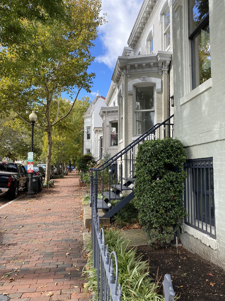 Right after breakfast, we headed to Georgetown – a long (4 miles?) walk that meandered through many different parts of the city from the outer edges of Adams Morgan (where we are staying) through Dupont Circle and embassies to Rock Creek Park and on to the side streets and residential areas of Georgetown (which were very decorated for Halloween). Georgetown’s commercial area seems to have expanded (??) since my last trip to DC. We stopped for a simple lunch of salad and steak tartare at a nice place that we stumbled on. As soon as we came inside the host who seemed frazzled told us that if we order one of the large salads we’d need to wait about an hour. The salad chef just walked out and now the manager was trying her hand at salad making. The host also told us all the problems of staffing up since Covid… not a new or unique story. We then set out to walk back and get to the hotel before the ominous clouds burst. Walking back was more uphill and we were a bit challenged by the wind which was pretty strong and not on our backs. But we made it… giving us a total of more than 11 miles for the day. En route, we stumbled on a demonstration at the Sudanese embassy—very calm.