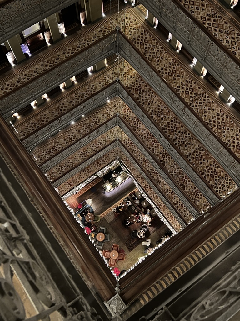 From Queens we set out for Manhattan – to The Beekman – where we will stay for about four or five days. The Beekman is an amazing landmark building from 1883 (built the same year as the Brooklyn Bridge). The Beekman (not to be confused with the Beekman Towers which is located in midtown, is situated in the financial district, close to City Hall. It was one of the first skyscrapers built in Manhattan and has an open atrium that goes up the full 10 floors and a pyramid-shaped skylight at the top. An adjacent building was constructed in 1890. Originally, the building housed law offices and other professional activities and it was known as Temple Court. The building eventually became run-down and closed for several decades until a developer refurbished the grand spaces and turned it into a hotel around 2015. It’s truly a grand old building with fantastic public spaces. The hotel rooms are small but fine and every time you leave your room you’re facing these incredible spaces.