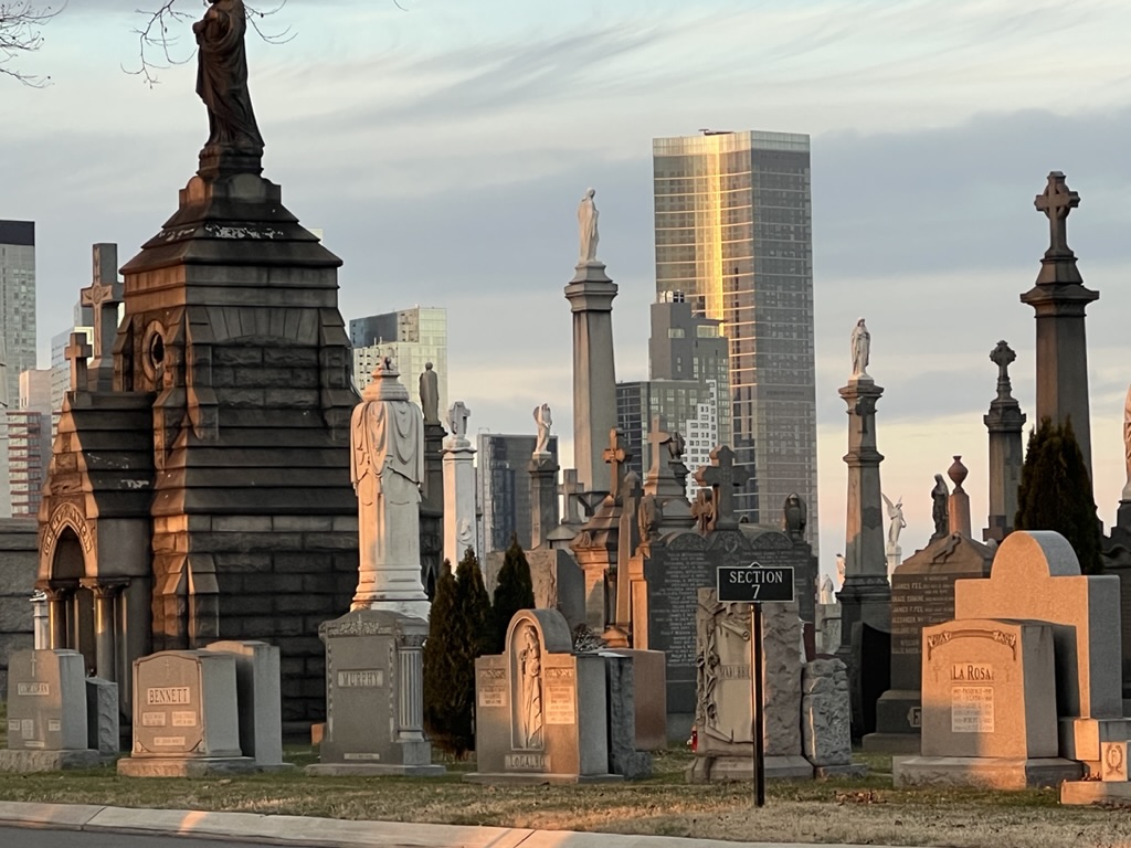 From there, since we were on a mission, we went to Queens to the Catholic cemetery where Mike’s mother is buried. Calvary is huge and the last time we went we couldn’t even find the grave,. But this time, Mike had done his homework and we located the space. And while my parent’s cemetery has faced vandalism and other acts of antisemitism, Mike’s mother’s cemetery is quite pristine and home to many deceased NY politicians as well as gangsters. The differential between the wealthy and the poor is obvious with very large monuments that almost blend into the distant skyline of New York City and others (like Mike’s mother) who are have very very modest monuments and are even buried in stacked fashion (something I had never heard of before knowing Mike.