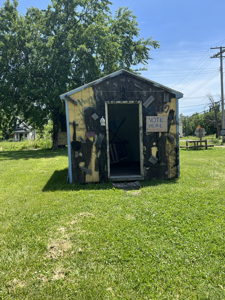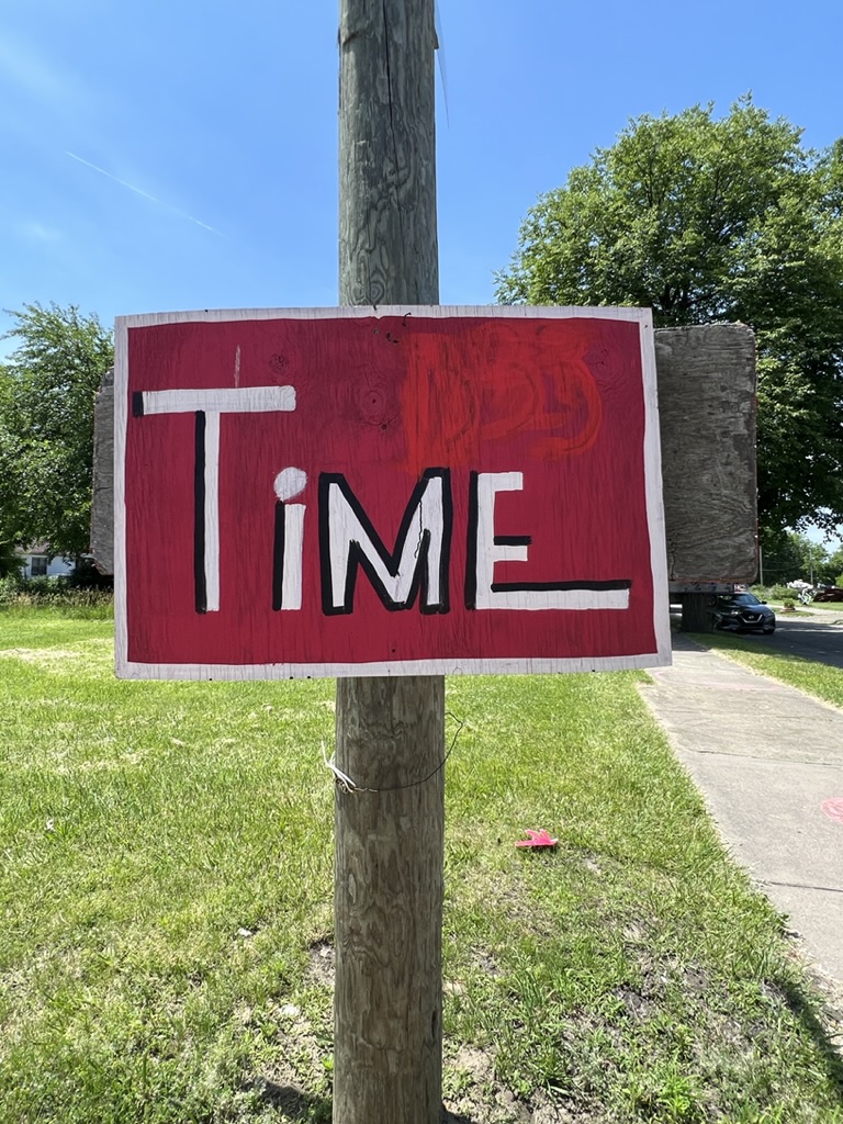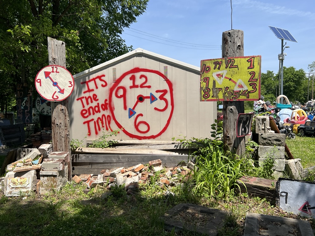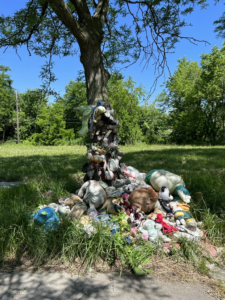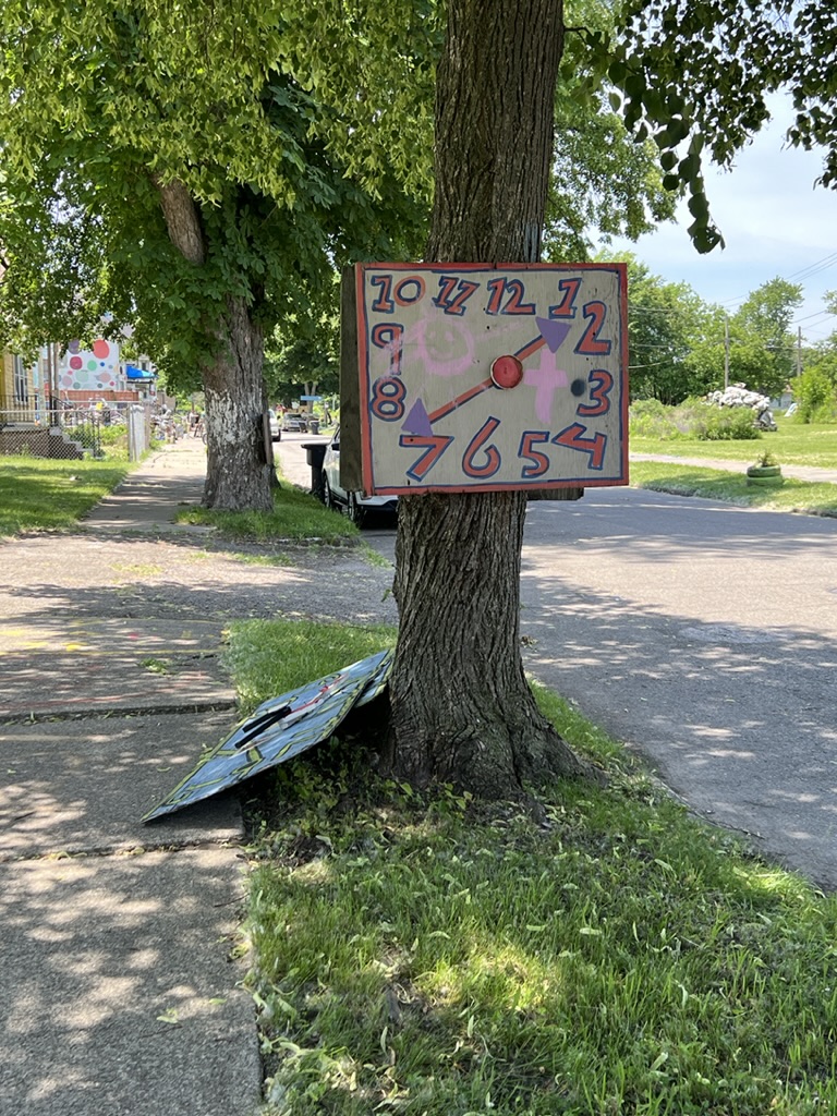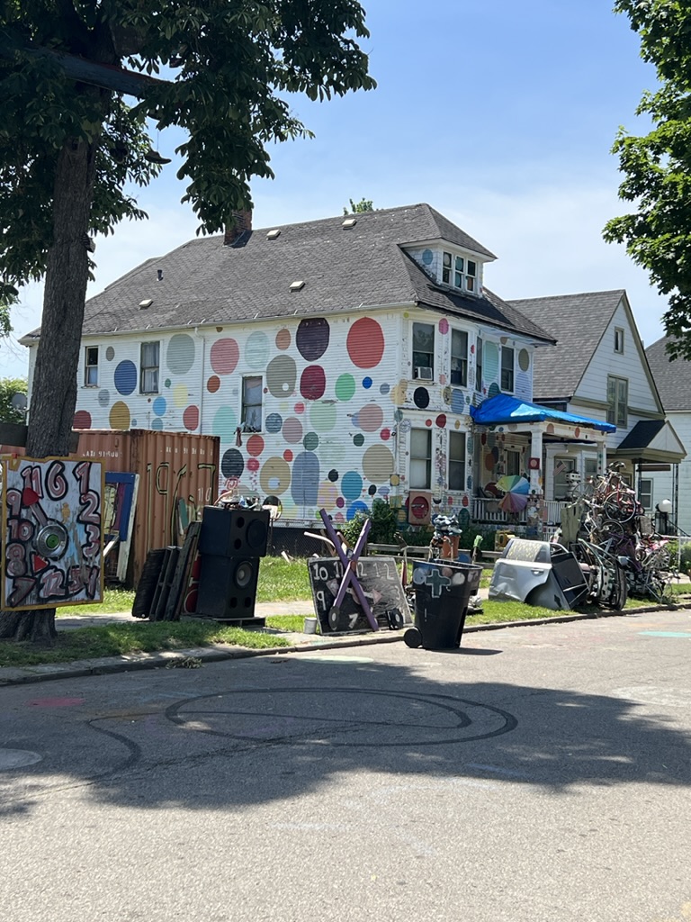 Then we headed to see the “Heidelberg Project” (named thus because it is on Heidelberg Street). It’s an outdoor art project that stretches about six or so blocks and includes the remaining houses in the area, the sidewalks, and the linear green space that spans the distance on the other side of the houses. It’s in the McDougall-Hunt neighborhood on Detroit’s east side (a little north of the city’s historically African American neighborhood. It began in 1986 when Tyree Guyton (along with his wife) began to address (in their own way) the blight of their street and adjoining streets. It’s part political statement about neighborhood deterioration and abandonment. According to the story, Tyree returned from the Army and was shocked to see the condition of his childhood neighborhood which had been declining since the 1967 riots. He said it looked like “a bomb went off.”