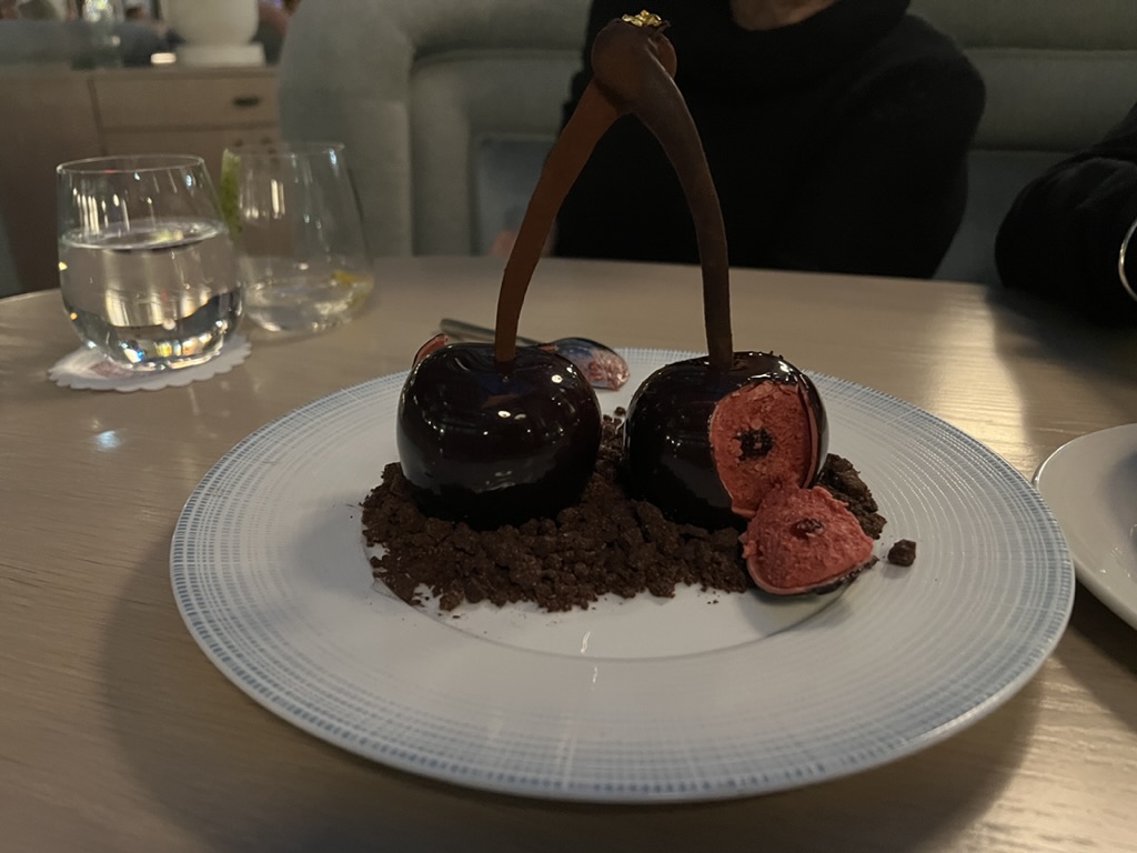 And for dessert we shared a raspberry brulee and a cherry mousse that was stuffed into an enormous chocolate cherry that also had almond cake in the center..