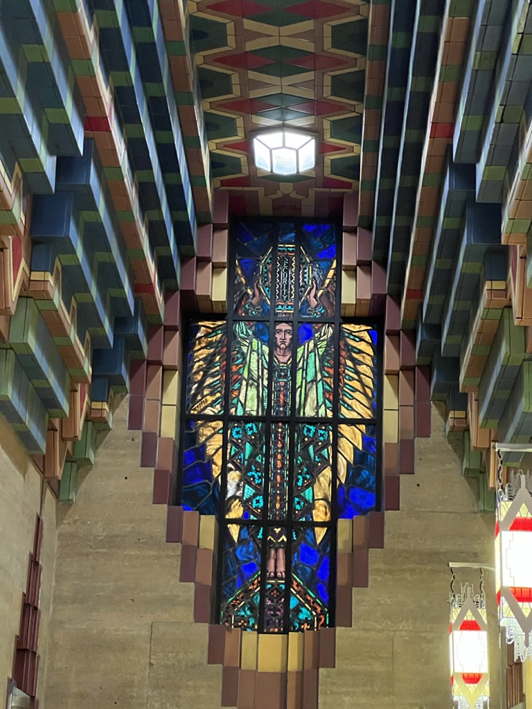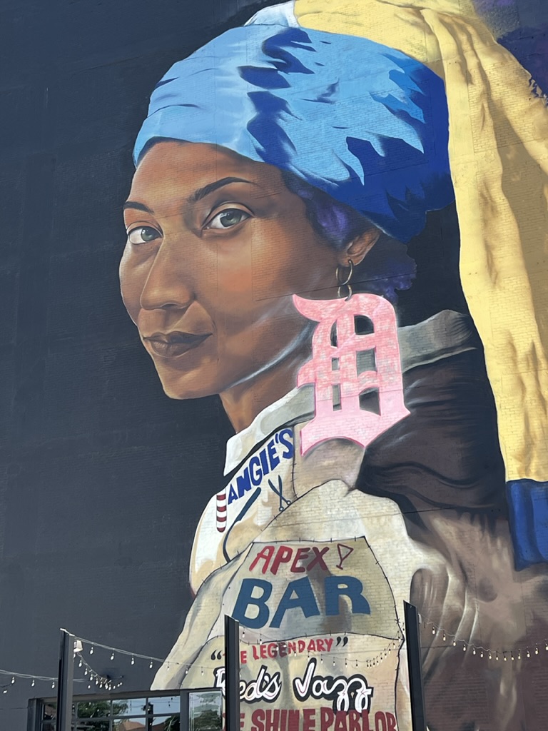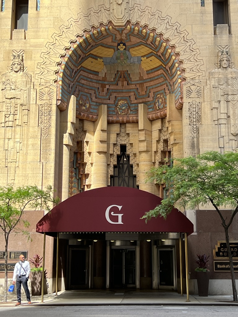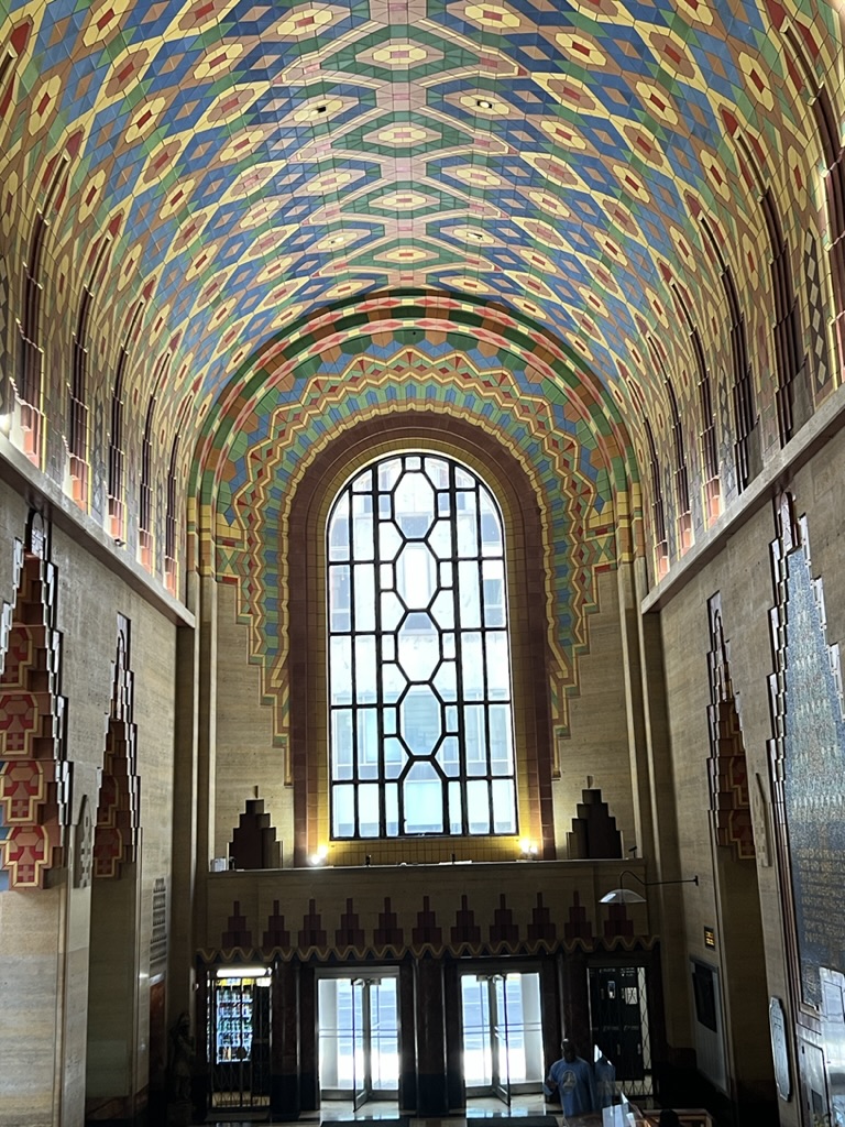 Then we headed to Corktown, the oldest neighborhood in the city—where we had a great pizza and chopped salad (at prices that were probably the norm in the Bay Area about 25 years ago). We strolled a bit and then went to see the Guardian Building – built in 1928 and a bold example of Art Deco architecture. At that time, Detroit was a worldwide industrial center and a wealthy commercial hub. The Union Trust commissioned Hinchman and Grylls to design their headquarters; Wirt Rowland was the architect in charge. The building was completed just as the stock market crashed, but it was saved by some investors. I will send a bunch of photos and some more information on this in a separate note.