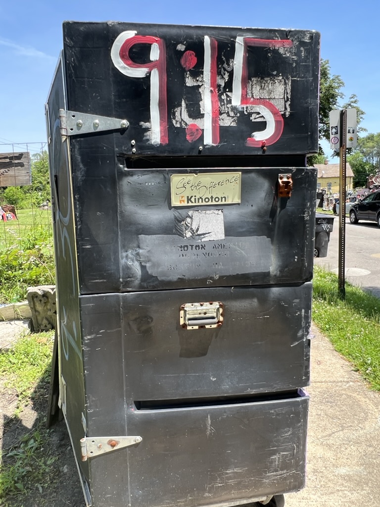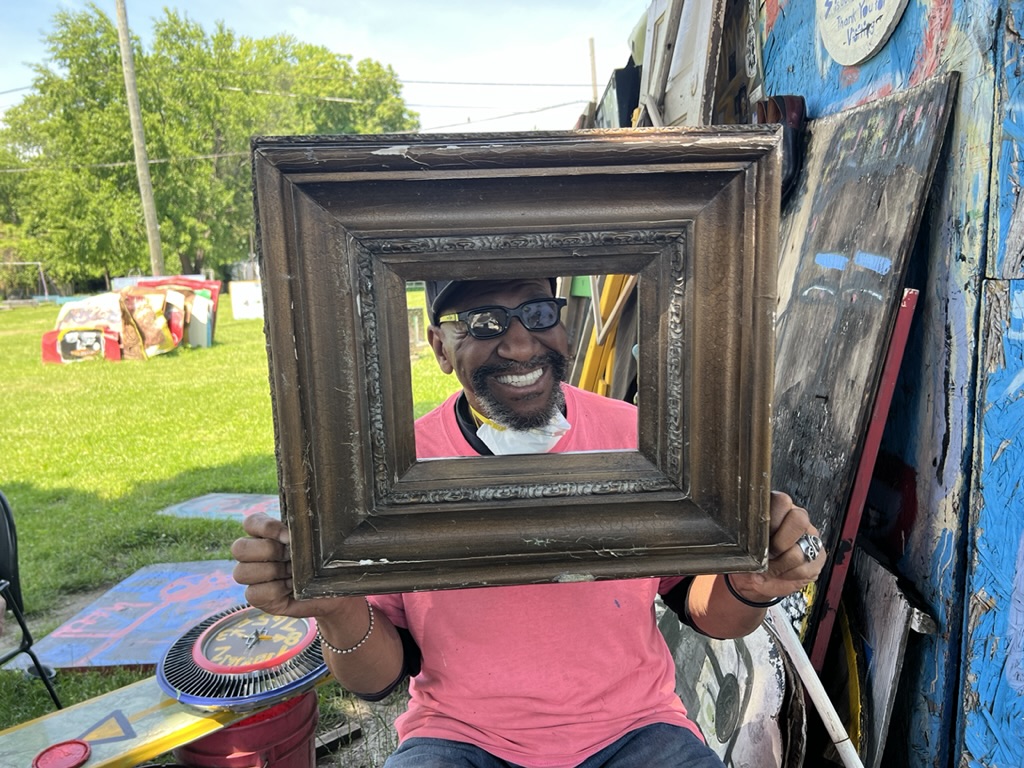 He began by painting several houses on the street with bright colored dots and then started attaching found or salvaged objects. It became his world and his work… and it grew like Topsy, from one street to the next. And across into the park open space. The “art” includes piles of shopping carts; a wall of shoes; a little mountain of stuffed animals; and more. Strangely it changed from a neighborhood where people were leaving and afraid to be out in the dark to a place where tourists were coming to see the “art.” Guyton worked on the Project with kids in the area. He and his wife gave lectures and art workshops locally and across the country. He sees it as an indoor and outdoor museum. We met Tyree (who seems to always be on the street) and got a bit of his local wisdom.