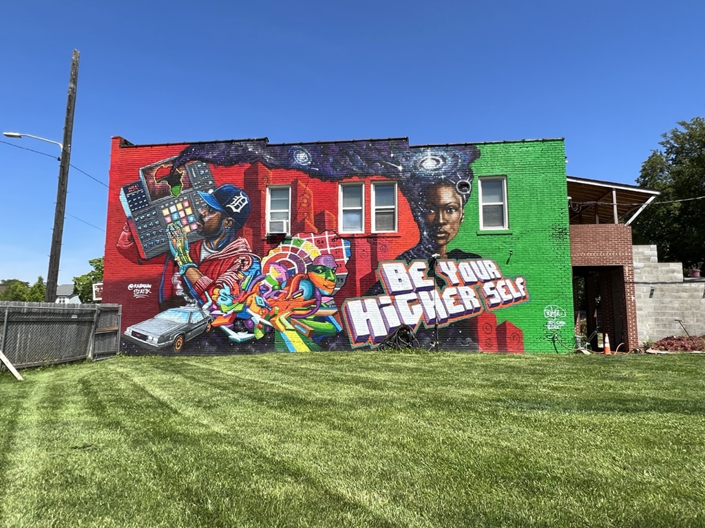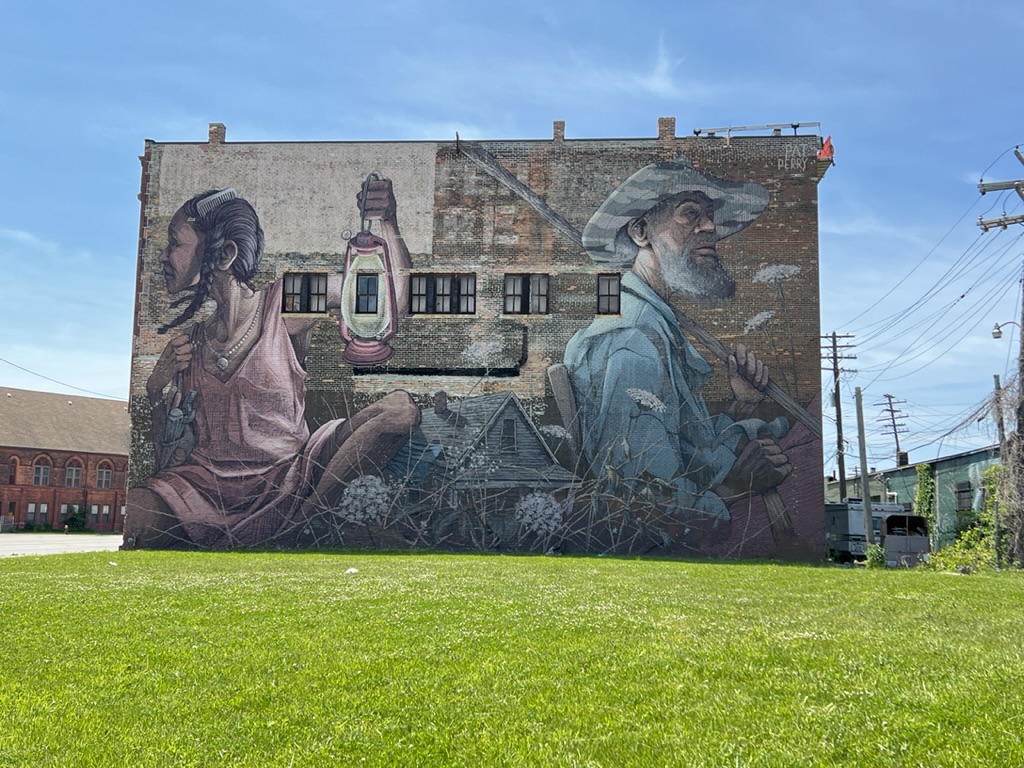 As we roamed the neighborhood we stopped to admire some of the many huge murals on sides of buildings and houses. At one, we met the owner—a 55-ish year old African American who was mowing his lawn. We asked about the origins of the mural, who paid, who selected the artists, what responsibility he has regarding upkeep and what responsibility the city has (they paid for the murals). He was a bit surprised to hear that two of us were from California.