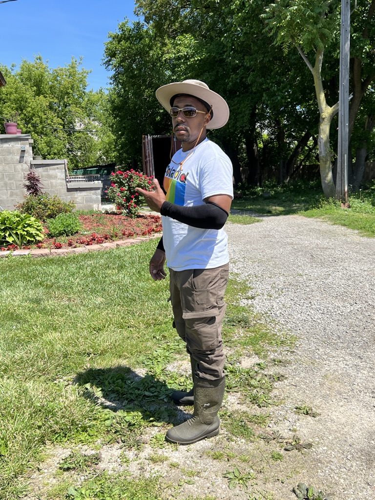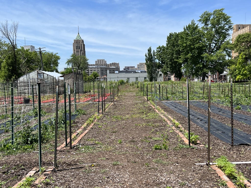 We set out after having breakfast in the Apparatus Room of the hotel (where they used to keep all the fire truck gear) – simple “overnight oatmeal with almonds and blueberries. Then after a lot of discussion about what to do today, we headed out to see an urban farm that was established a few years ago in the North End of town which is predominantly African American and where there had been a lot of abandonment, vacant lots, and diminished population. The urban farm stretched about two city blocks and was apparently spurred by some students from University of Michigan, Ann Arbor a few years ago. It seems to be thriving, complete with irrigation, storage sheds, and some places to sit and eat the produce or relax from working in the farm.