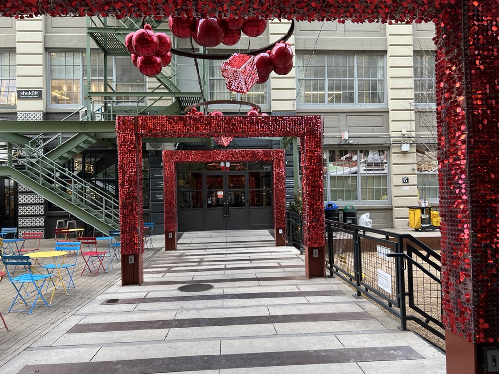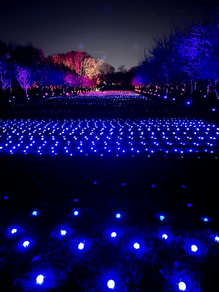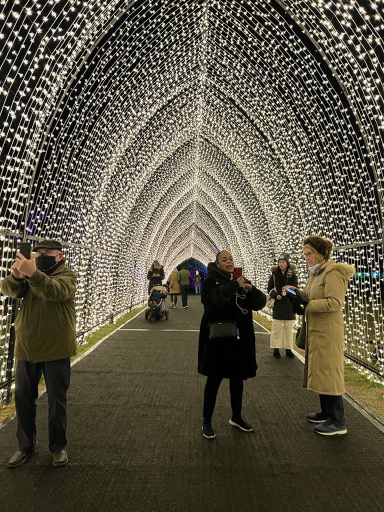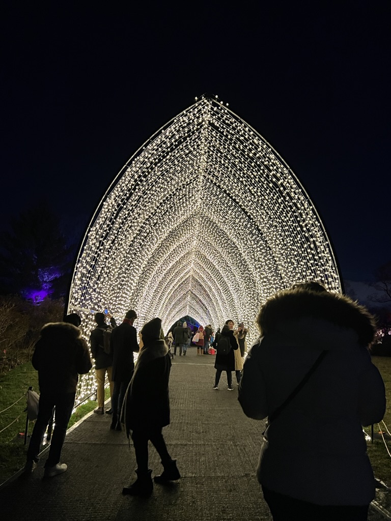 From there, we headed to the Botanical Gardens to see “Lightscape” – a winter nighttime transformation of the gardens through light and sound. They’ve set it up as a one-way, one mile walk so that you enter on Washington Street and exit on Eastern Parkway.. The installation meanders throughout the large area of the gardens with not just lights but symphonies of sound and illumination. In one field (probably the size of a football field) lights literally “move” and “float” and change colors as they cross the ground as if to emphasize the music playing in that area. Ever-changing, it was pretty mesmerizing.