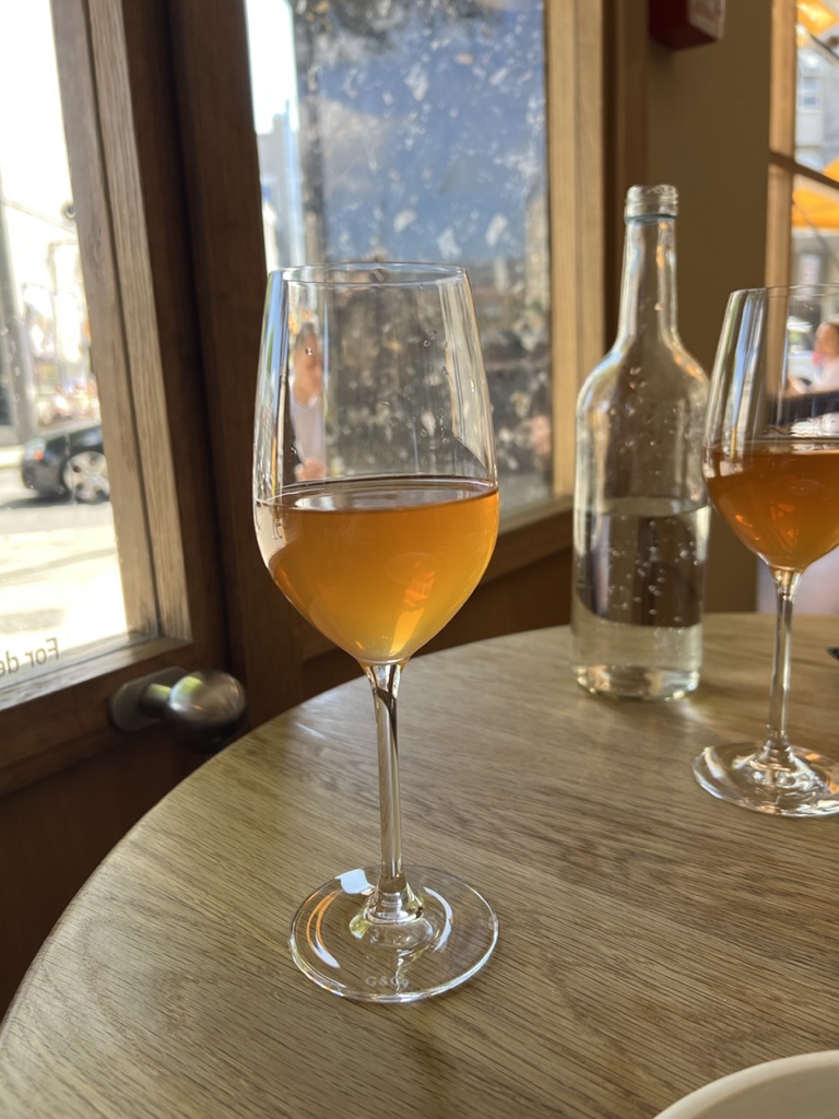 We had several small plates and ‘orange wine.’ I’ve never seen that on American menus—it’s made from white wine grapes and as I understand it, the grapes skins are not removed as they are in typical white wine production and the skins stay on for weeks or months. It’s an organic non-fermented wine. It’s very dry and also pretty strong, but tastes good.