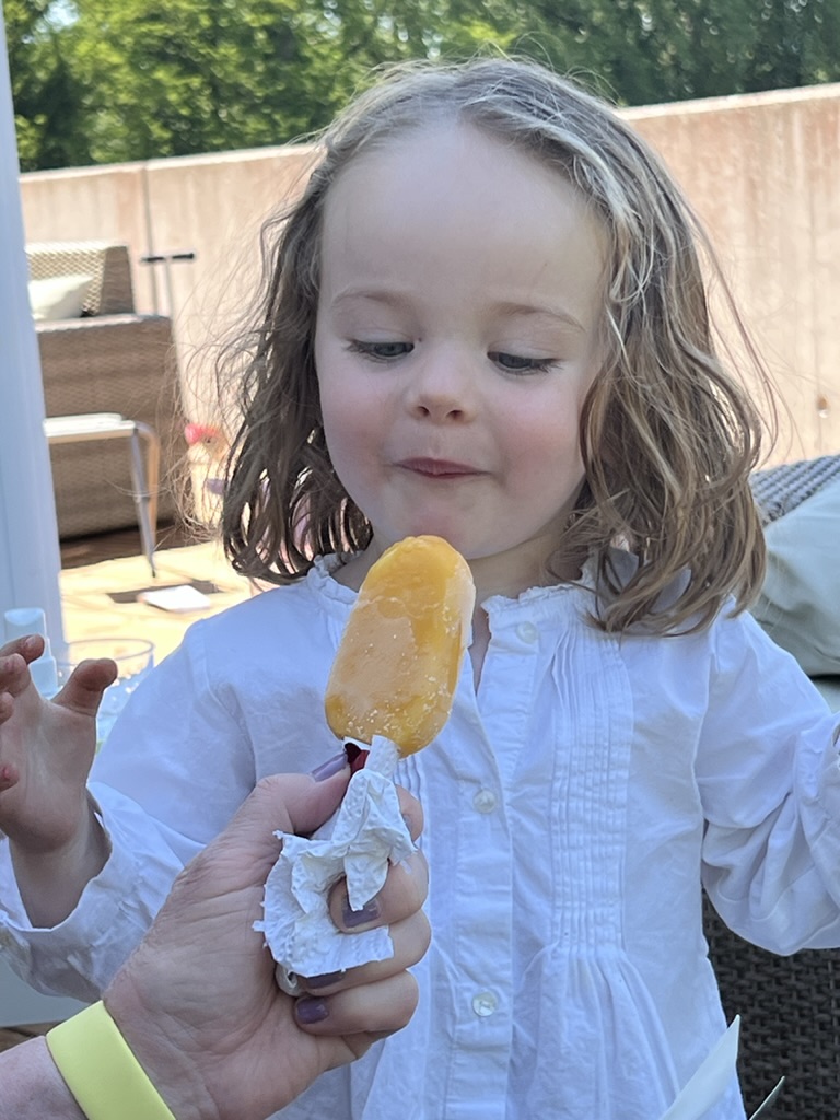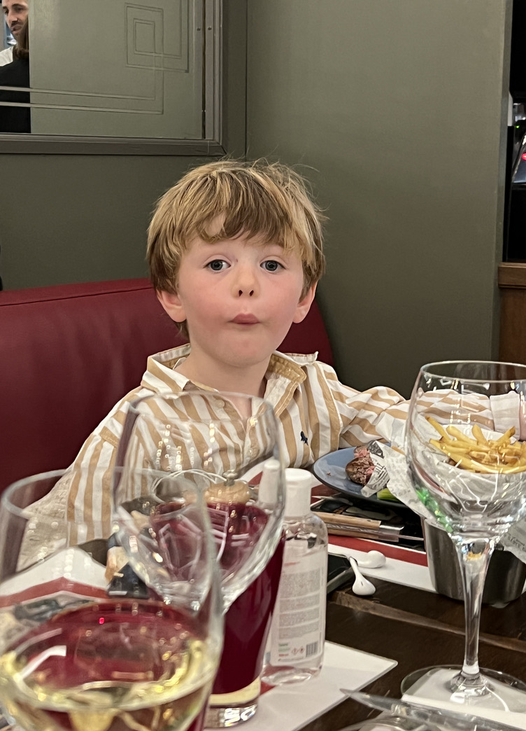 Low key day that began with a slow stroll to meet Julia and Julian and Louis (who had just completed his pony lesson) at the Rive Halle, a market hall with 23 different vendors—each displaying yummy specialties. Among others there is a butcher, a poultry stand, a pork butcher, a baker, a cheesemaker, a fruit and vegetable vendor, a chocolatier, a pastry chef, a fish vendor, some caterers (or kiosks with ready-made goodies), a florist, and more. Within the Halle is a restaurant: Bistrot des Halles, which is where we had lunch. We feasted on several starter dishes including: carpaccio, escargots, a wonderful pate (maybe venison) encrusted in some kind of baked dough and more. We followed this with main dishes including a wonderful ravioli stuffed with crayfish (my main), some amazing cote de boeuf with vegetables, and at least one other dish. Ended with fantastic tarte tatin. I think we downed a few bottles of wine along the way. And then we headed to see Julia and Julian’s new house, and got a tour by Louis. And by then, Ella was up from her nap so it was a full house.