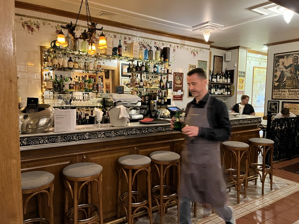 After spending several hours at the house, we headed back to the hotel and set out for dinner by ourselves. We hadn’t booked anything and didn’t want to eat at either our hotel or any of the nearby hotels so we ventured across the bridge and ate at a little place called Au Coin du Bar. It’s an old- fashioned bistro complete with bistro furniture in a charming small space. Seems like a place for a lot of locals who hang out at the bar. We shared two dishes which were quite good and upped our consumption of meat for the day to about what we normally consume in a week! And our wine consumption is also topping the charts.