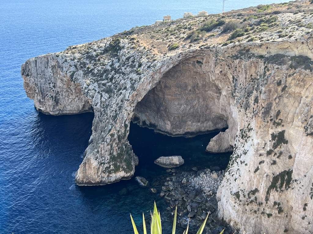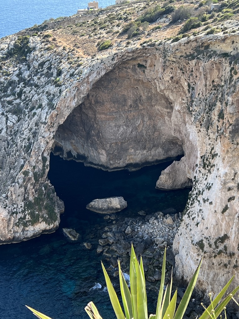 From Marsaxlokk we headed to Ghar Dalam, Malta’s oldest pre-historic site, but it was closed on Mondays—so maybe tomorrow. Mike was very disappointed not to see the prehistoric bones of dwarf elephants. We then headed to see the famous Blue Grotto. I was navigating on the iPhone Google Maps and all was well until we hit a road that was closed due to construction, requiring us to back out and figure out an alternative route. We wound up on some extremely small roads—about 9 feet wide (two-way roads) with 6’ stone walls on either side for many miles; the road we went through vineyards and teeny towns, eventually arriving at viewing points to see the amazing Blue Grotto– sea caverns on the south east coast. The location of the caves is responsible for the seawater reflecting shades of blue on the cave walls and ceilings.
