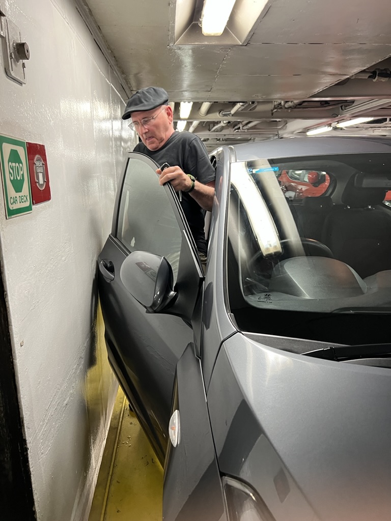 In conclusion, we made it back, we found a parking garage, we walked from the car to the hotel, we made it to the restaurant (Grain Street) just in time to order before the kitchen closed, we ate and walked to the hotel. And here I am to tell you my tales. Oh, the photos of Mike squeezing into the car is on the ferry. They guided us to park really close to the wall and then Mike couldn’t quite get out of the car,. And then back into the car. But, alas, he managed to will himself to be skinny.