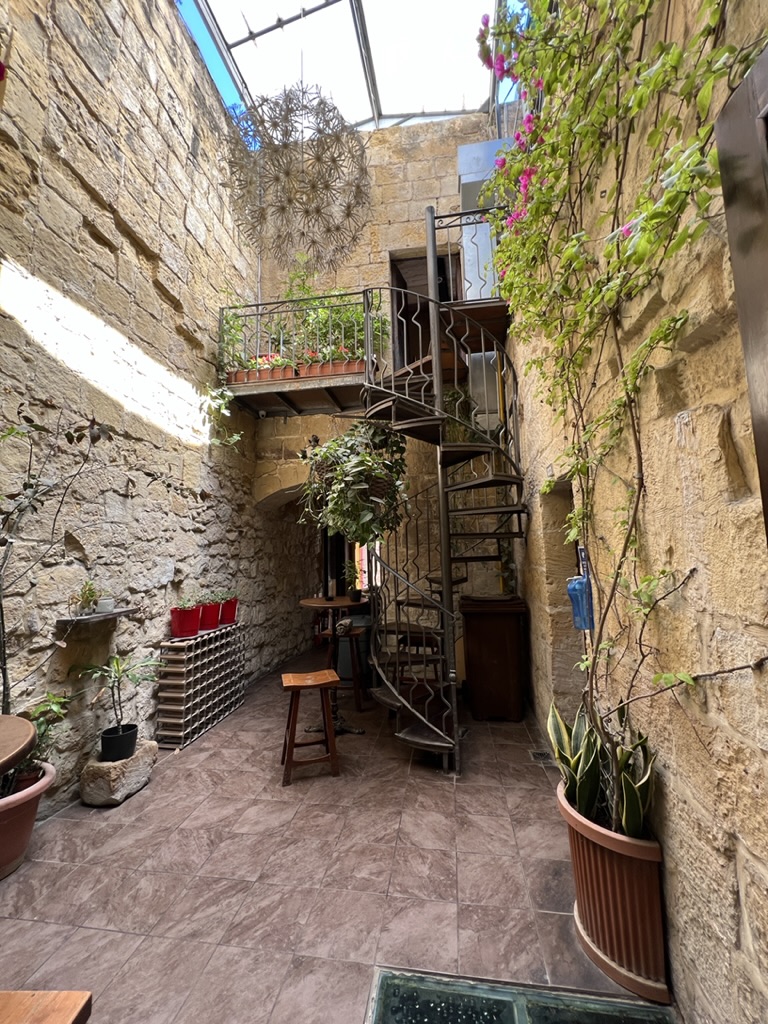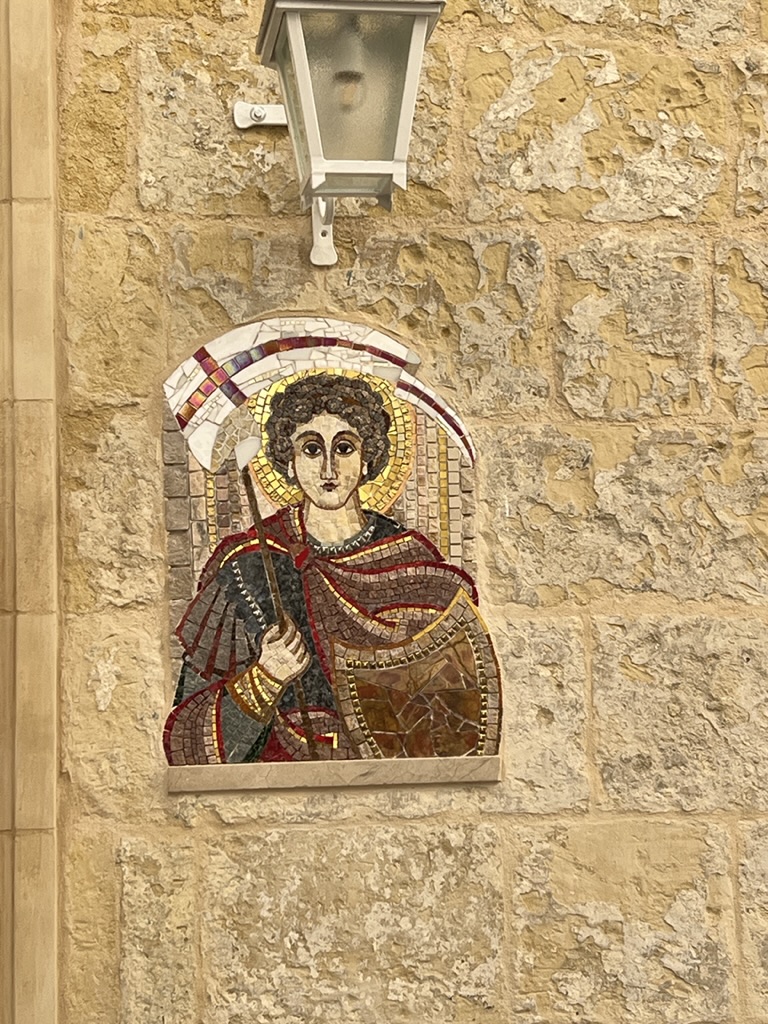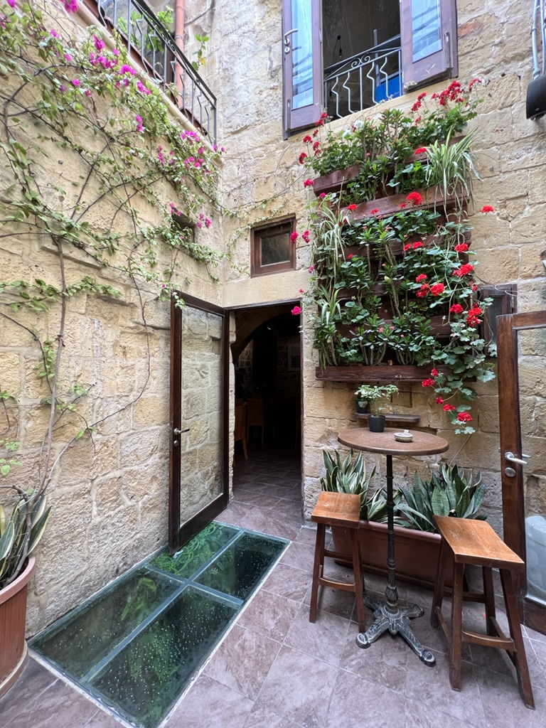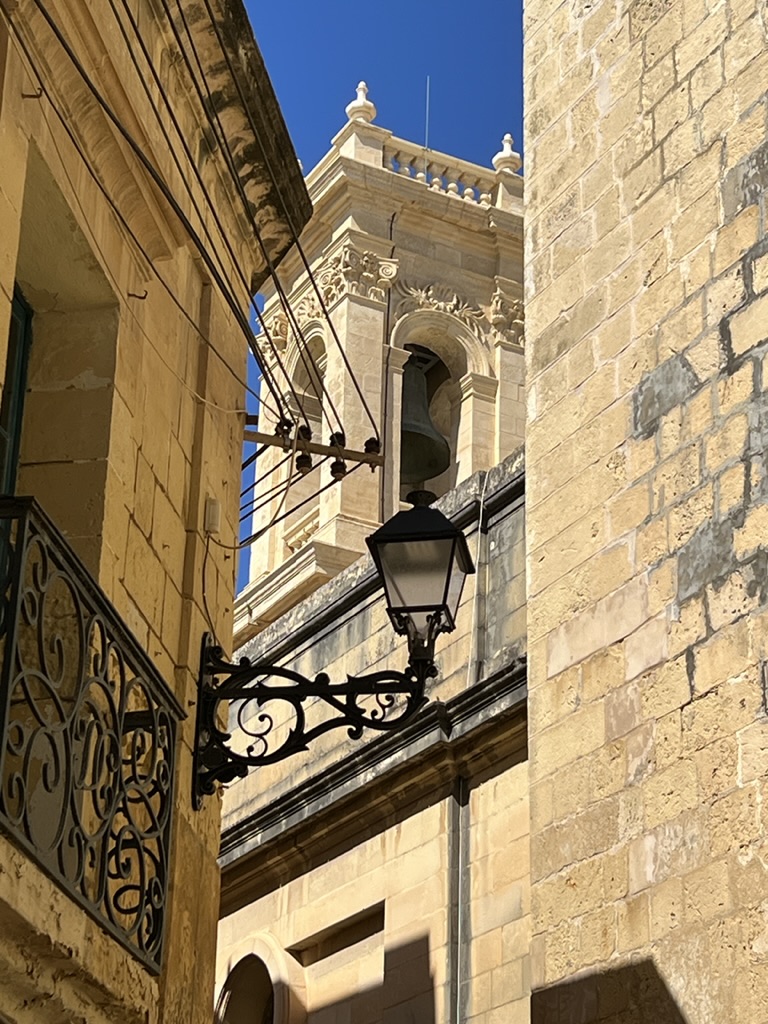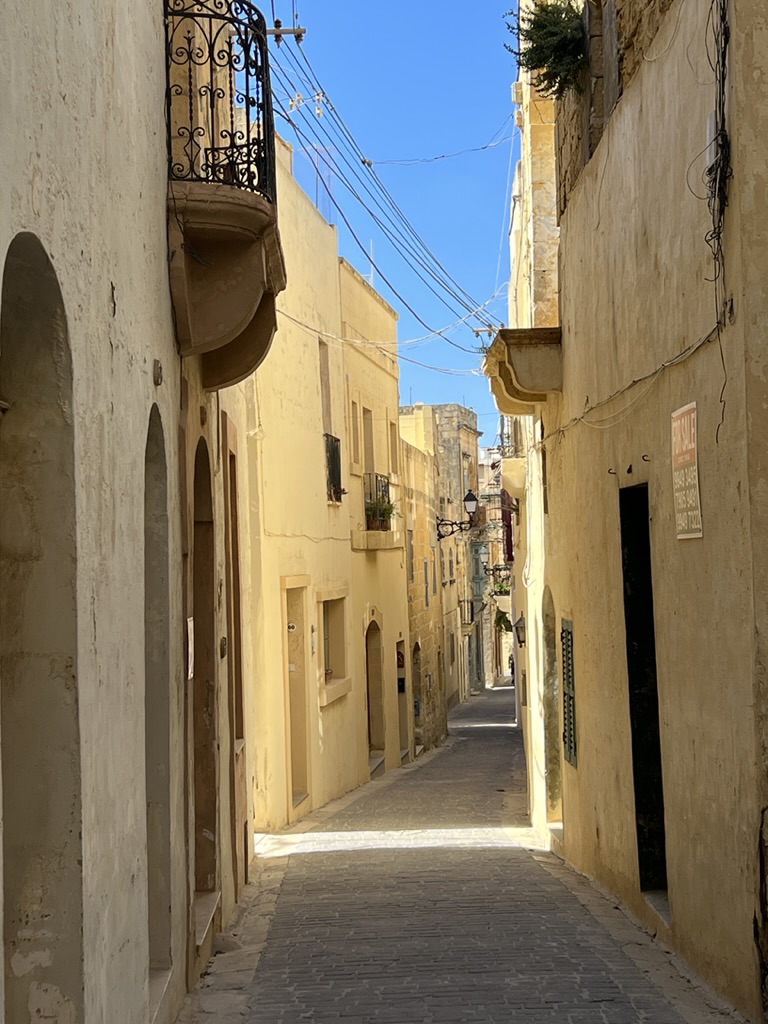 Enroute to the ferry we came upon a little promenade of old Mustangs—one following the other on the highway. Maybe some kind of club outing. The ferry was full of families with young children, and I did spot a woman in a string bikini wearing a “cover-up” over the bikini, but the cover-up was totally sheer; Mike seems not to have seen this. Anyway, we managed to make it to the restaurant—Maldonado’s Bistro—exactly at 2:00 and they could not have been nicer, and the food was great. All locally sourced and some new takes on very traditional dishes. Malta (and Gozo) is famous for a particular kind of sheep’s cheese and they are pretty creative in how they use it. We had chicken that was raised on Gozo, local Gozo wine, house-cured olives, and a ravioli dish that used the local cheese and was laden with all sorts of wonderfully fresh herbs that were growing right outside the window. At the end, the waiter presented us with some wonderful limoncello that was also house made—apparently a Covid project that took all of Covid to perfect.