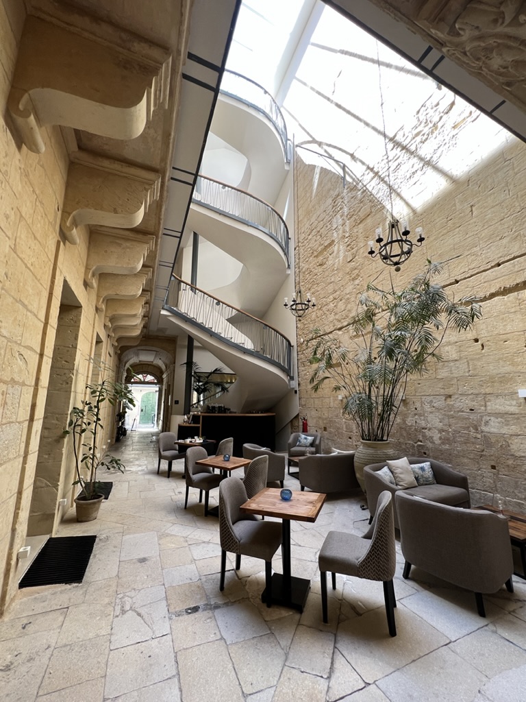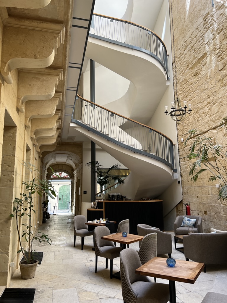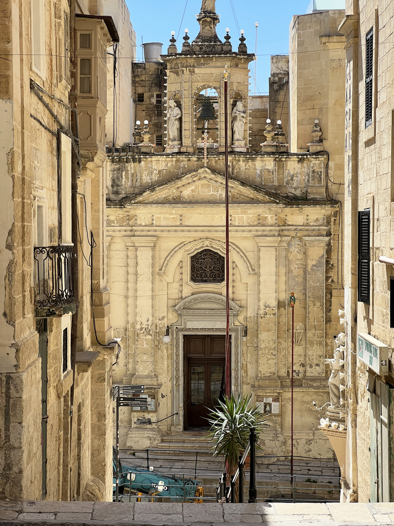 After breakfast at out little hotel –66 St. Paul’s, a delightful and well appointed small hotel in the thick of Valletta – we set out to walk and see the town (city). The hotel is set inside a 17th century palazzo, and has been modernized into a wonderful set of 11 or so spacious rooms with great bathrooms and a pleasant lobby space. Our room also has a balcony from which we can see the sea and the tops of some interesting nearby buildings.