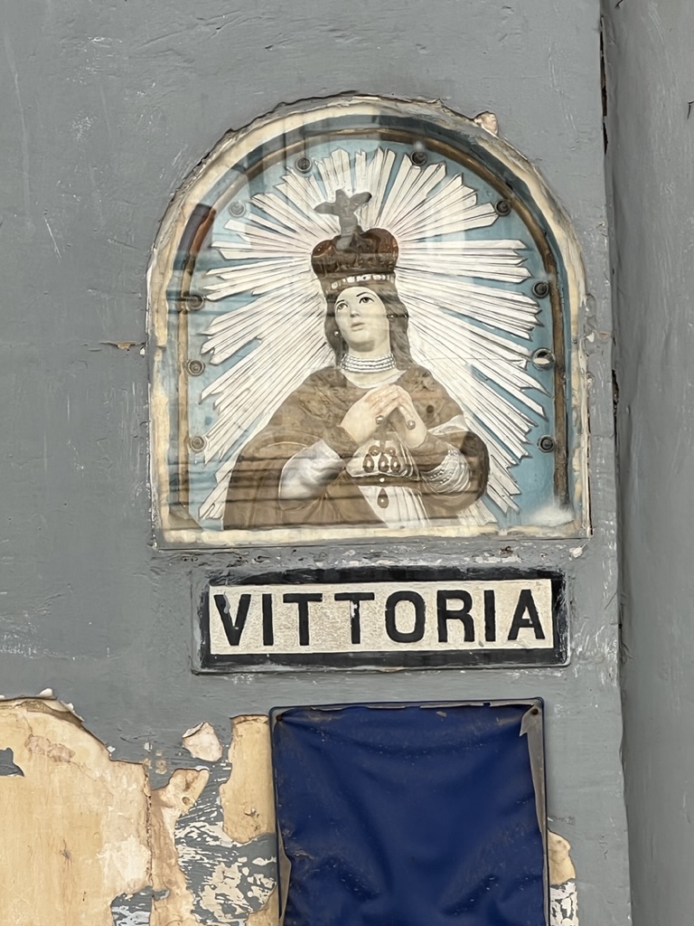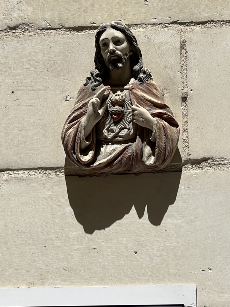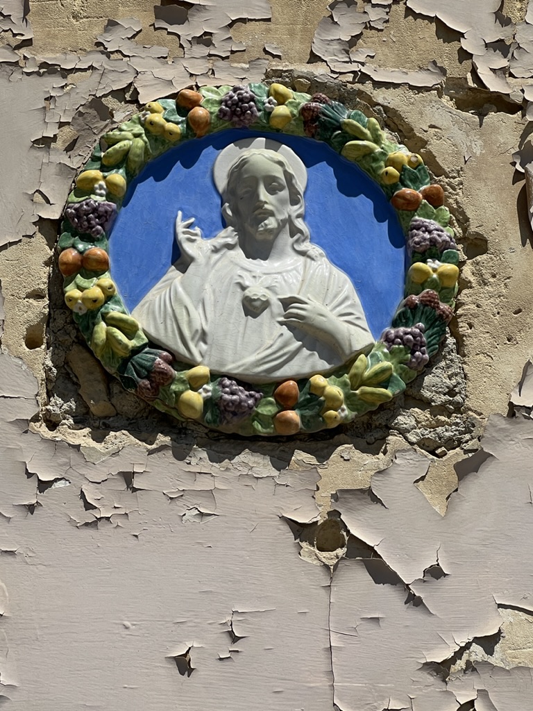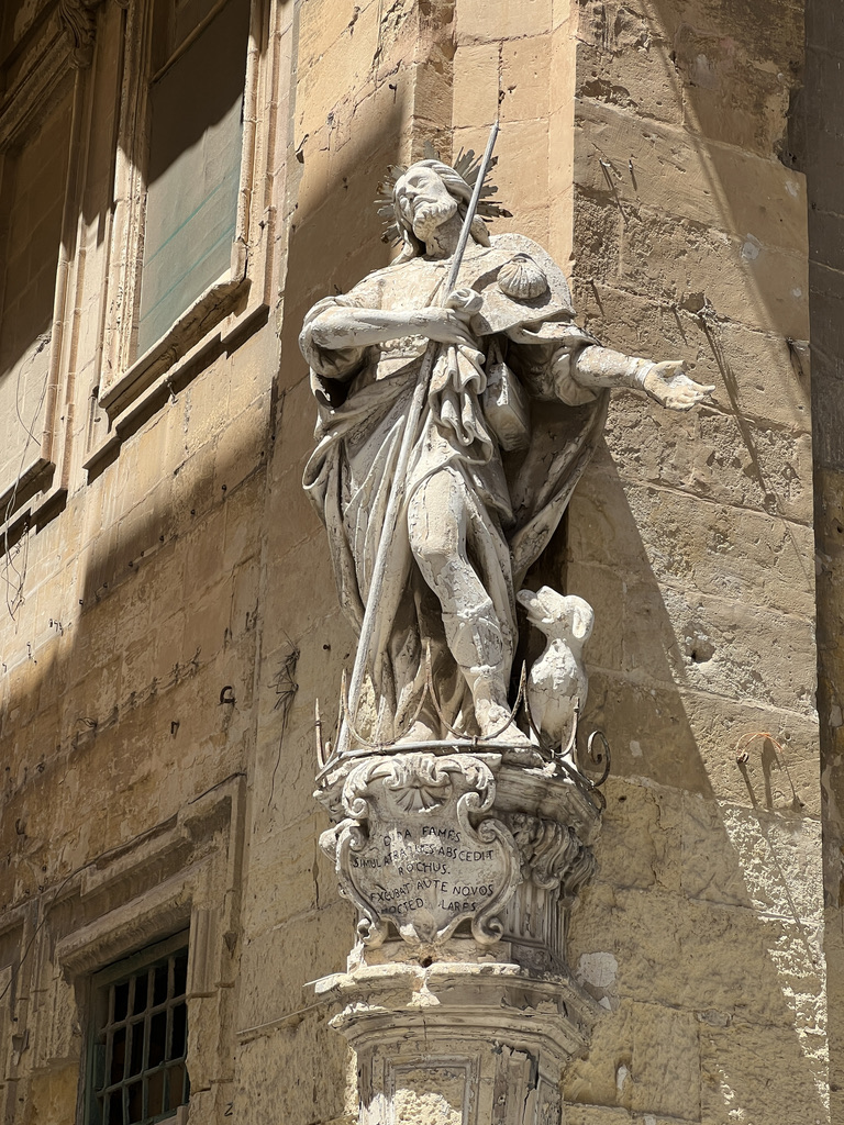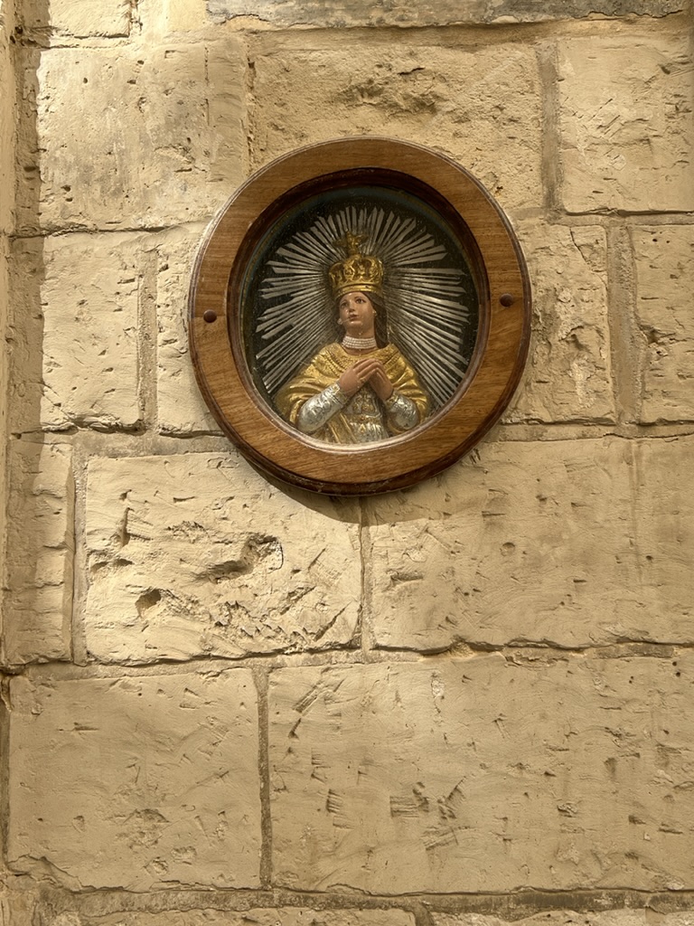 We strolled the narrow streets that change in elevation and have tons of steps that rise and fall depending on location. Throughout the walk, music is wafting in the background—Classical, Beatles, punk, and more from the open windows and radios of residents and contractors. We walked about three miles by then and tried to stay on the shaded side of the street. After a brief stop for a light lunch, we headed to the ferry which involved us getting in the middle of a wedding (or maybe two weddings—hard to say) that was taking place at an outdoor high-end restaurant and hotel, as we walked to the ferry. We had decided to take the 15 minute ferry to what is called “the three cities.” And then we walked some more… always “protected” by the many, many statues and reliefs of saints throughout the area.