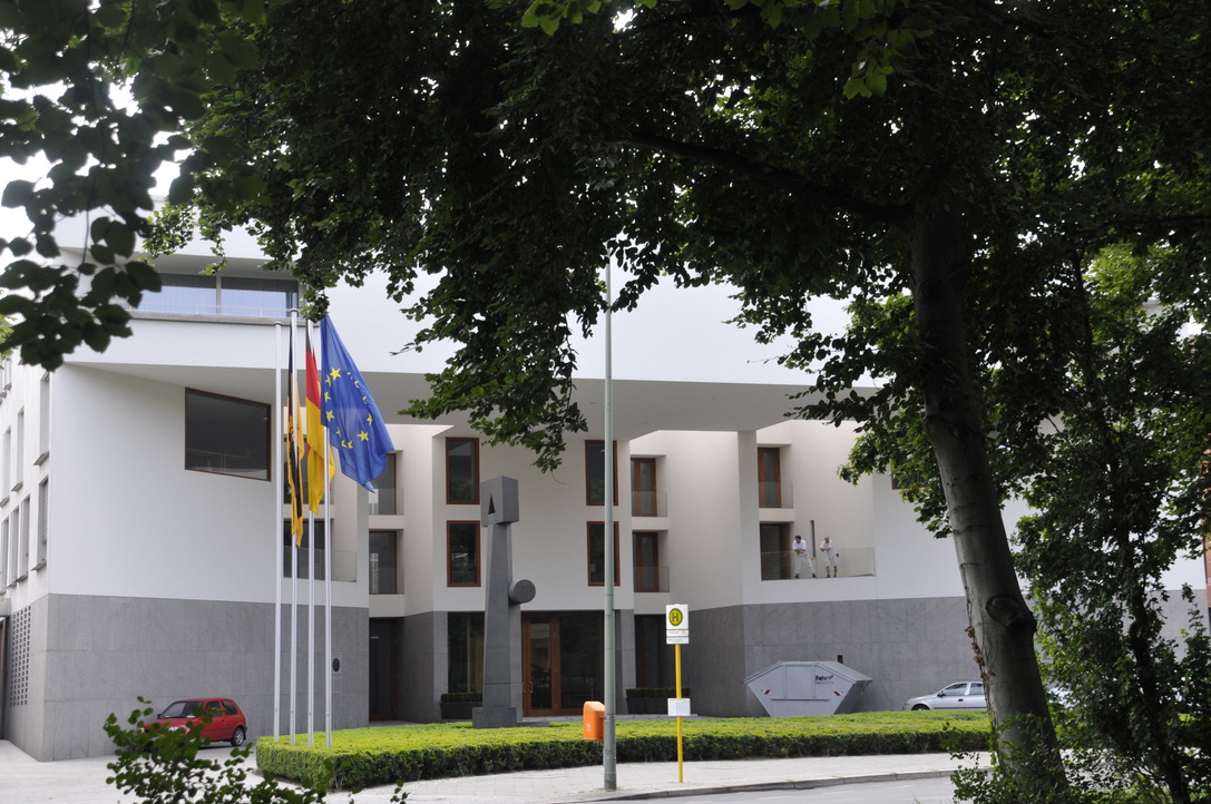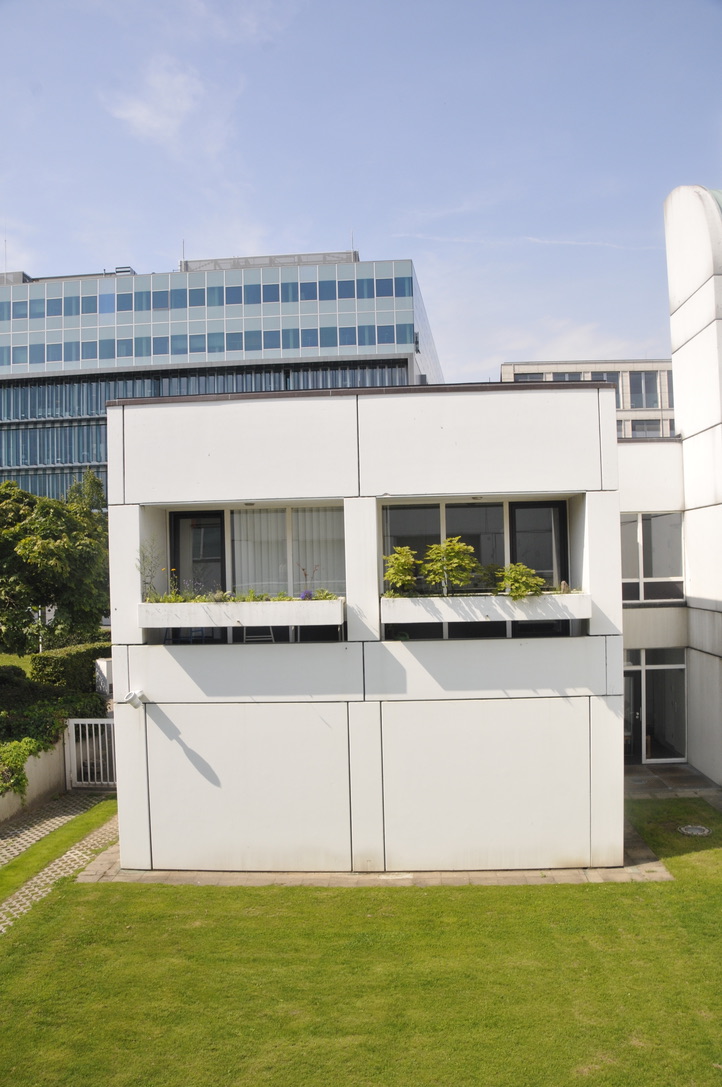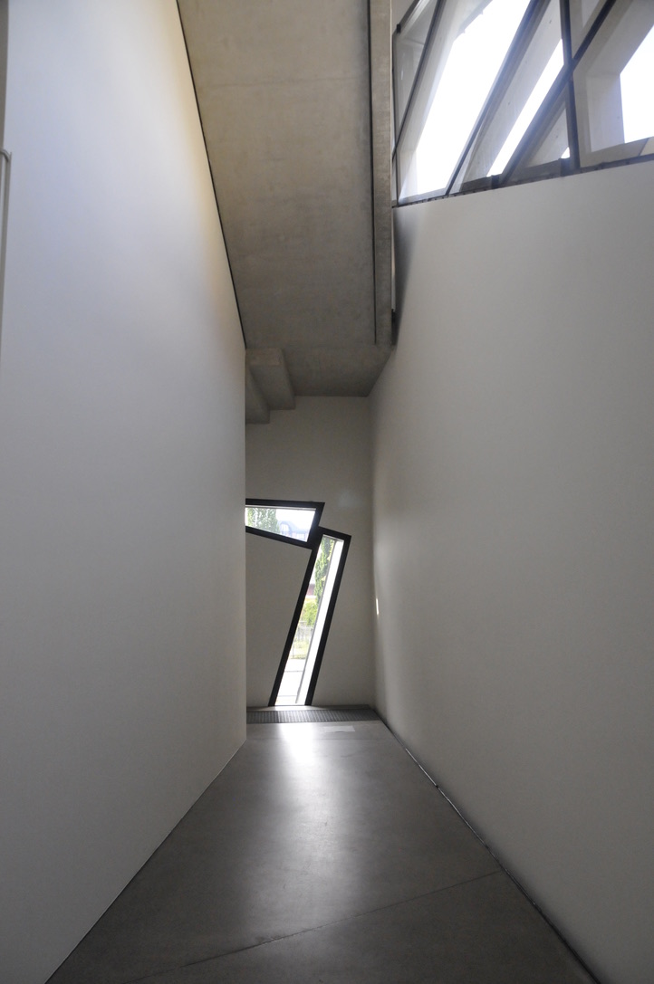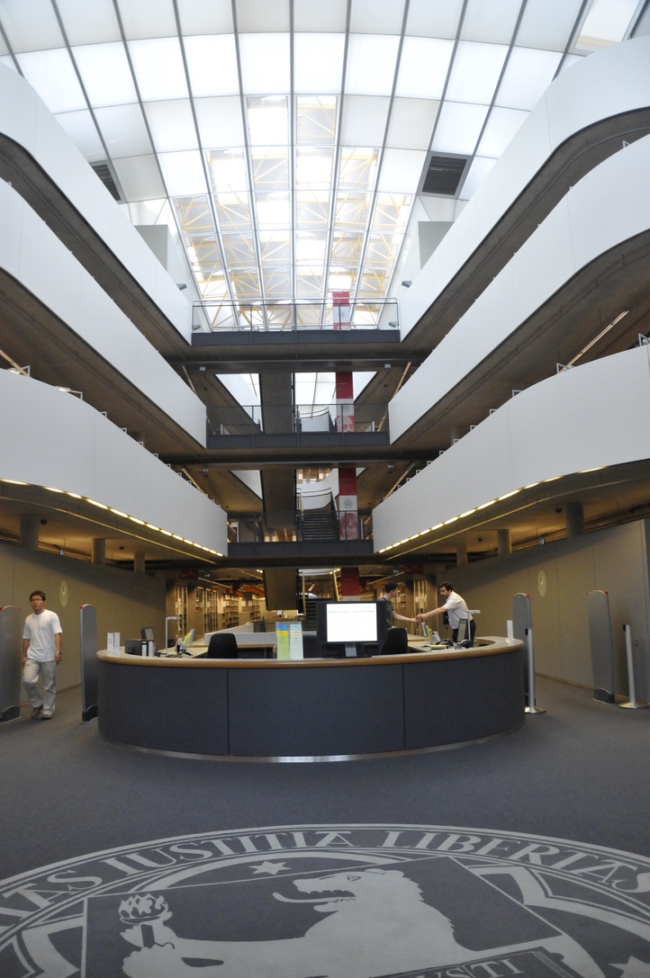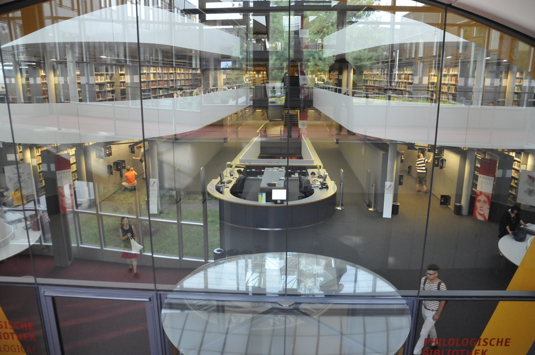 OK.. from there we were headed to the Free University mostly to see the Philological Library… We opted for a taxi because it was about 20 km away, and the UBahn (rail) was not as close as we hoped.. and the heat was gaining. The University is located in a truly lovely part of Berlin… wonderful houses, tree-lined streets. We entered the University which is an interesting “matrix” intended, I believe, to set an infrastructure into which other buildings will fit. But as with all matrices, there is probably a desire to burst out of the grid… so in 2004 Norman Foster was commissioned to design a library that would combine 10 pre-existing libraries and assorted conference rooms. The result is a really stunning solution, which unfortunately we were not allowed to photograph! Except for the very few sneaky shots I was able to do… But it was great to see and if you want to see photos go to http://www.fu-berlin.de/sites/philbib/architektur/galerie1/index.html.