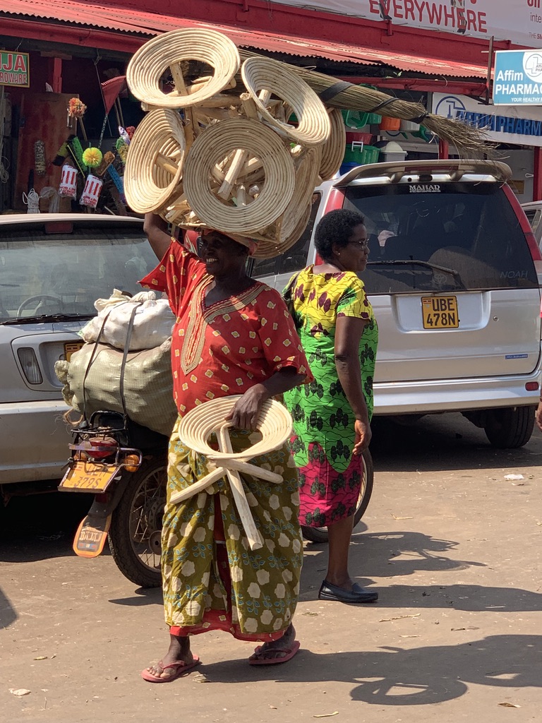 We headed out fairly early – by taxi – for Nakasero Market located in the center of Kampala. It’s huge and mostly about food. It’s divided into two sections – an open area where sellers are located under literally hundreds and hundreds of well-worn umbrellas to protect themselves and their produce from the sun (and rain). The other part of the market (which stretches for several blocks) is focused on hardware, clothing, and miscellaneous items. We strolled for about 90 minutes amid the vendors and customers. We were literally the only tourists there. It’s a body-to-body experience, squeezing through tiny aisles along with shoppers, workers carrying trays on their heads, workers carrying huge sacks of flour or rice or whatever.