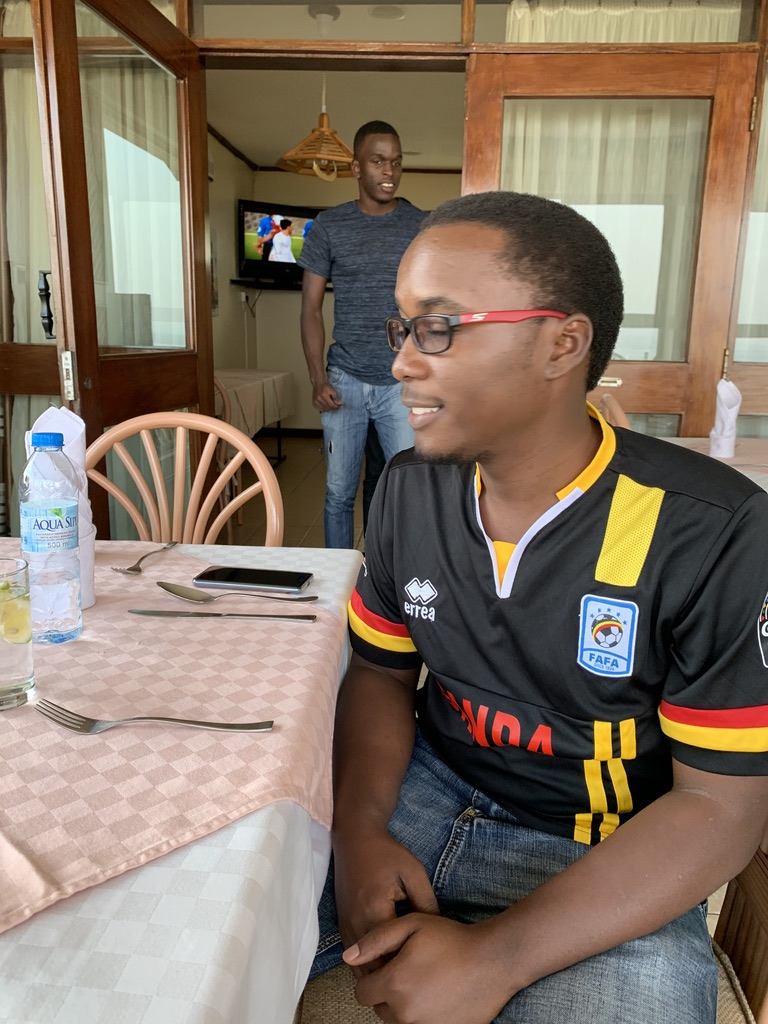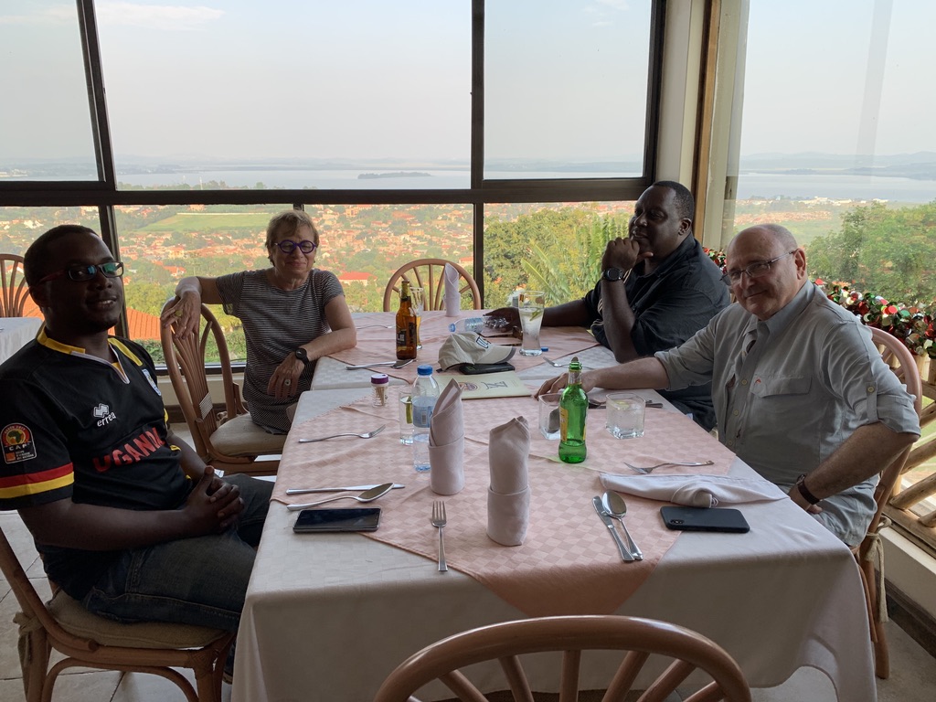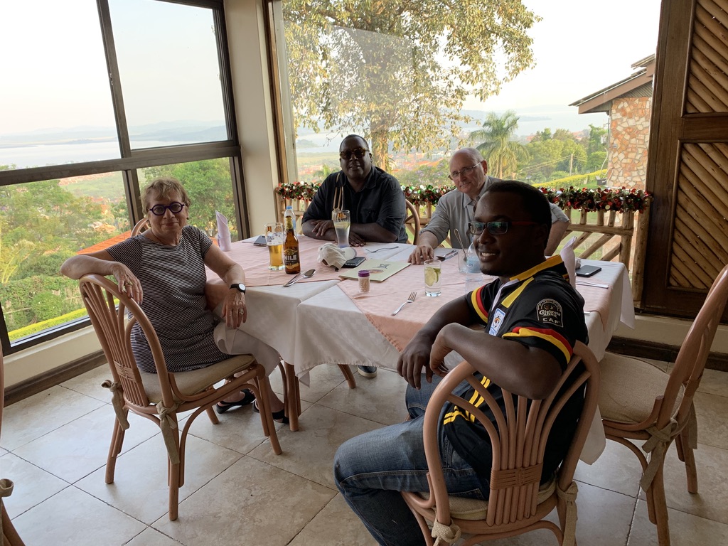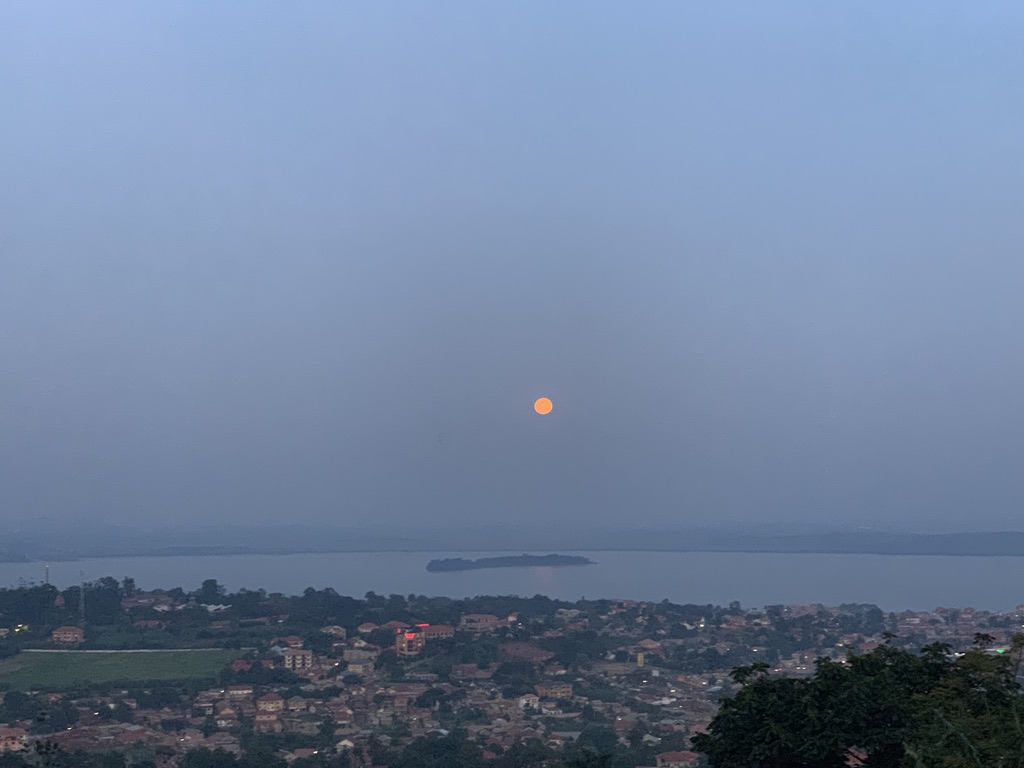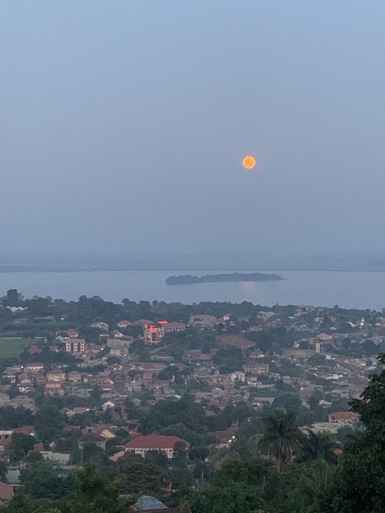 With Martin driving (and an unexpected guest for our drive and dinner – Elliott, a young cousin of Martin (Elliot’s aunt is apparently one of Martin’s father’s several wives) — we headed for a view of Lake Victoria and also dinner. Along the way we had more time to discuss his years in the US (about 12) and his sense of racism in America. He was quite astute about the problems and the history of racism in the states. Eventually (thousands of potholes later), we arrived at Cassia Lodge where we had spectacular views of Lake Victoria and a wonderful sunset with a nearly perfect full moon. After a nice dinner, we bid Martin farewell and headed back to Humura.