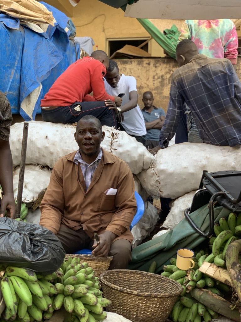 We walked the thin line of wanting to see everything and to photograph and not wanting to get in the way of the people who really needed to be there to work and to shop. Most people were friendly; some didn’t want their photos taken. Some tried to speak Italian to us, thinking we were from Italy. (So now we’ve been recognized as Italian, Icelandic, French, and Russian; never once as Americans). Several people (when I stopped to chat and photograph) were surprised we were from the US; those few who had heard ort California responded “Schwartzenegger!” and one thought he was the President of California. Apparently his movies are well watched here in Uganda. I talked to one father sitting off to a side with his 6-year old son, whose name was “Michael Jordan!” And one man wanted us to hire him to be our “house guard;” every house of any significance, and all public and private buildings in Uganda have their own guard or guards (in fact when you pull up to any restaurant a guard inspects the car before you can bring the car close to the restaurant). When we said we didn’t have a guard, the guy was very shocked and then said “You must be poor.”