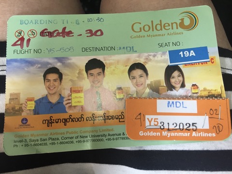 Then a small panic attack. As we approached the hotel, it dawned on me that every time we looked at all of our paper work for this trip — I never saw any flight from Yangon to Mandalay. In the taxi, we both searched emails and couldn’t find anything other than a few requests to different airlines questioning whether or not they serviced the two cities. Then I had a vague recollection of getting an email from one airline saying it had folded, and from another that didn’t post their schedule until close to the date of travel… and I think we just dropped the ball after that — too much going on: Thanksgiving, work projects, end of semester, office move, FTA Open House… and who knows what else. Anyway, from what we could tell, we didn’t have any reservation… Just a notation of the time of the flight in each of our calendars, but no confirmation number. So we moved fast.. I went online and captured the last two seats (and that they were – in the total back of the plane.. last row) and purchased them. Turns out Golden Myanmar Airlines (!!) has three prices for each flight – but no indication of what the differences are between the three fares, and the cost differential is $10. .So we opted for the middle price. Not sure what that gave us, since it clearly wasn’t for a stellar seat.