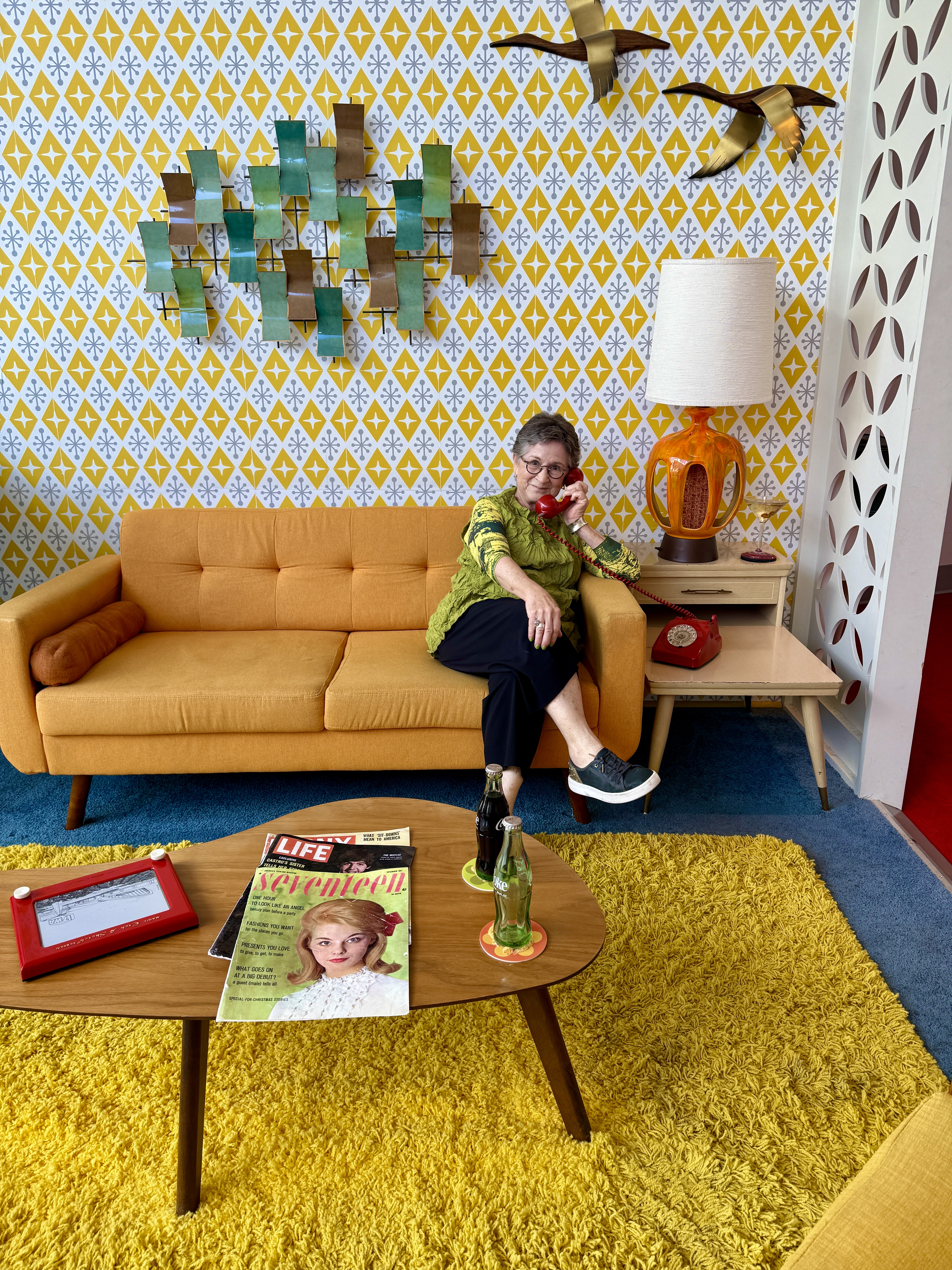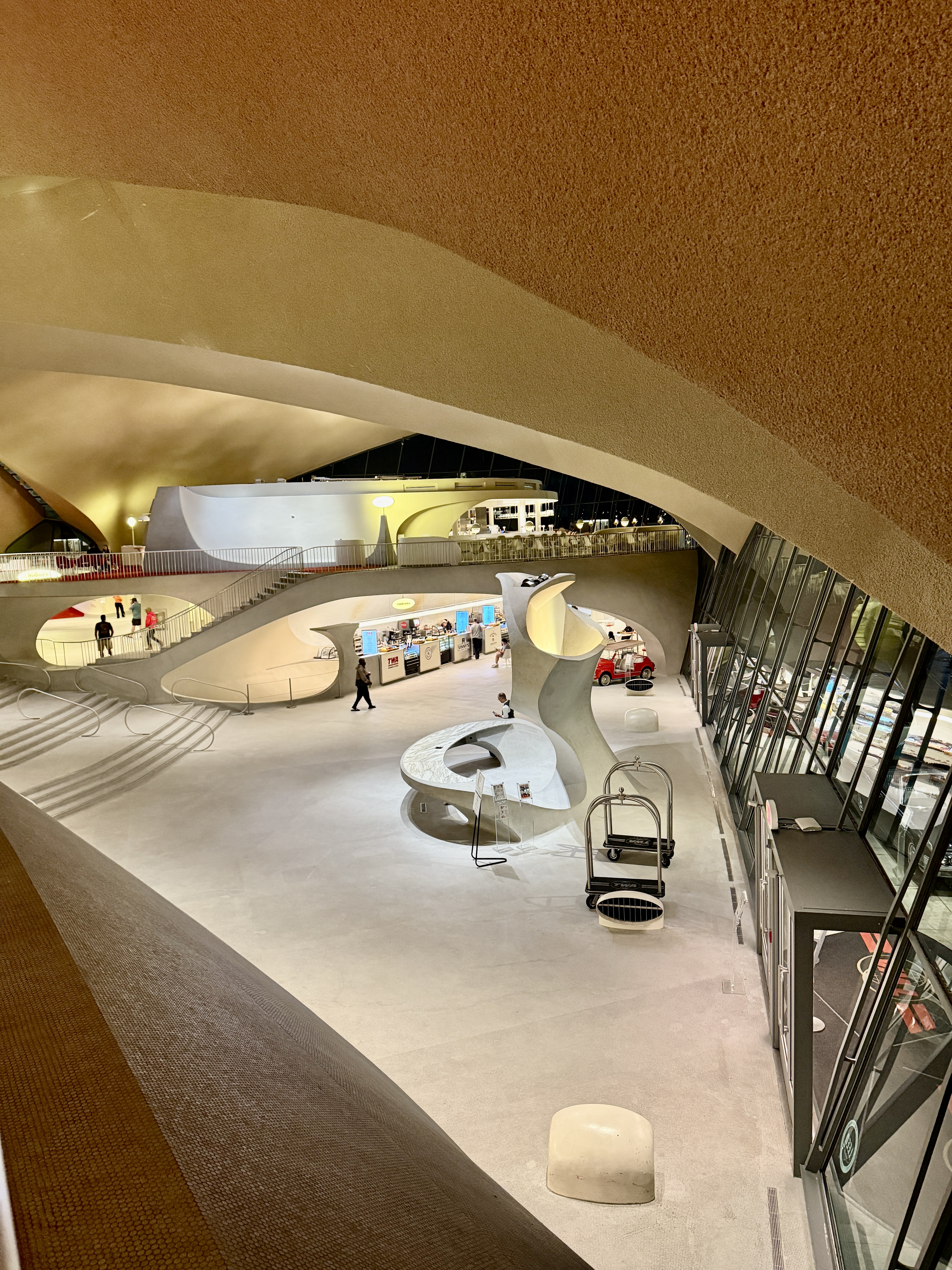Carol and I came in last night (Thursday) and stayed at the TWA Hotel at the airport, located in Terminal 5 in the actual Saarinen building from where TWA flights flew. I’ve stayed three times before but it was new for Carol so it was fun to explore the building. It’s the actual “flight center” at JFK. Some of you may renmenber flying in and out of the old Idlewild Airport (the name before it was called JFK) and either using or seeing the TWA terminal which was like no other.