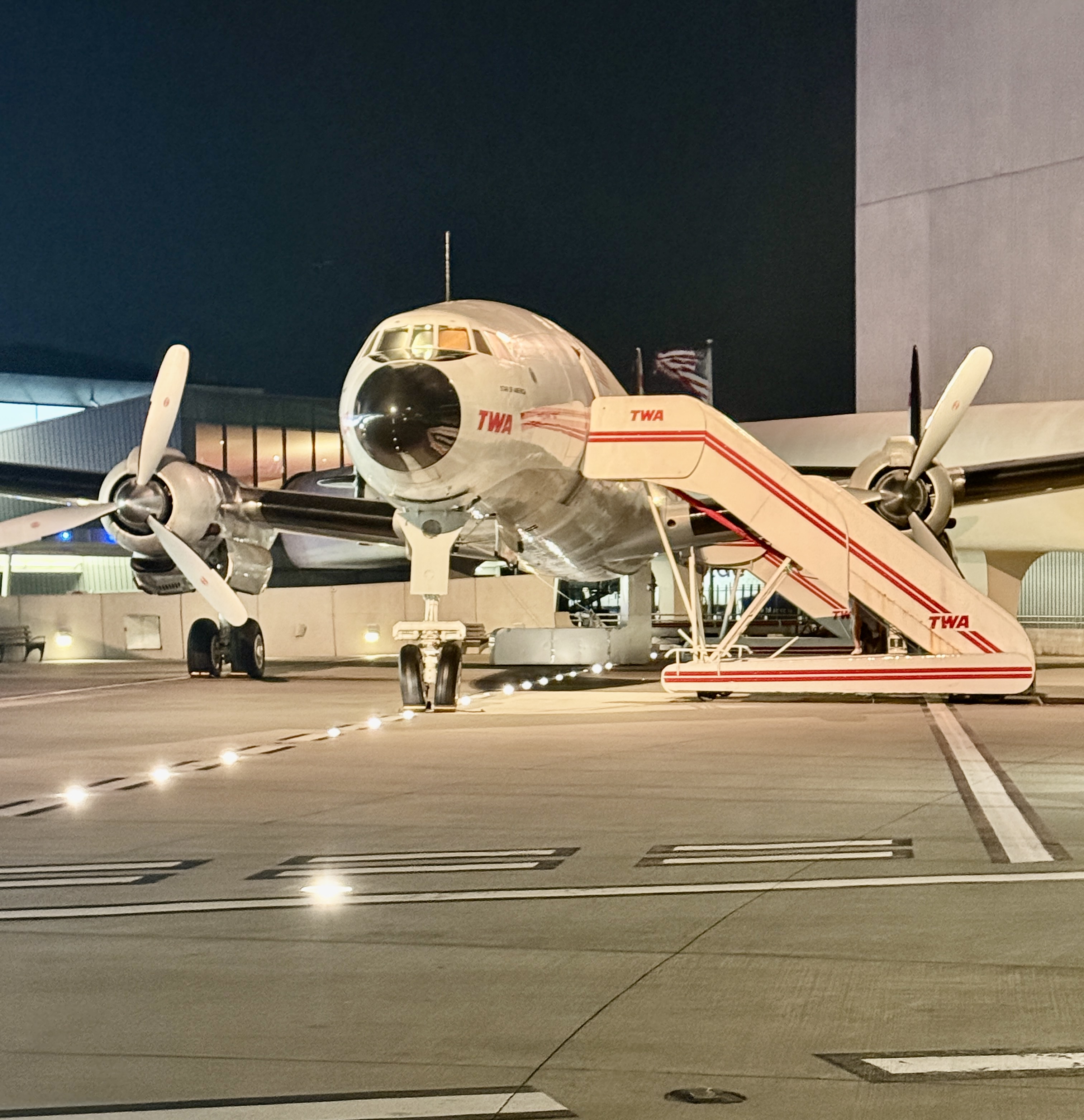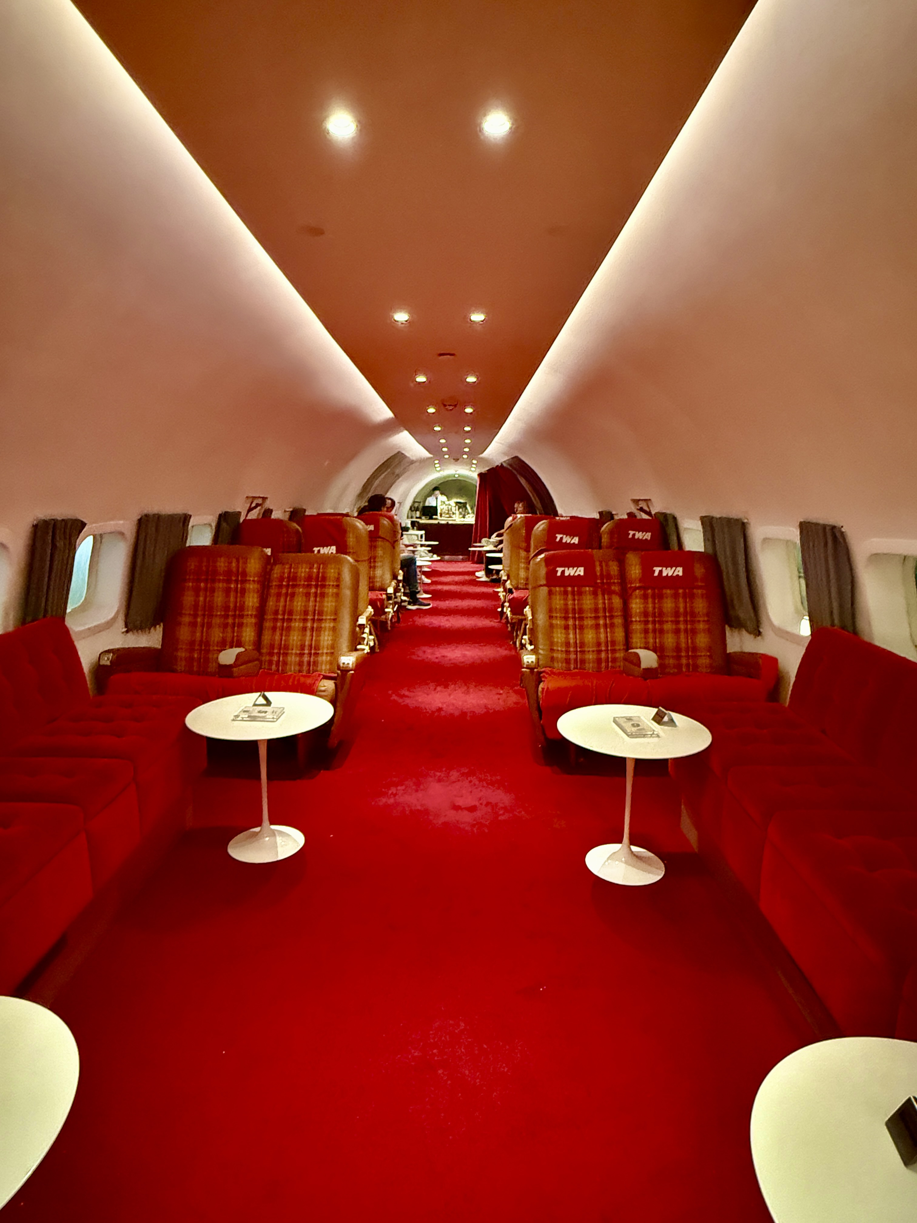 Anyway, the actual terminal opened in 1962 (a year after Saarinen died) and was the headquarters for TWA until TWA went bankrupt in 2001. After more than 15 years of dormancy, the building was restored and reopened as the TWA Hotel in 2019—with the flair of the 1960s permeating the space (music from the 60s everywhere, photo booths, replicas of a 1960 beauty salon, a room to play Twister, and more). We had fun exploring the whole place incluing the infinity pool on the roof where you can swim while planes are buzzing overhead. We had planned to eat at a somewhat mafia restaurant in Queens, but we were exhausted and decided to eat at the hotel and have cocktails at “Connie” located at the hotel—a 1958 Lockheed Constellation airplane turned cocktail lounge parked on the old TWA tarmac. Apparently the plane served as an Alaskan bush plane bringing supplies to Prudhoe Bay and larter was a marijuana dropper after it was no longer with TWA! They have cocktails with names like “Vodka is ny Co-Pilot.”