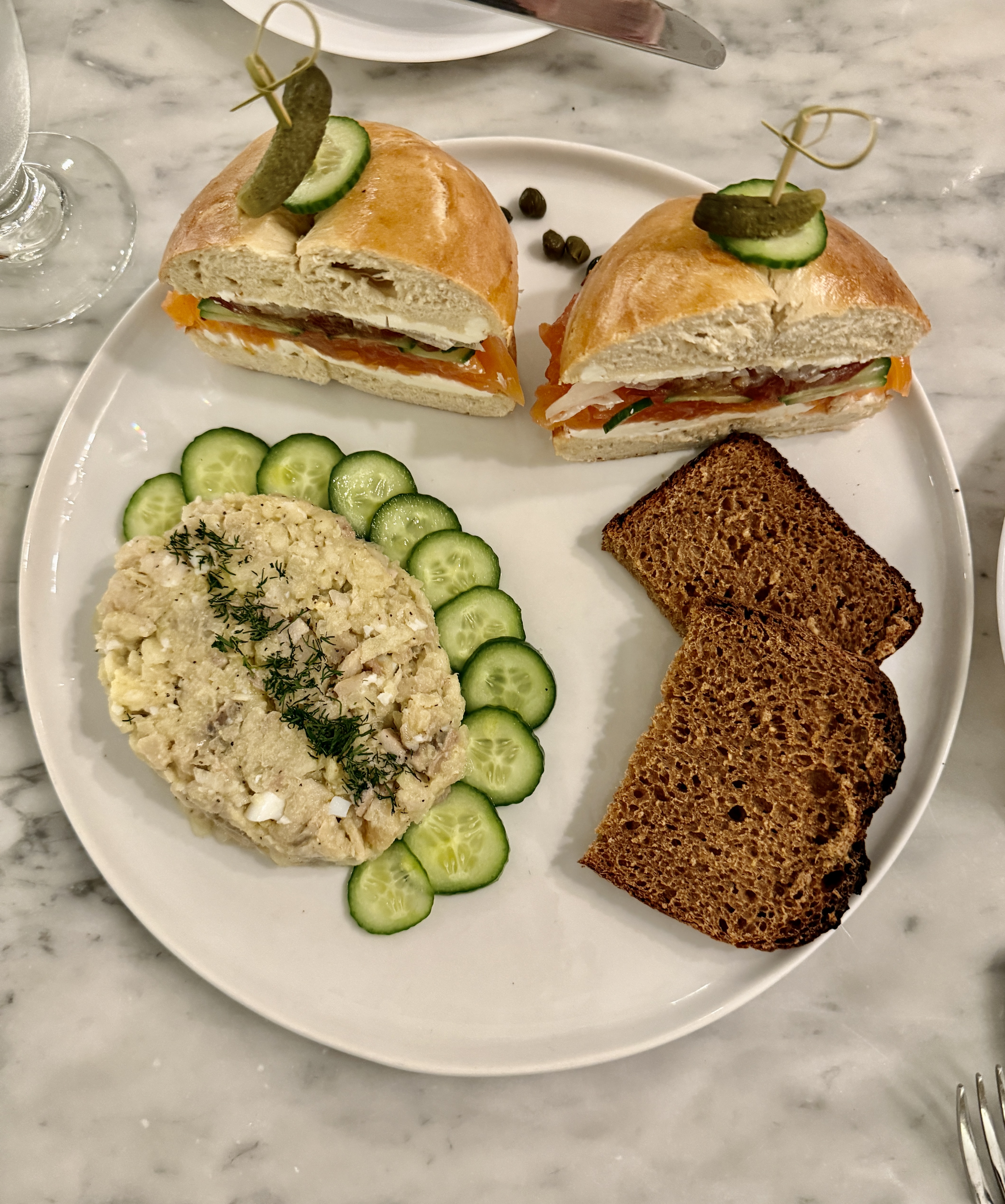 But first it was lunch at LOX located inside the museum. We shared a wonderful chopped herring that was vodka infused! and they served complementary vodka shots with it (they were out of vodka so they substituted gin) and they started with a complementary “Matzo Babka!” And we had a bagel with lox (natch!). Then it was on to the exhibit which was very impressive.