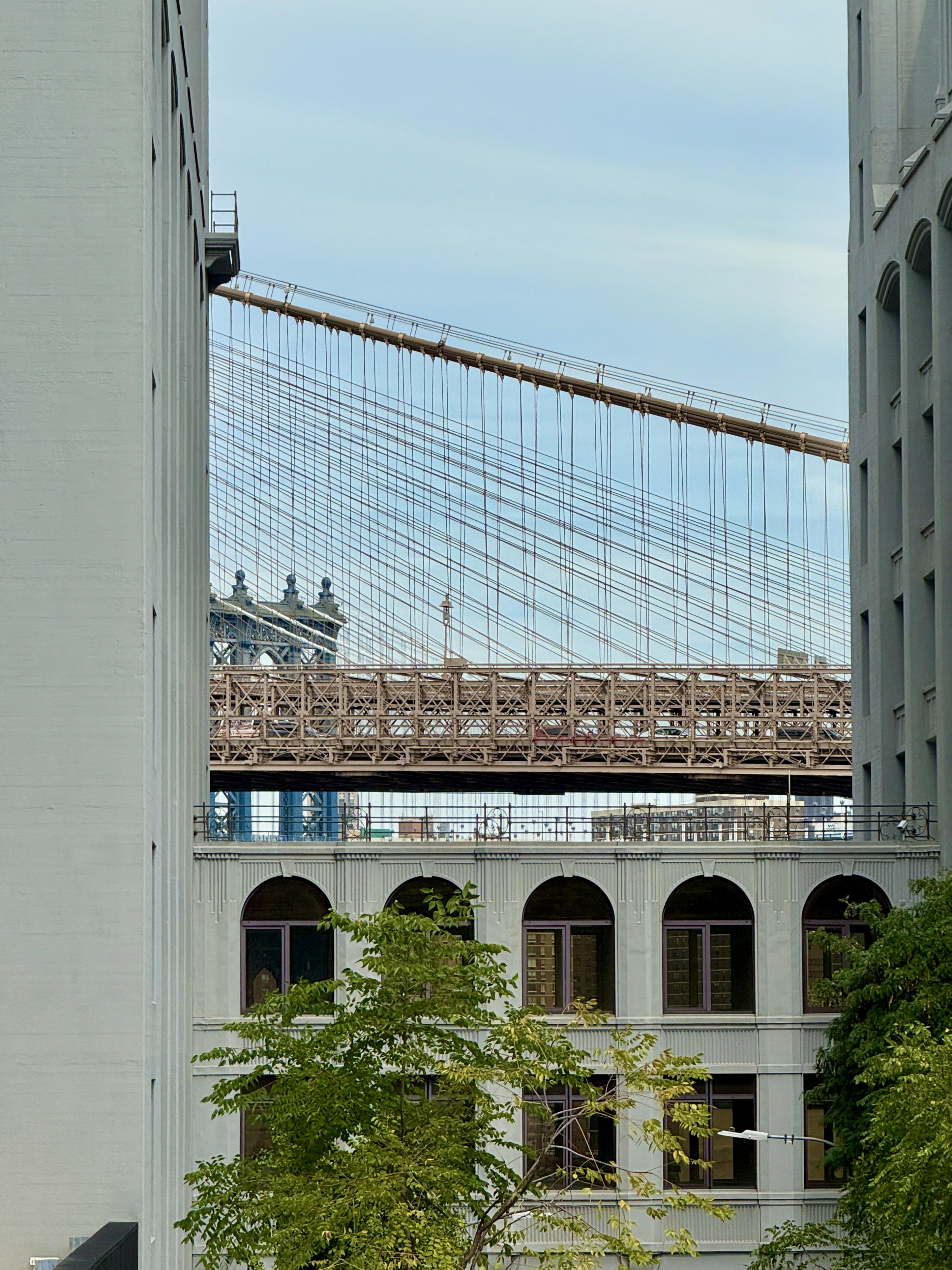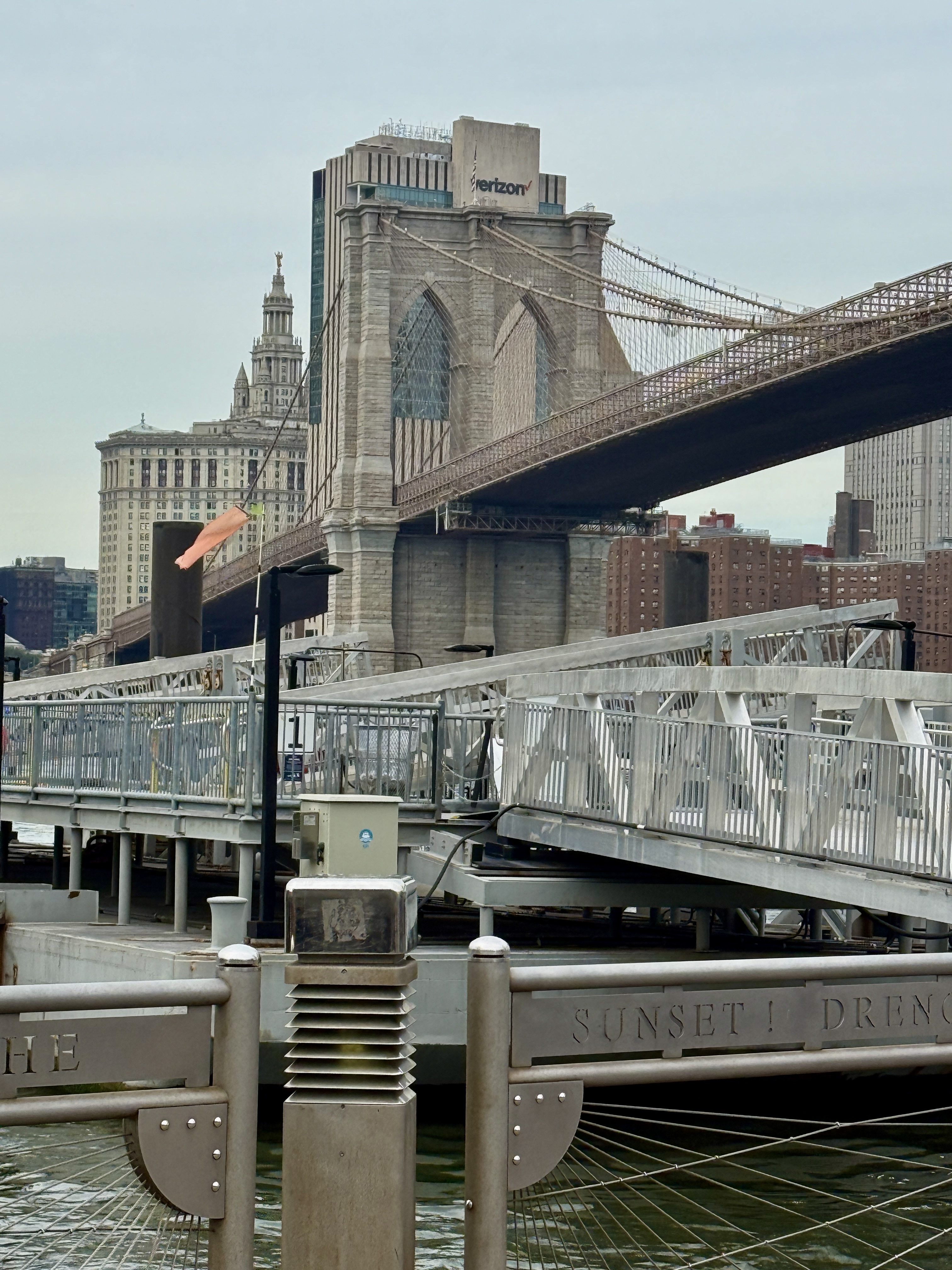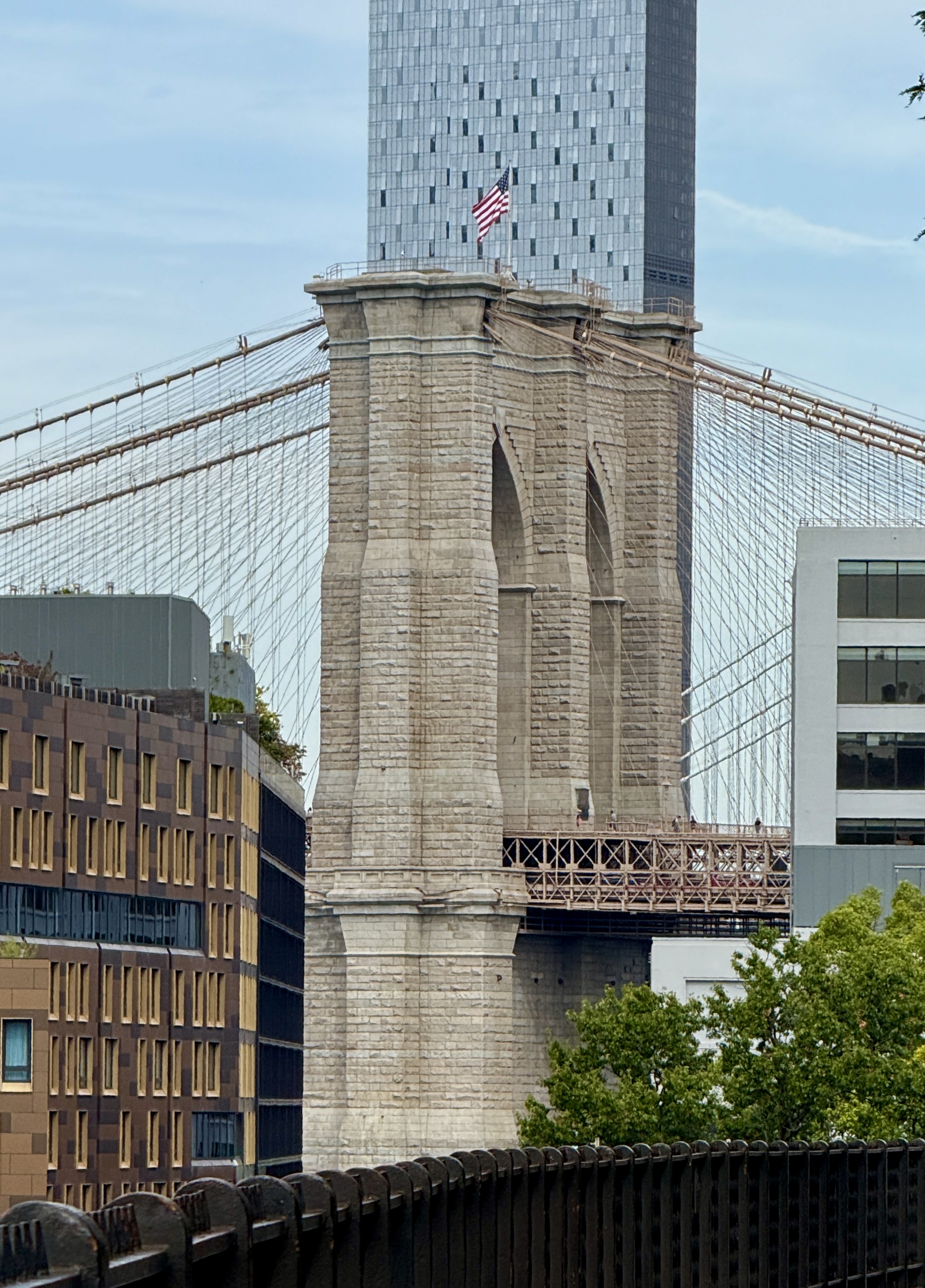 Began the day with a room change here at the ACE Hotel and I am now on the very top floor with a corner room! But I’m not in the room much althoughit is wonderful to see the sun rise over Manhattan and the East River. Anyway, after a nice, quick, and later-than-usual breakfast at the Ace, we headed to the wonderful, iconic, elevated Brooklyn Heights Promenade, driving through the wonderfully tree-lined streets of the Heights and marveling (swooning over) the 19th Century. brownstones and row houses. The walk on the promenade was–as always–delightful, exposing the best views of the Manhattan skyline. We walked to the end and dipped down into Brooklyn Bridge Park–getting close to and under the Brooklyn Bridge.