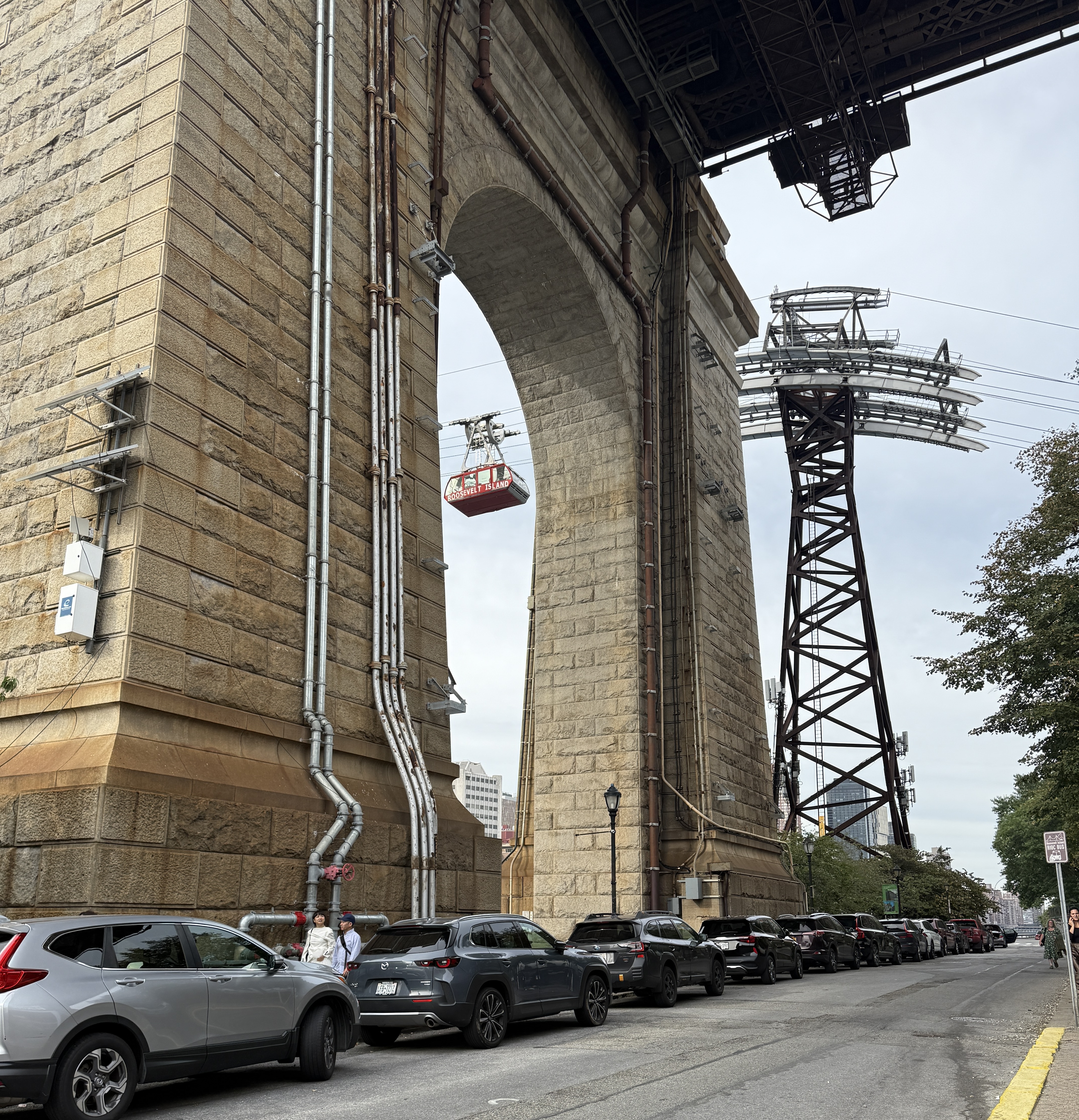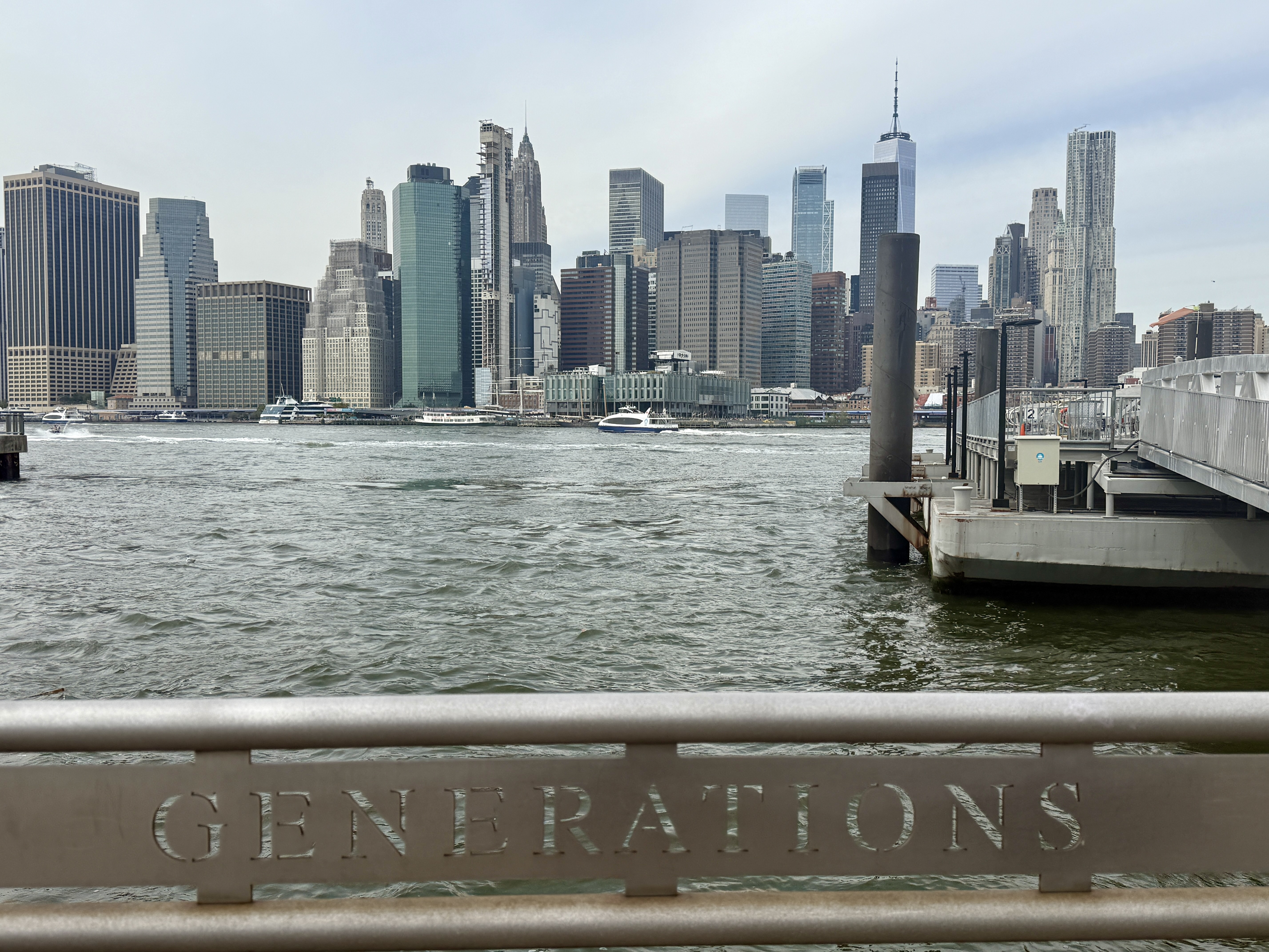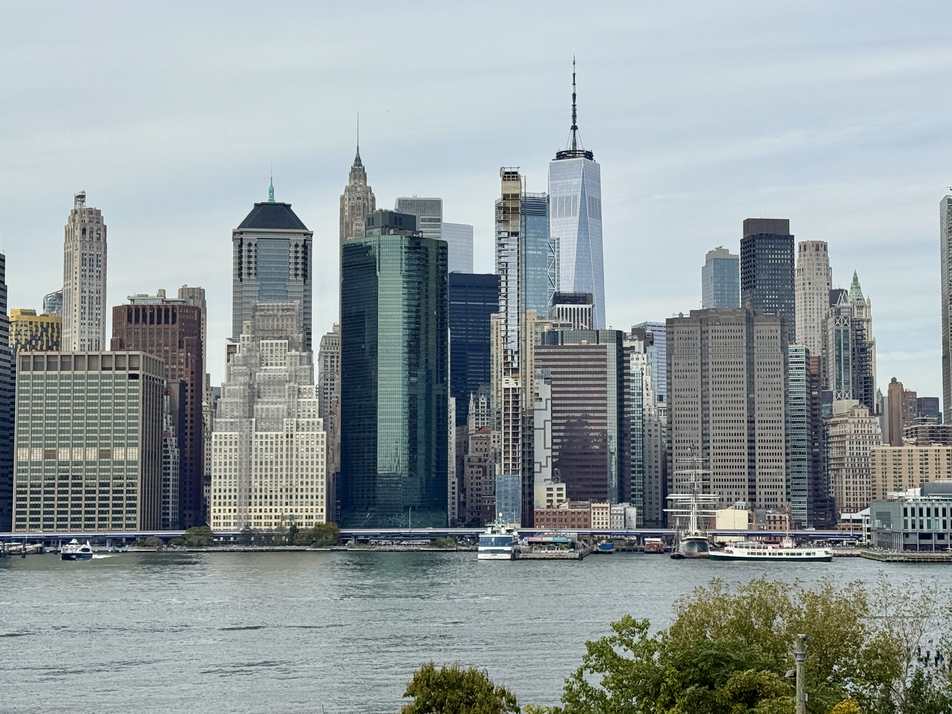 Began the day with a room change here at the ACE Hotel and I am now on the very top floor with a corner room! But I’m not in the room much althoughit is wonderful to see the sun rise over Manhattan and the East River. Anyway, after a nice, quick, and later-than-usual breakfast at the Ace, we headed to the wonderful, iconic, elevated Brooklyn Heights Promenade, driving through the wonderfully tree-lined streets of the Heights and marveling (swooning over) the 19th Century. brownstones and row houses. The walk on the promenade was–as always–delightful, exposing the best views of the Manhattan skyline. We walked to the end and dipped down into Brooklyn Bridge Park–getting close to and under the Brooklyn Bridge.