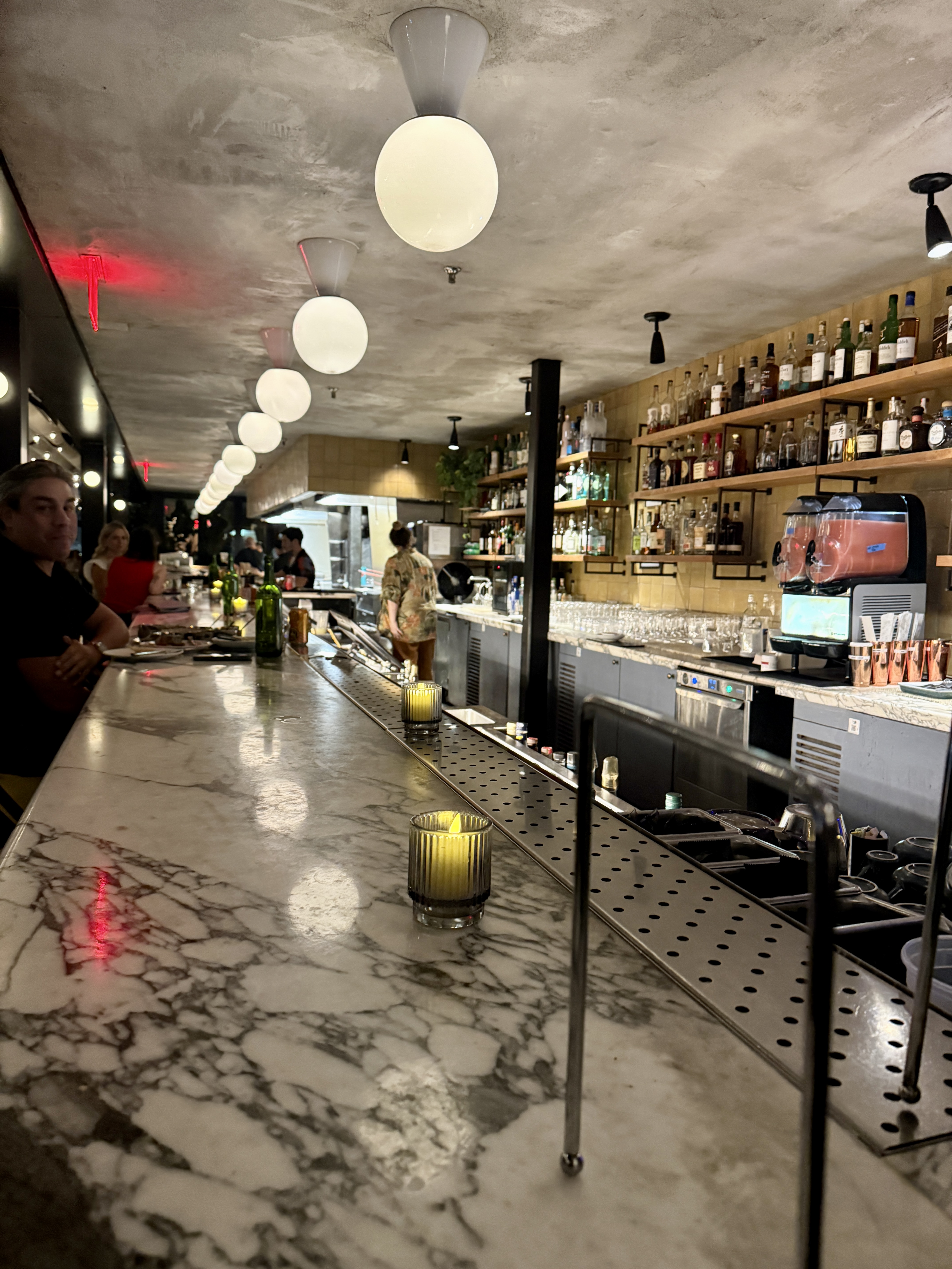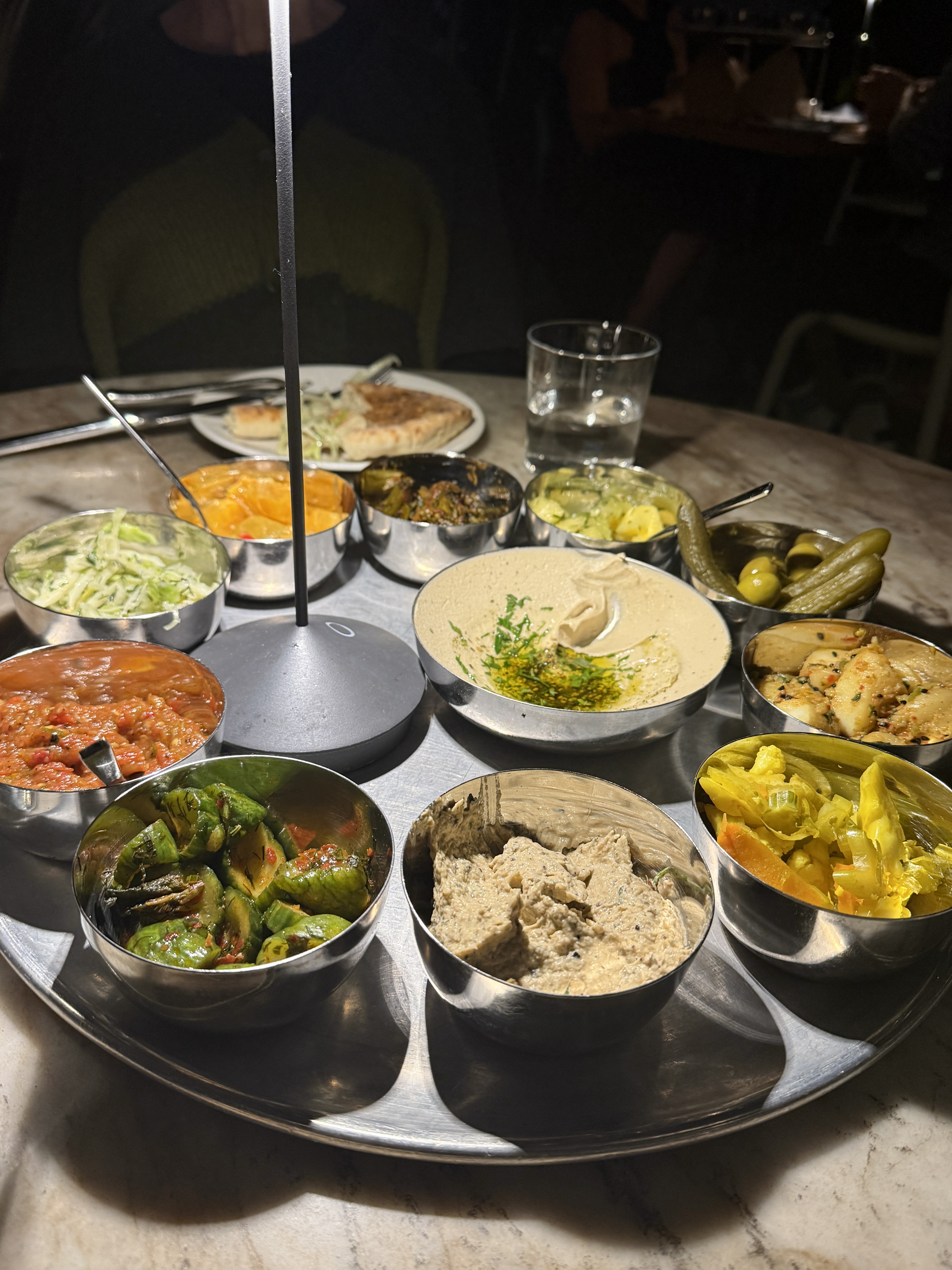 After a brief stop at the hotel, we headed to Laser Wolf for dinner. The restaurant is on the top of the Hoxton Hotel in Williamsburg with great views that surround the whole restaurant. Laser Wolf is considred a “skewer house”–serving a bunch of different kebabs and skewers surrounded by 10 different items in their “salatim” (things like hummus and babaganoush and pineapples with celery and Israeli pickles and spicy cucumbers and Tunisian potatoes, etc. etc. Food was good but not nearly as good as Sofreh (still my favorite of all the Middle Eastern restaurants).