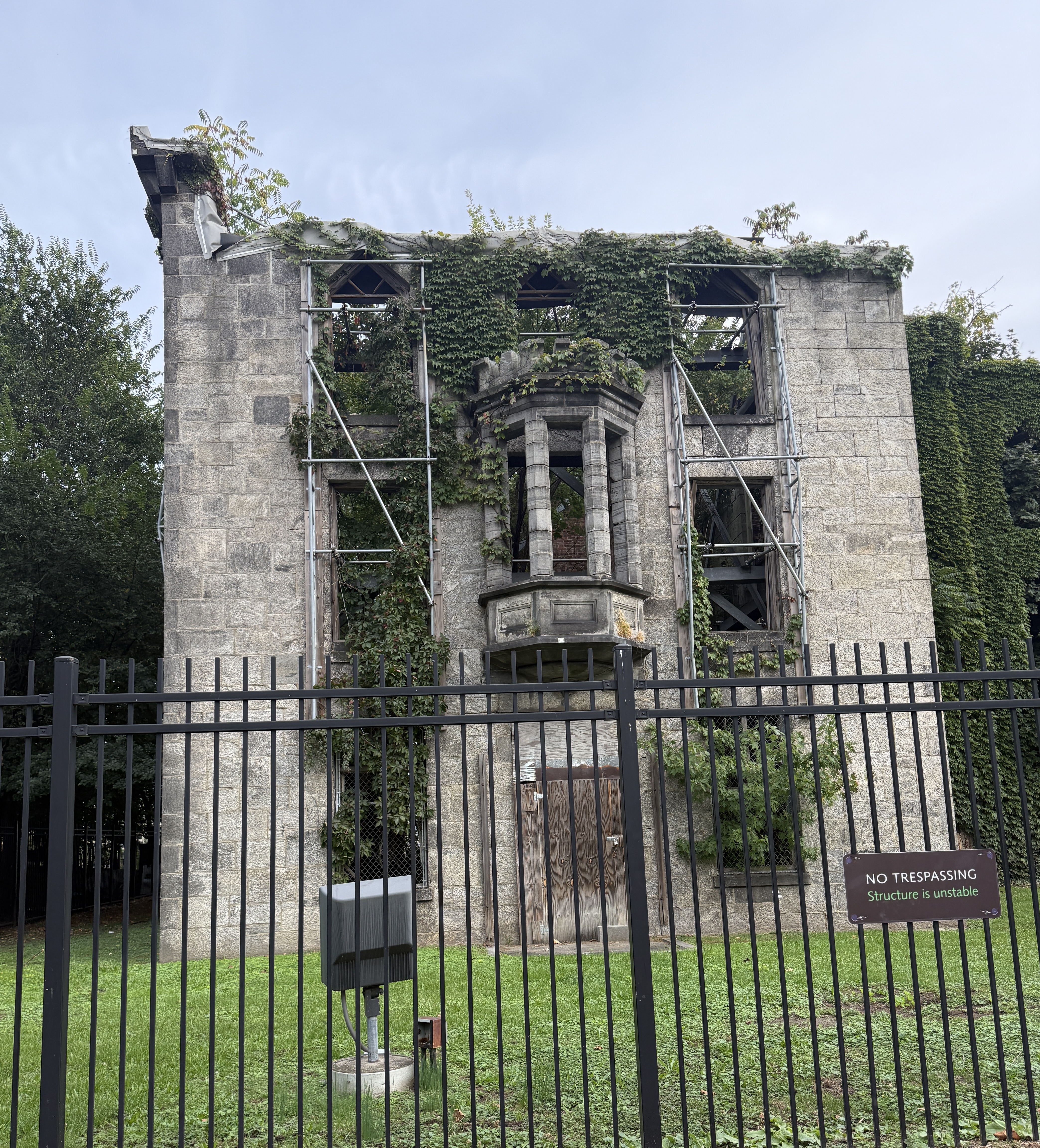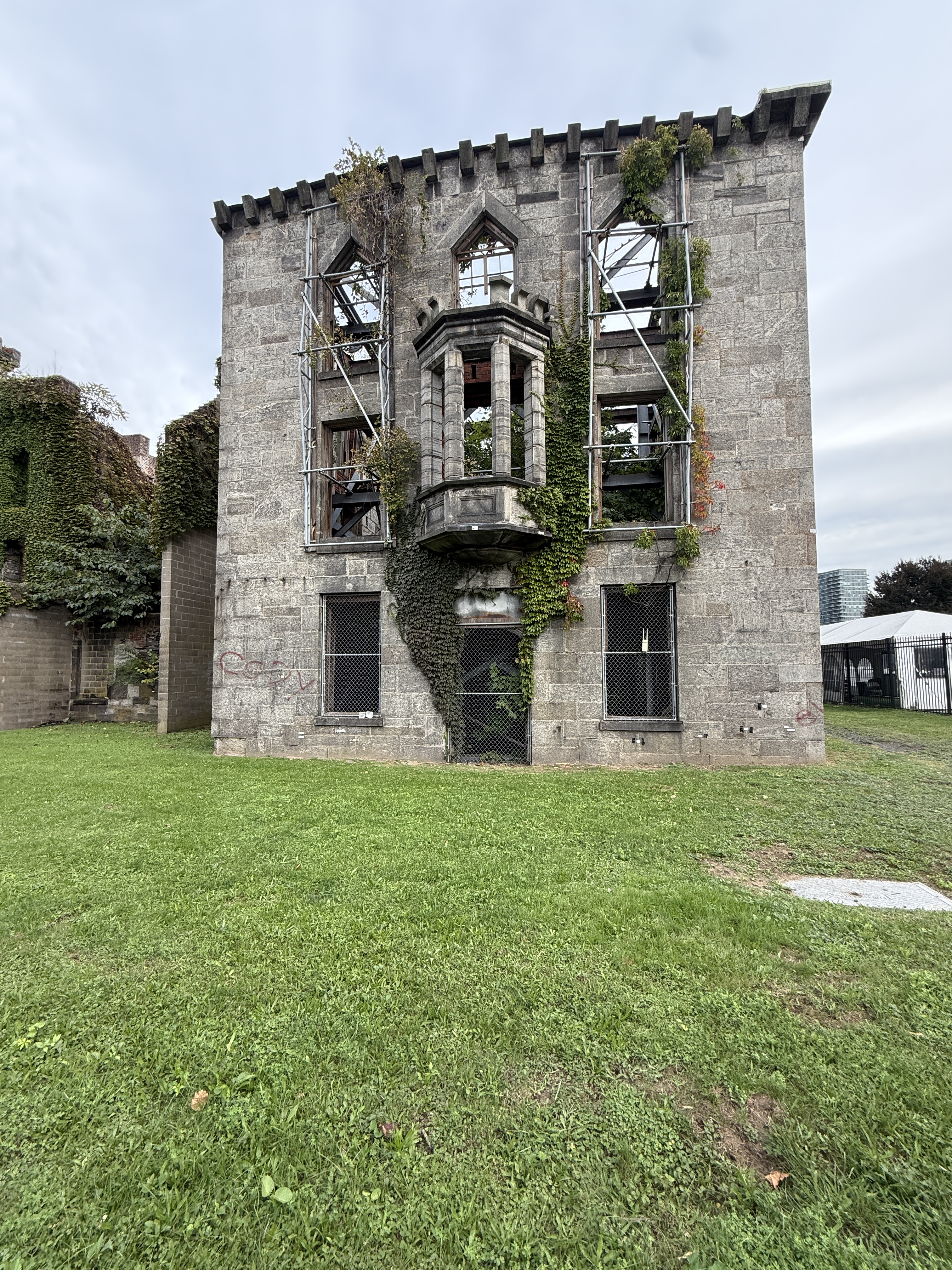 It was a long subway ride on the F Local. Growing up in Brooklyn, I recall the development of Roosevelt Island (which had been called Welfare Island until 1973). There had been a long abandoned smallpox hospital on the island and historically there had been a penetentiary (which had been built by prisoners), a mental asylum where conditions were horrific and exposed by the press, and perhaps some other buildings and activities. Then in the 70s a residential community was established and the major route for getting to the island was on the aerial “tramway”which you picked up on 59th St and it ran alongside the Queensboro Bridge. Today, you can take the subway to Roosevelt Island, where about 12,000 people live. It’s also the location of a very super-modern tech campus for Cornell University and the Tata Innovation Center. And you can still see the abandoned smallpox hospital and the remains of some other structures including the “lunatic asylum.”