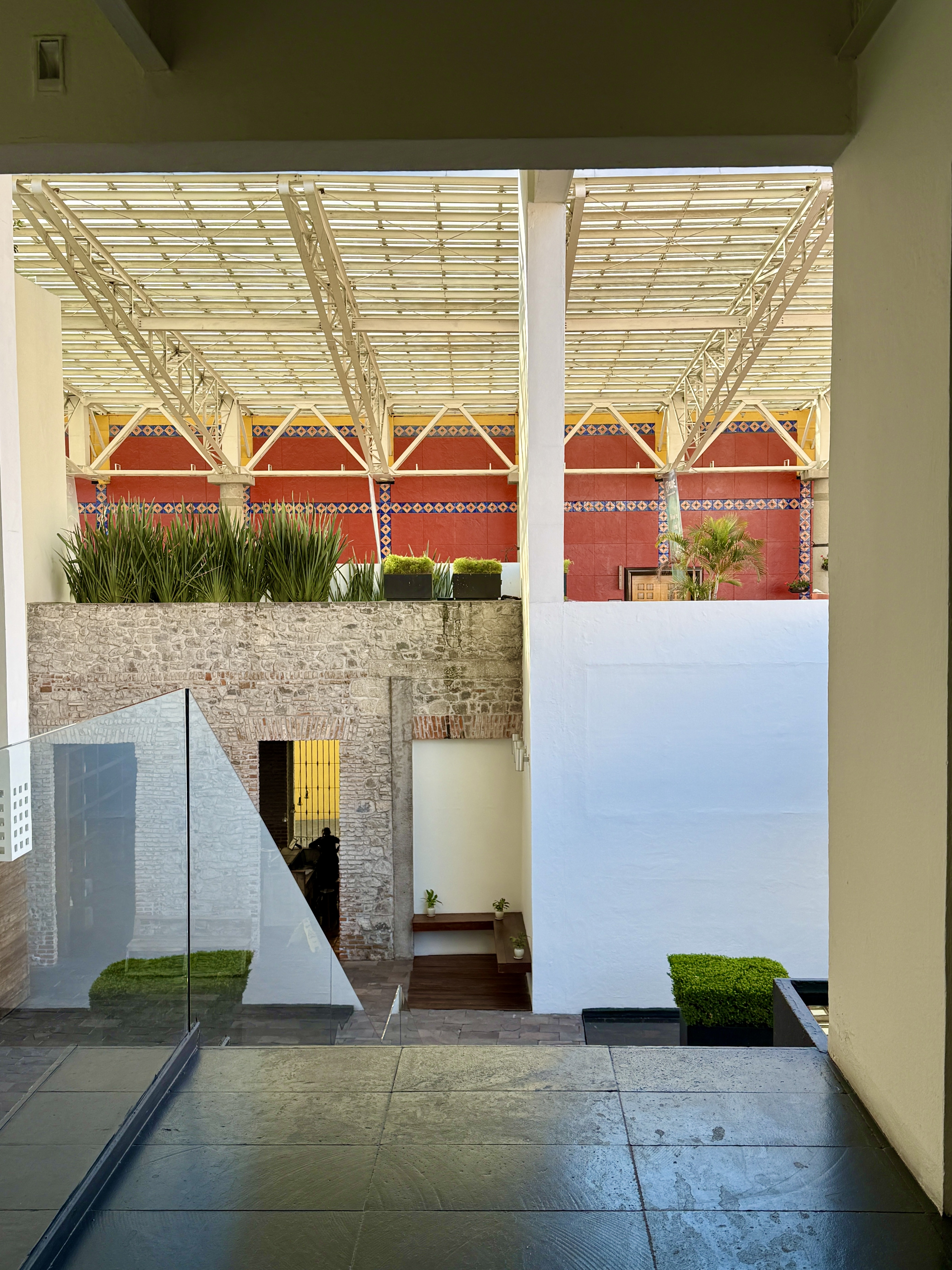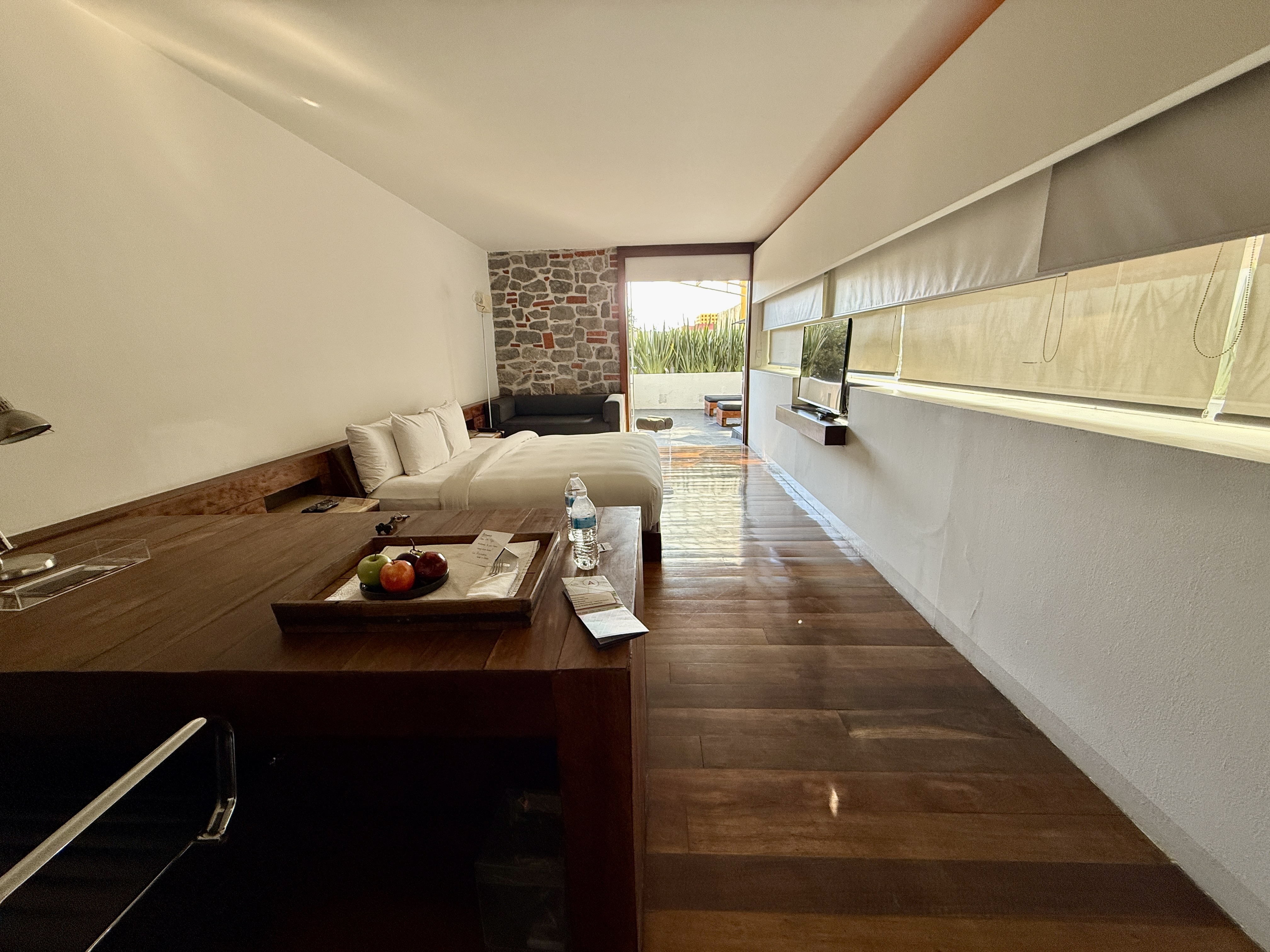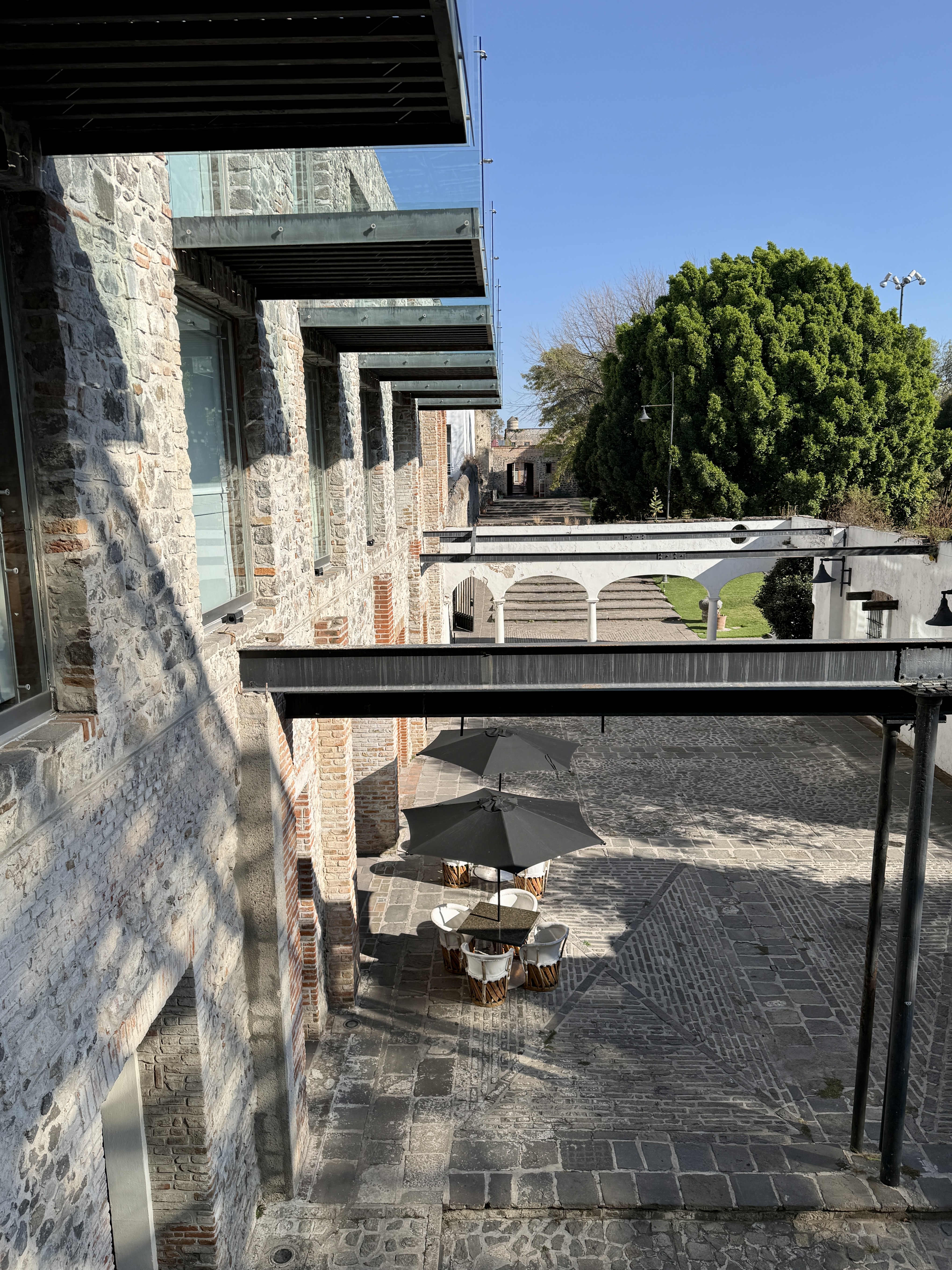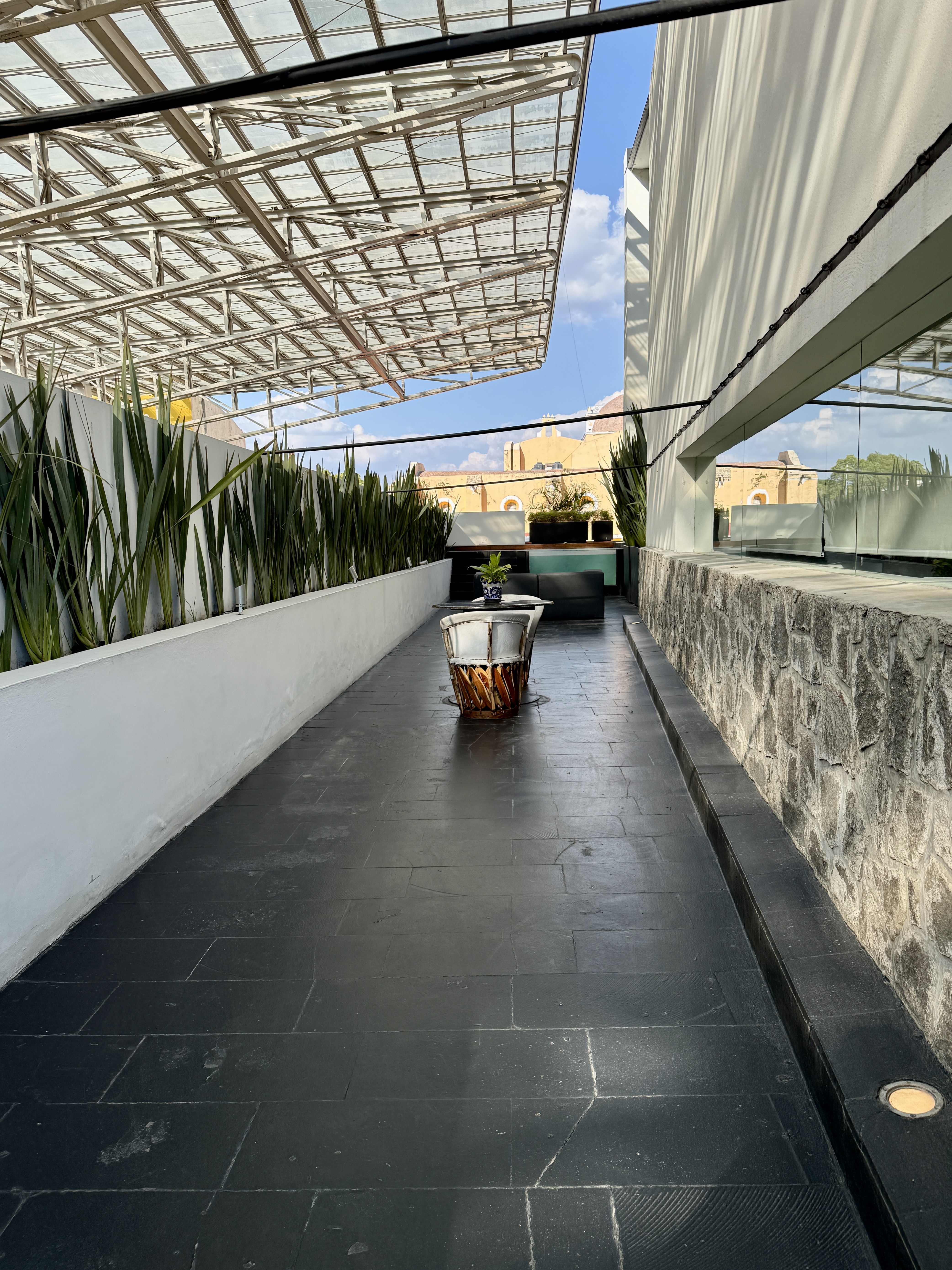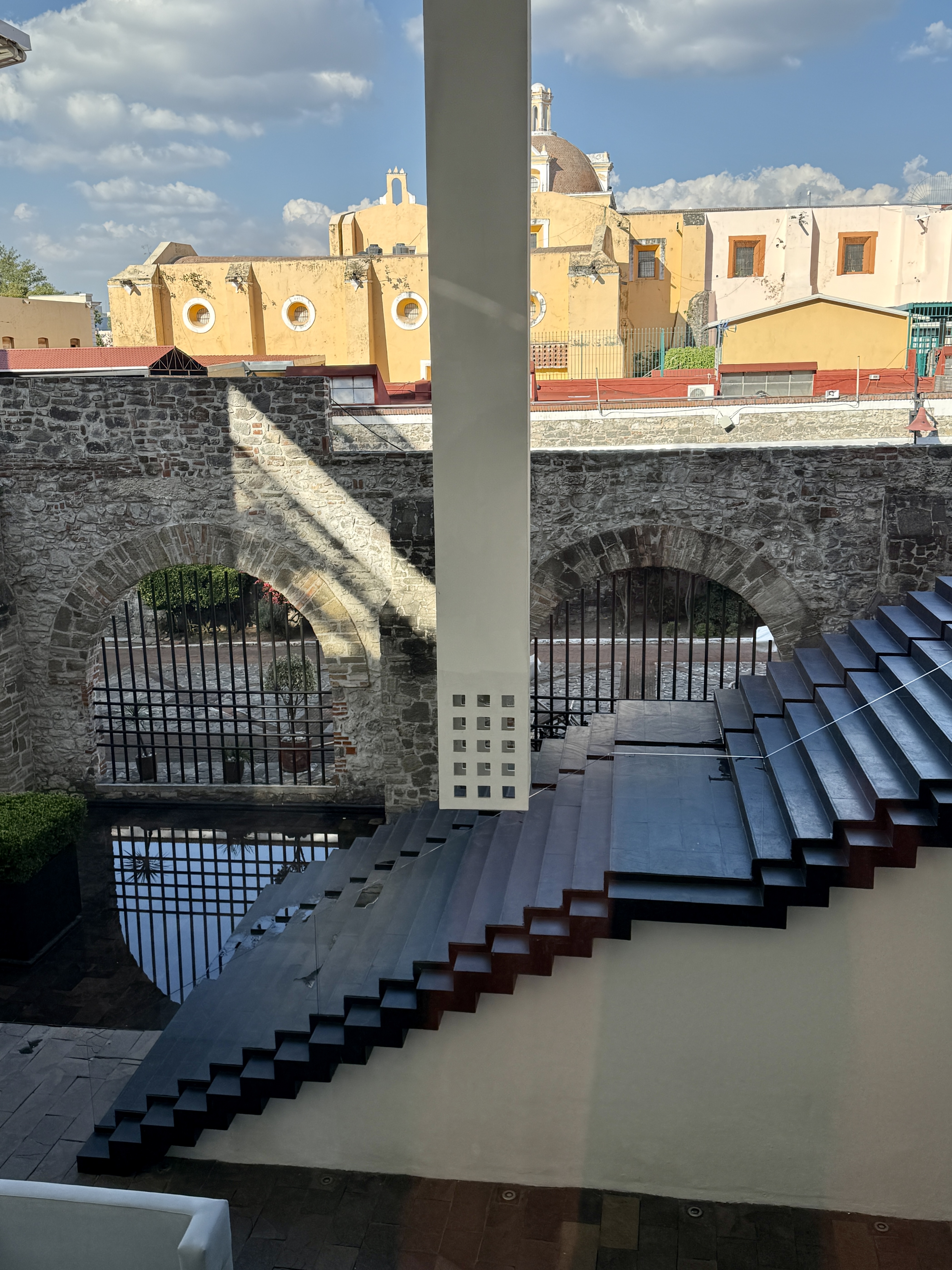 Anyway, the drive from Oaxaca to Puebla climbs about 2,000 feet to 7,100 ft in altitude so it goes through mountains with lots of curving roads and it’s mostly a desert landscape filled with cactus. We arrived in Puebla at 3:00 and checked into La Purificadora Hotel–a 17-year old hotel built into an 1800 water purification plant. The architect was Legoretta, although Mike says his son was the architect and not Ricardo Legoretta (who Mike met in the 1970s and who died in 2013). Anyway, it’s quite a switch from Pug Seal — with soaring ceilings, glass stairs, fire pits in the lobby, and huge rooms. We were upgraded to a 600-sq ft room with an outdoor jacuzzi on our private deck which stretches all around the room which is lined with windows.