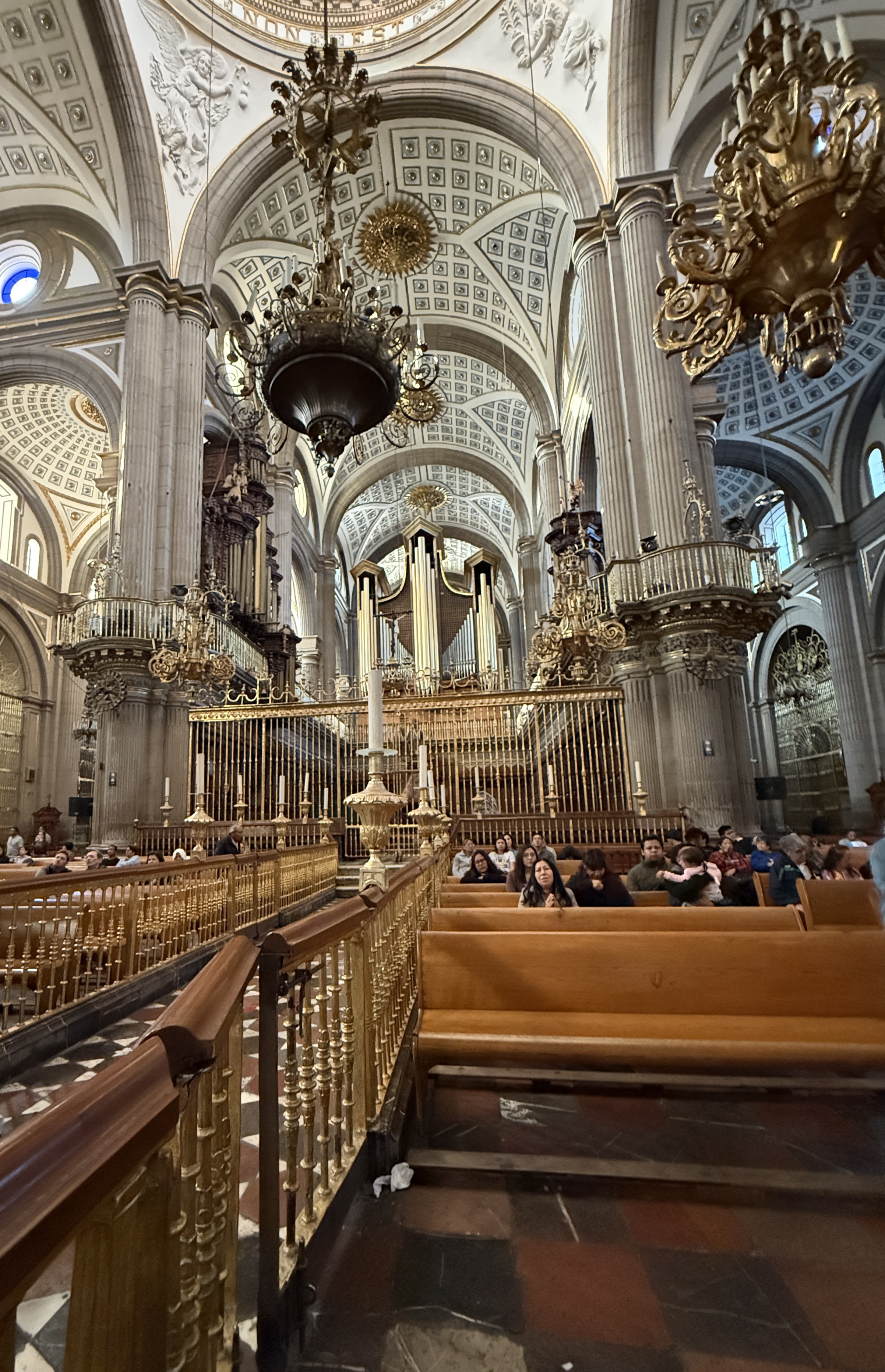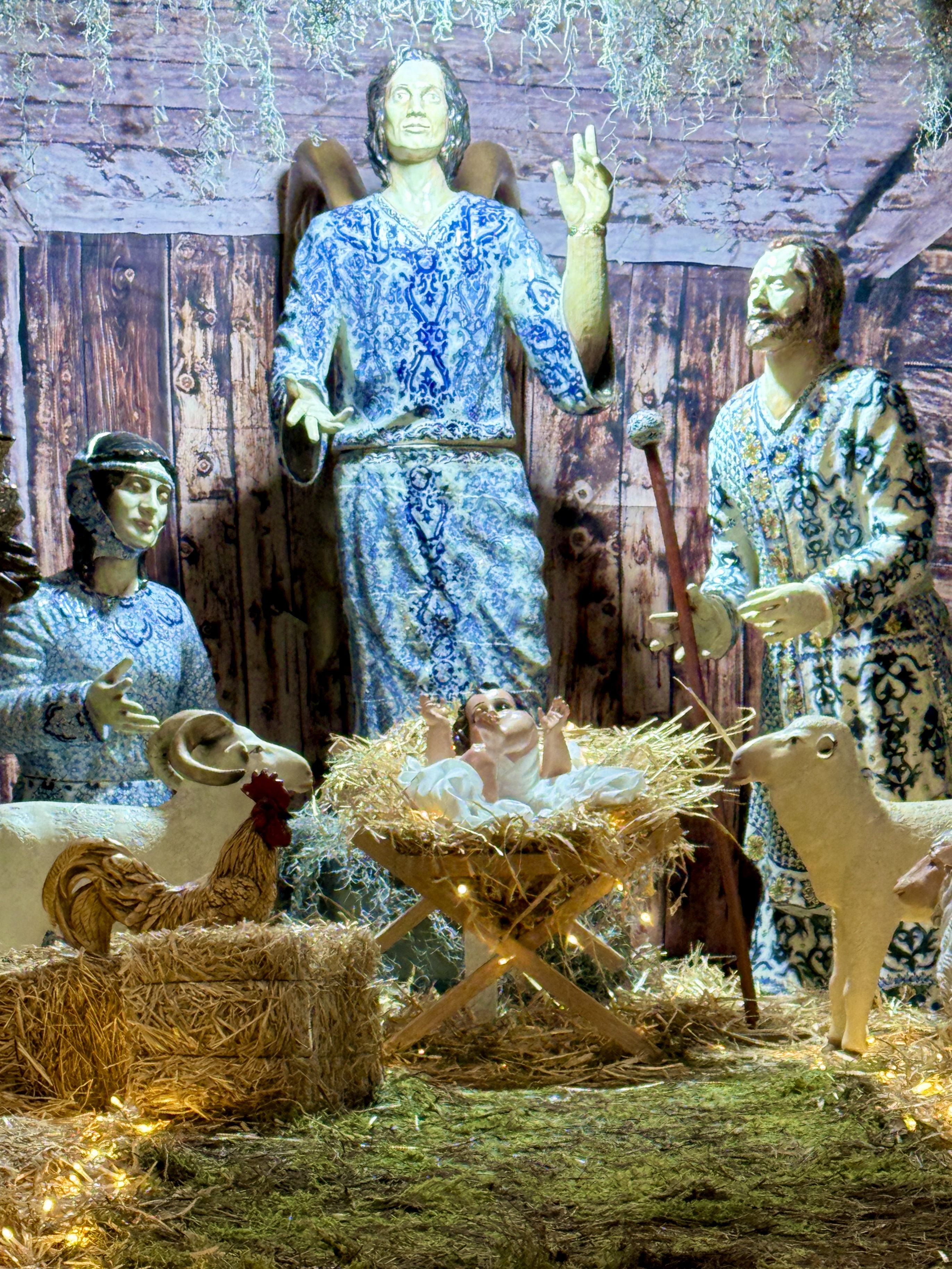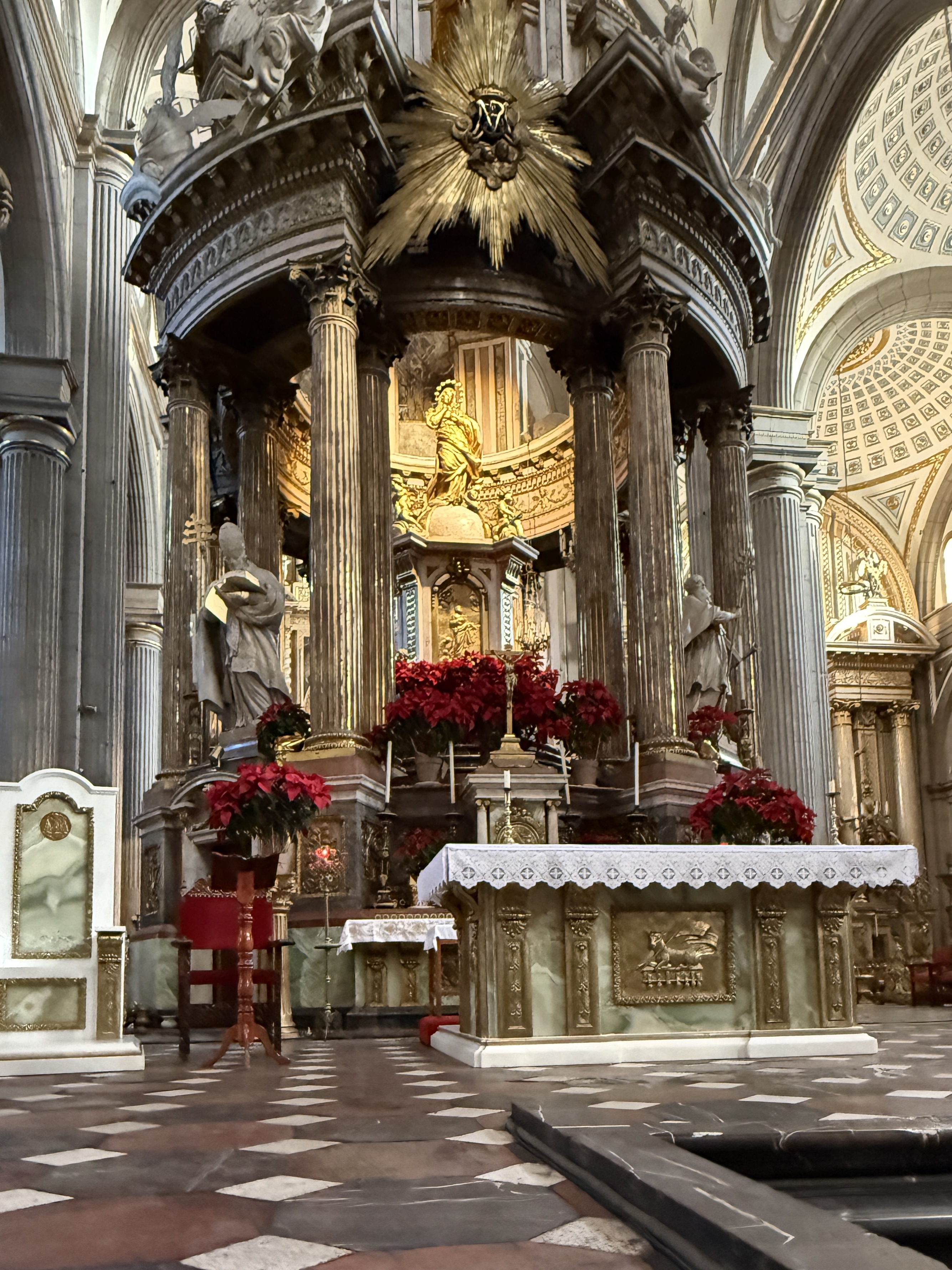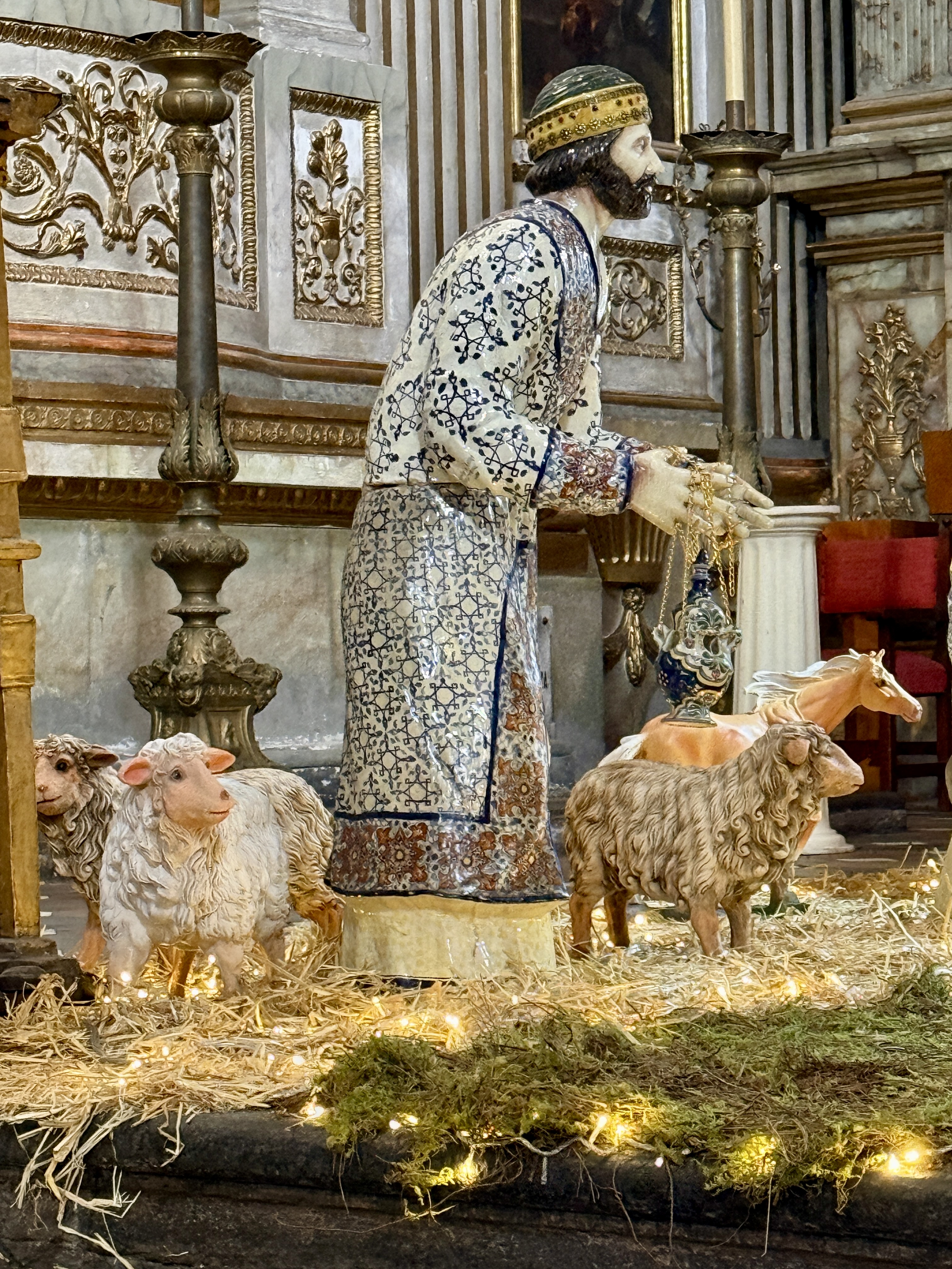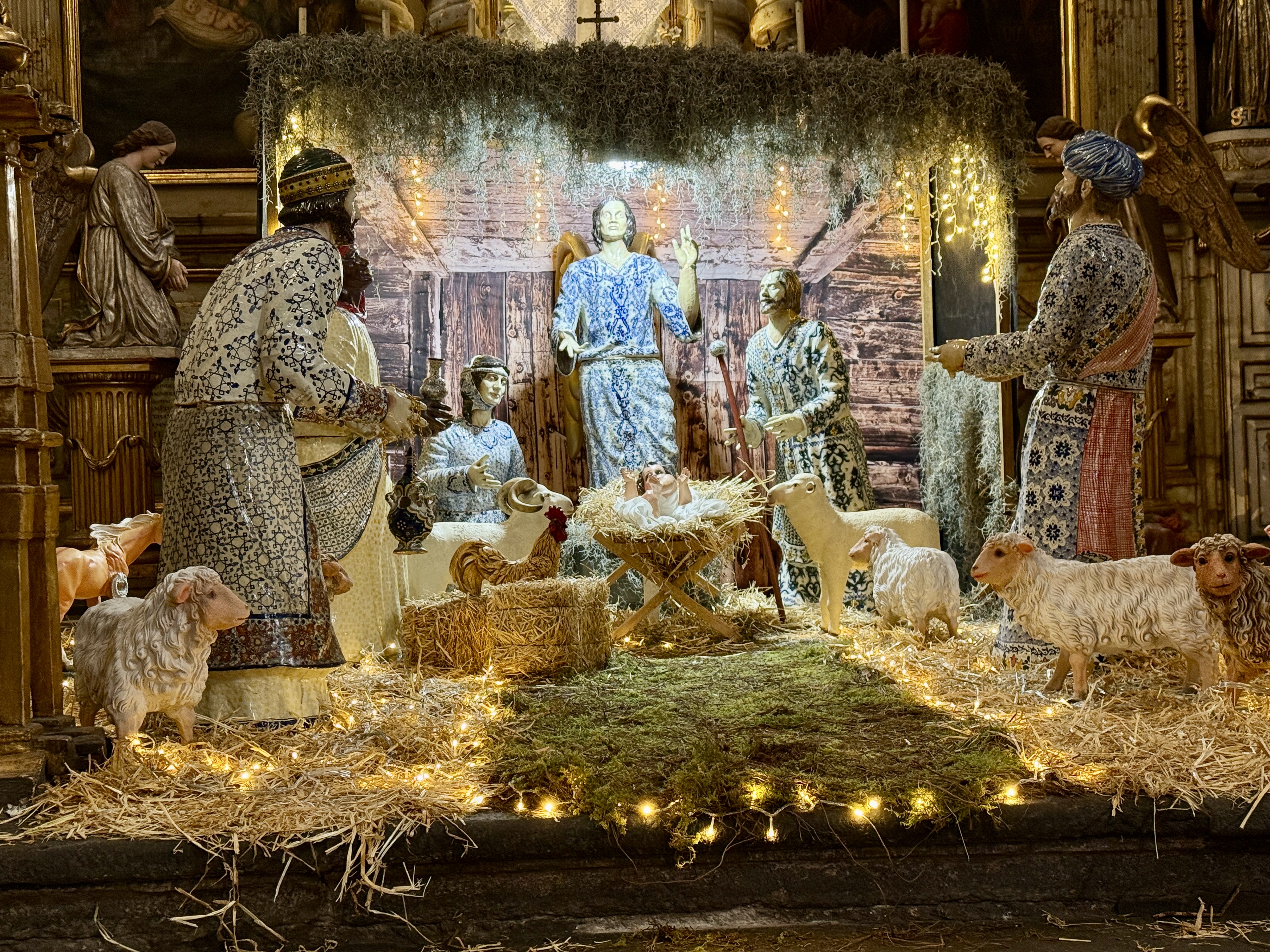 We headed for the Zocalo which was as bustling as Oaxaca’s main square, and even more so. Lots of people, families, and street performers. Like all Mexican cities the main cathedral sits on one edge of the Zocalo. Like the Oaxaca cathedral, this one is also from the 1500s (and 1600s) and is Baroque (I’d say Baroque on steroids).Puebla is also the home of much of Mexico’s famous talavera pottery and ceramic, so throughout the city you see ceramic tiles on buildings and streets. Thus it was no surprise (well actually I was pretty surprised) to see the large nativity scene in the cathedral made of talavera ceramic. But I guess they couldn’t resist, so they added all sorts of blinking lights.