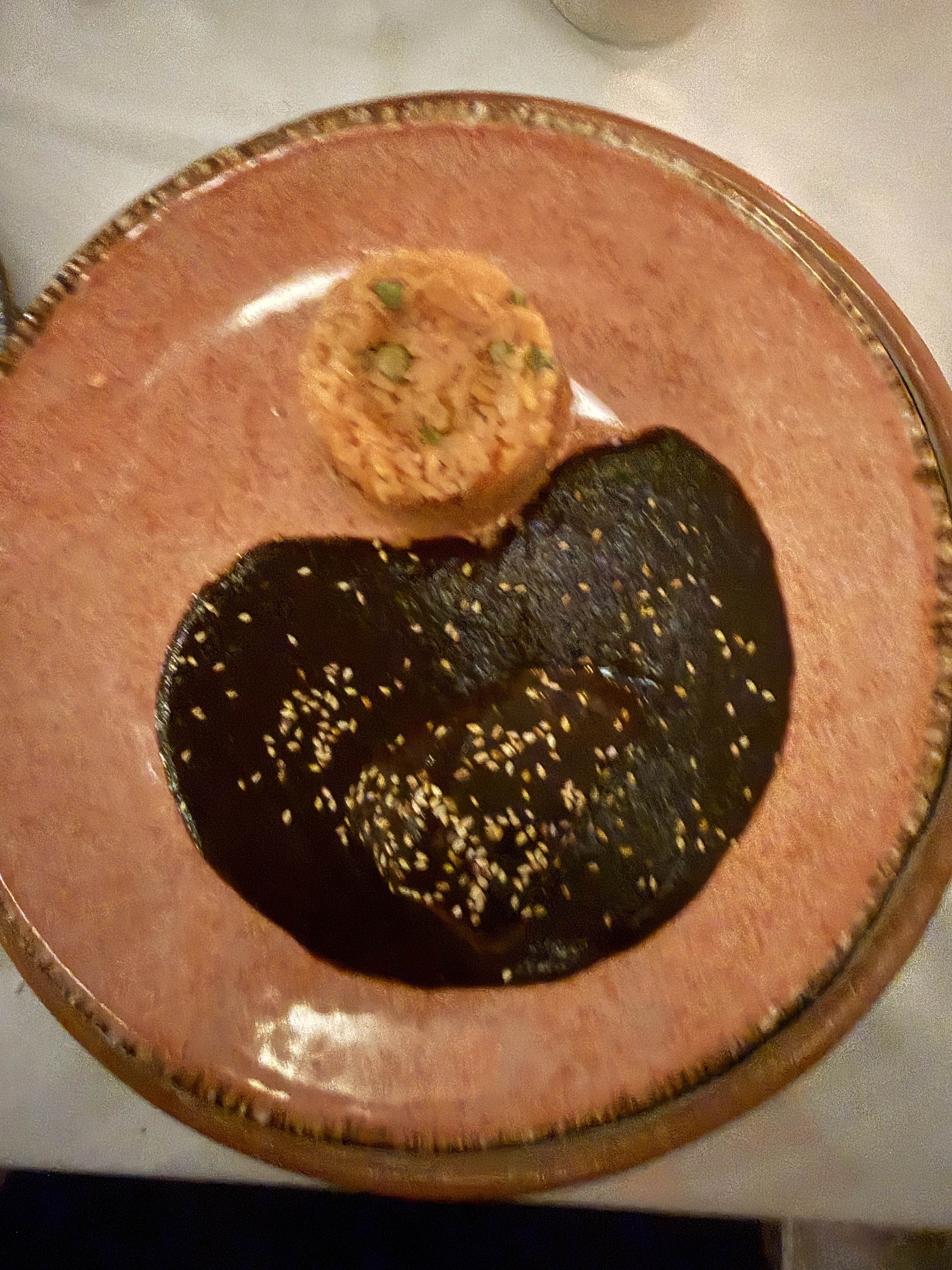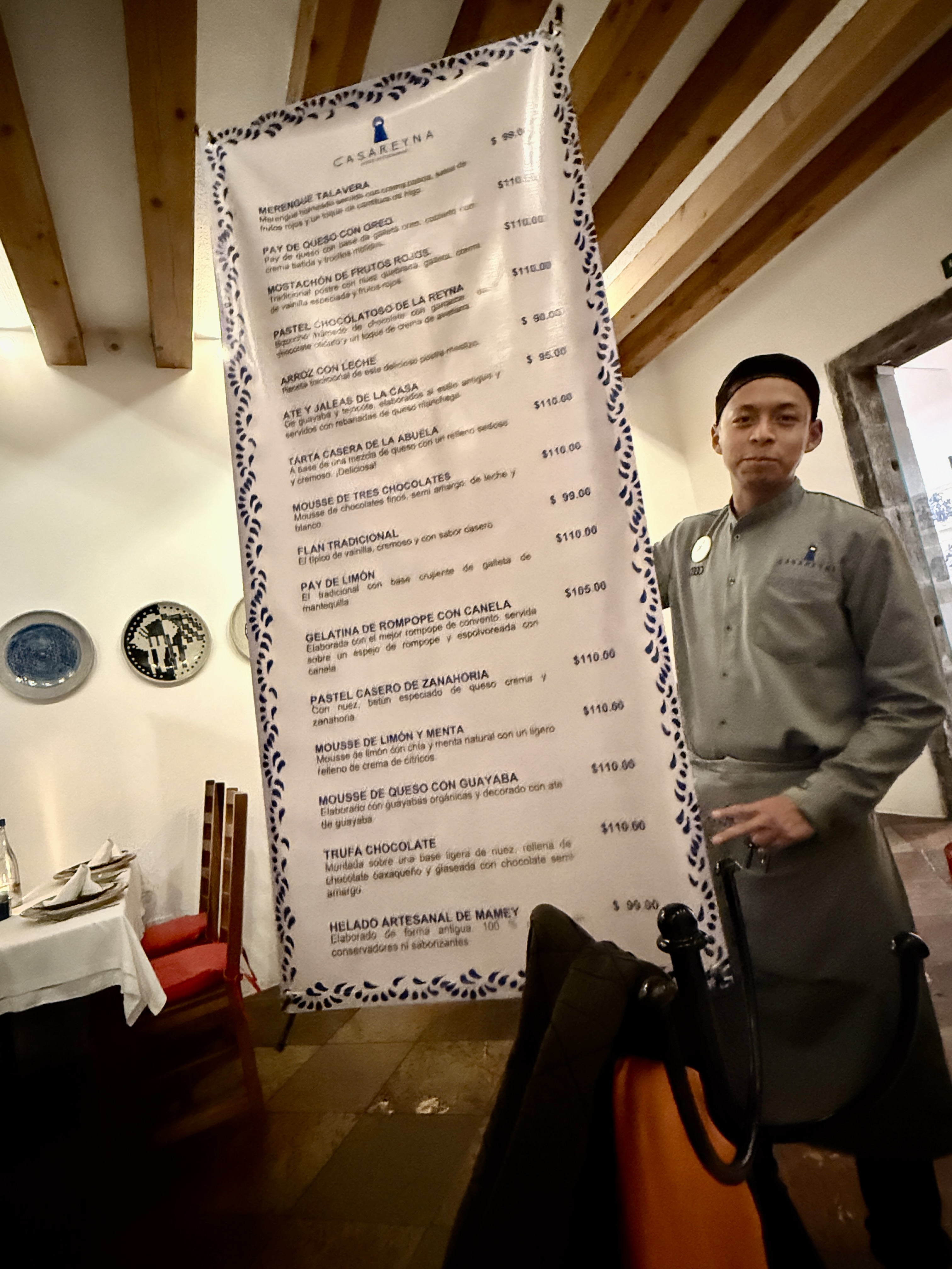 We had dinner at CasaReyna which is just a five-minute walk from the hotel. It’s an old family run restaurant that caters to locals and families. Some magazine from Sweden said it had the very best mole in Mexico. We shared two courses: a beef filet (they called it “soft”… maybe they meant tender) that came with guacamole and black beans. We followed this with a dish called “Grandma’s Mole” which was very tender chicken smothered in black mole (rich and delicious) with rice and peas. We drank Chilean wine and then they arrived with the dessert menu which is the size of a person. I guess that’s their gimmick. We had cheese cake.