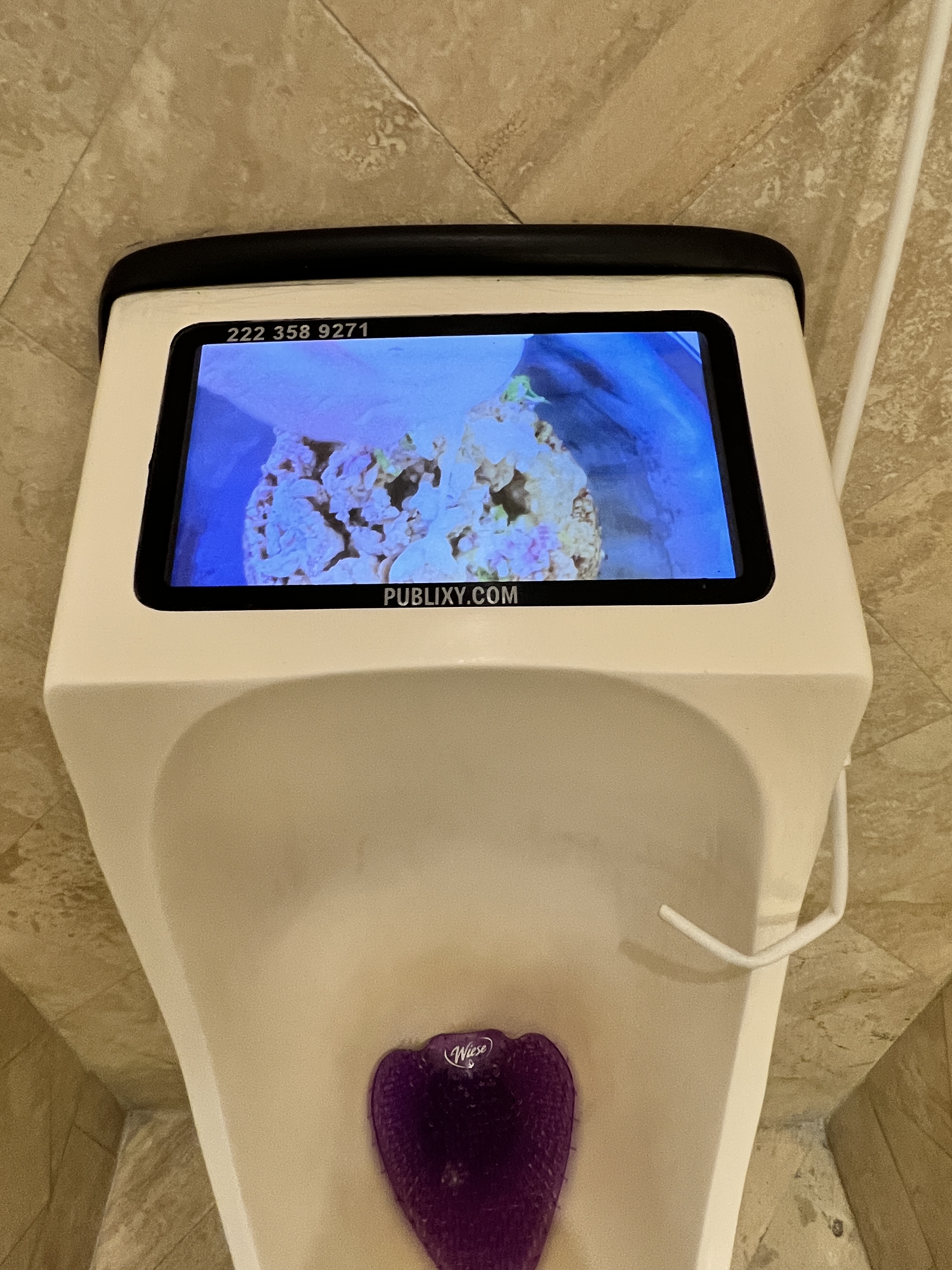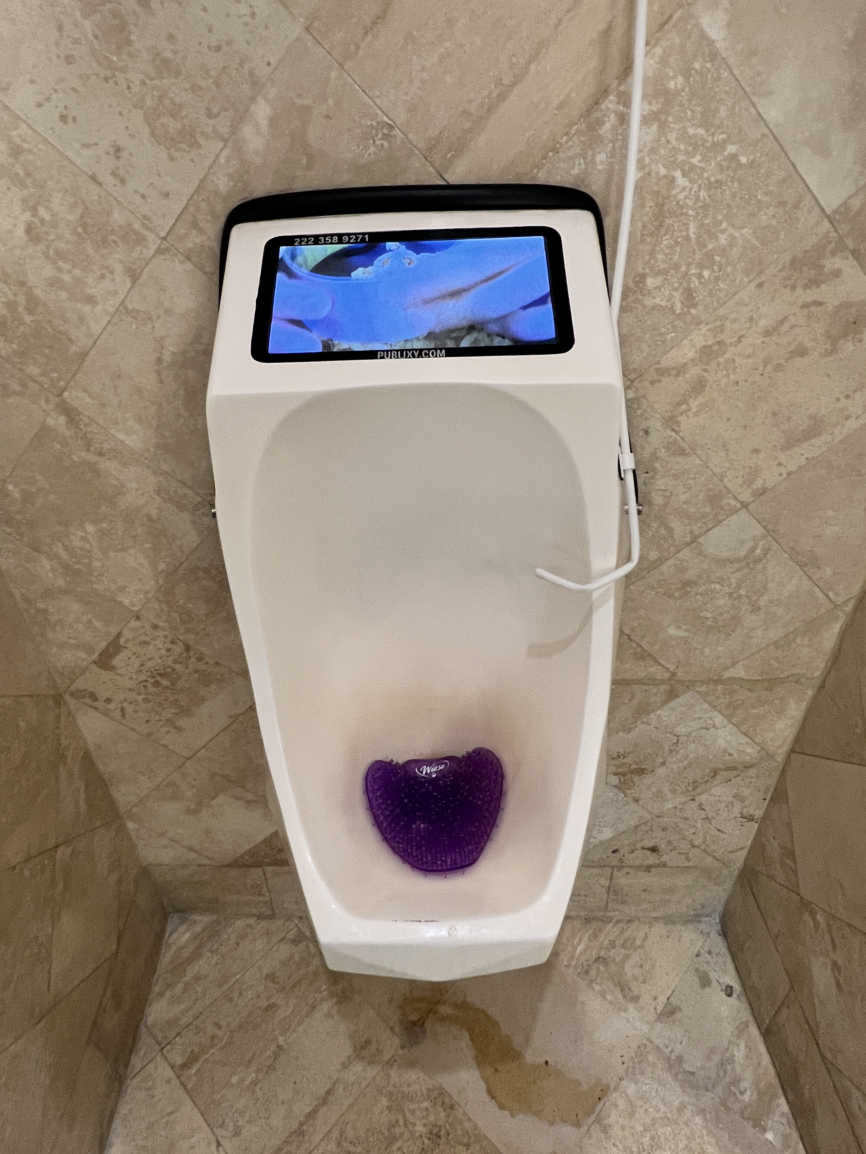 A final note… Mike went to the rest room and came back saying that capitalism has found a new place to advertise. On the top of the urinals there are videos playing, advertising some product (cannot imagine what!) .. Good thinking – a captive audience. He provided the following two photos.