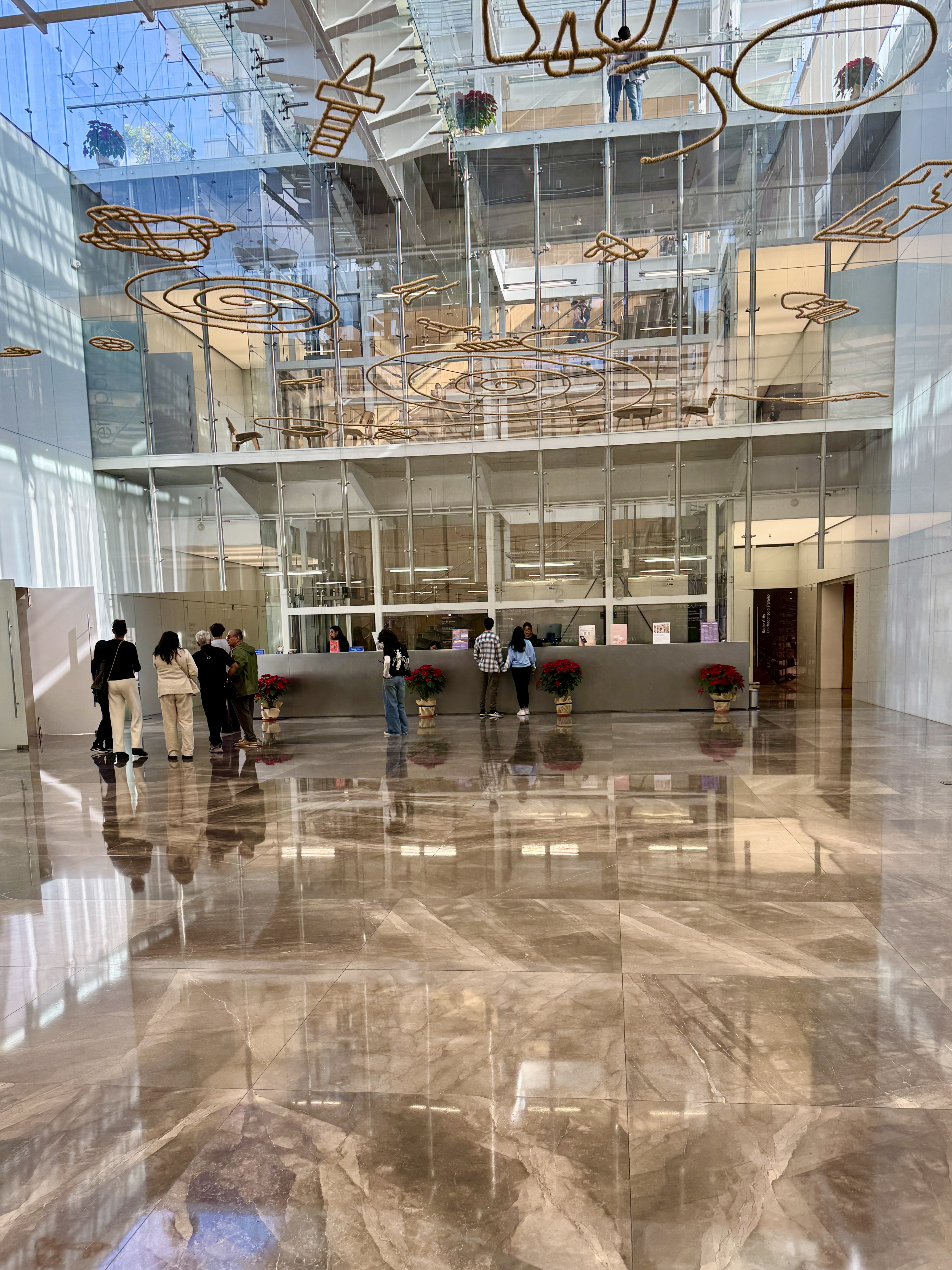 The museum is located within the historical center, close to the Zocalo. It was founded in 1991 to preserve and exhibit pre-Hispanic, as well as modern and contemporary art from Mexico (and beyond) and to host temporary exhibitions. Structurally it’s comprised of several historic buildings whose facades were retained and restored, but as you step inside you are in a totally modern, glass and steel structure that is totally transparent (in the public spaces, not in the exhibition areas) so you see layers as you walk through the spaces. The interior was intended to be “avant garde” and designed to accomodate new technologies as well as people with disabilities. Beyond this on the top floor there is a cafe and outdoor section where you can see a good deal of the historic center—contrasting this glass/steel deck with the centuries old buildings of the center. The building was well worth seeing and I spent my time in the galleries with the temporary exhibitions which were big, bold, and powerful.