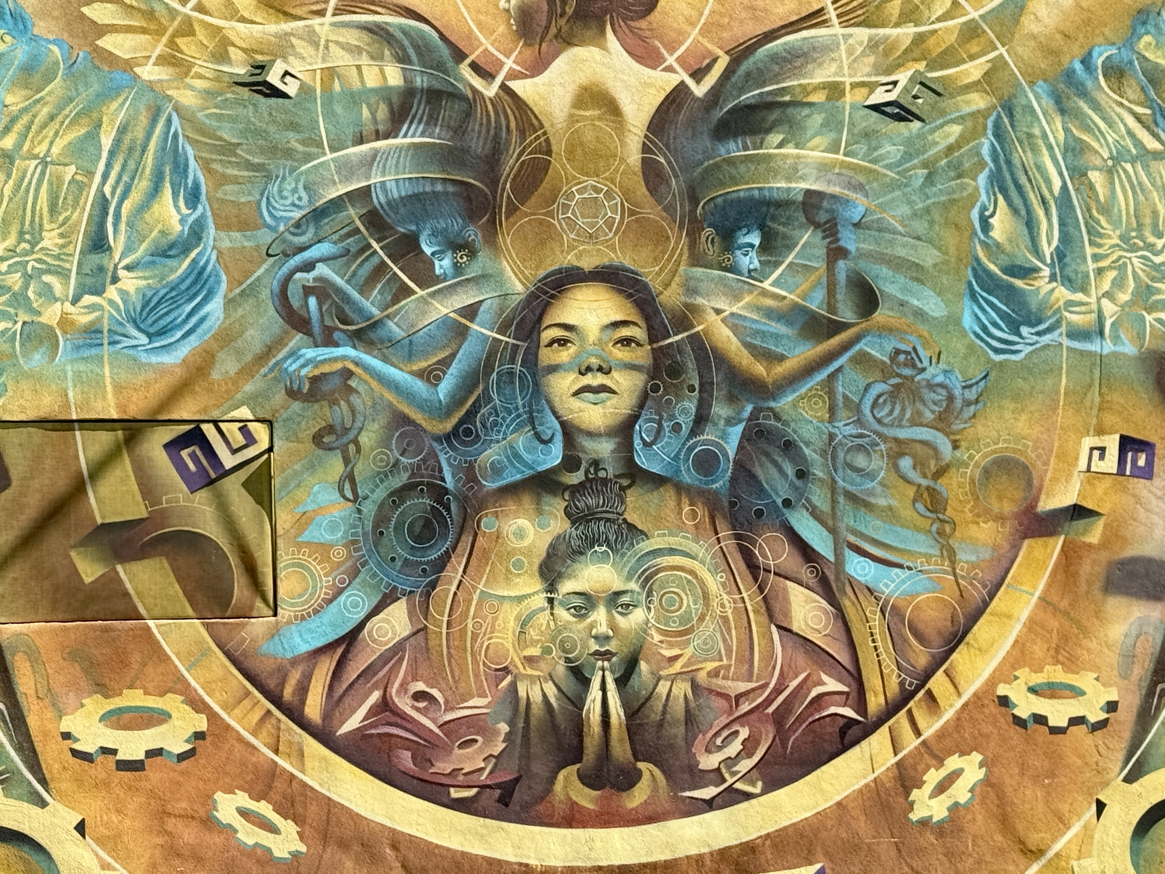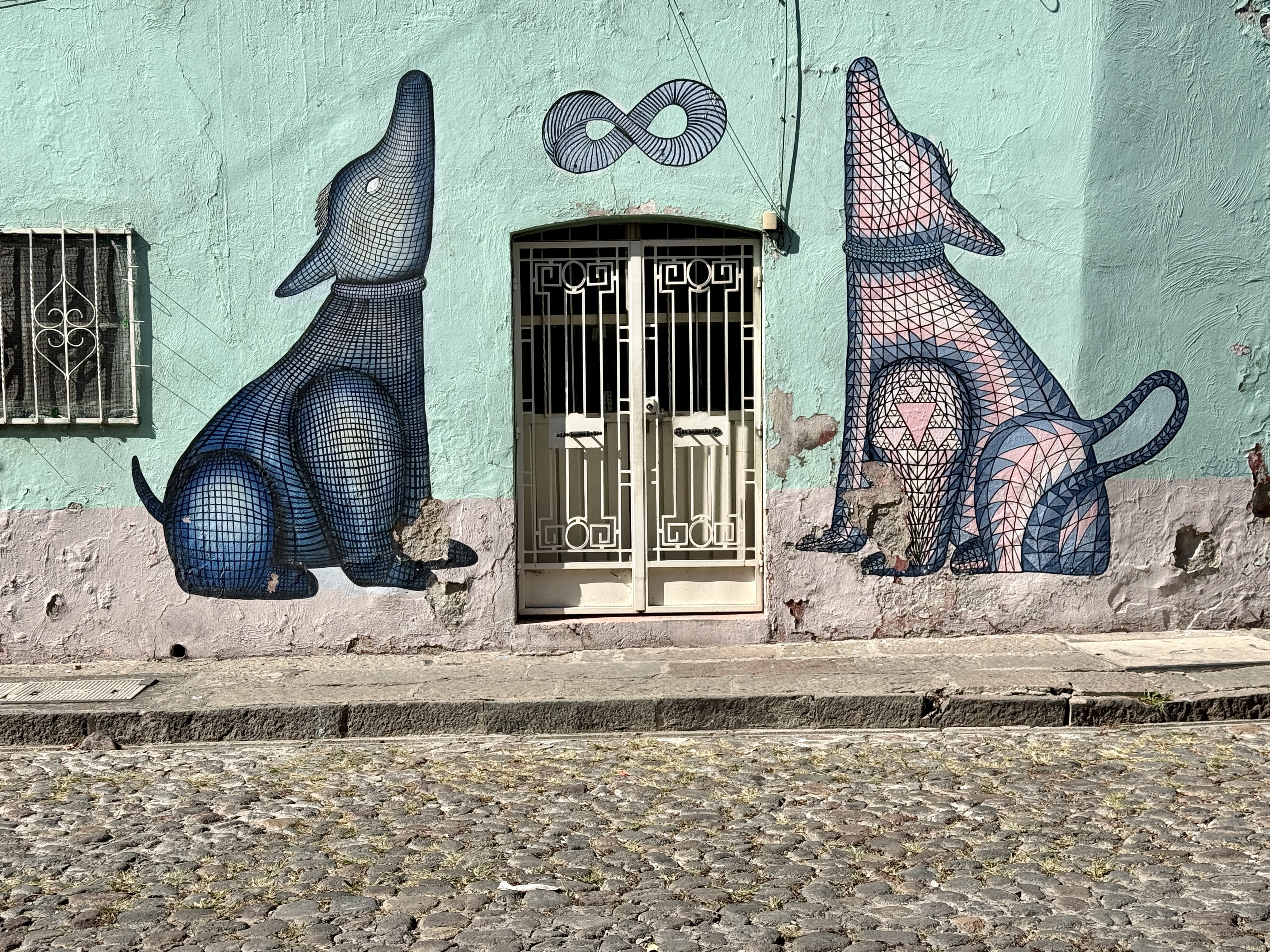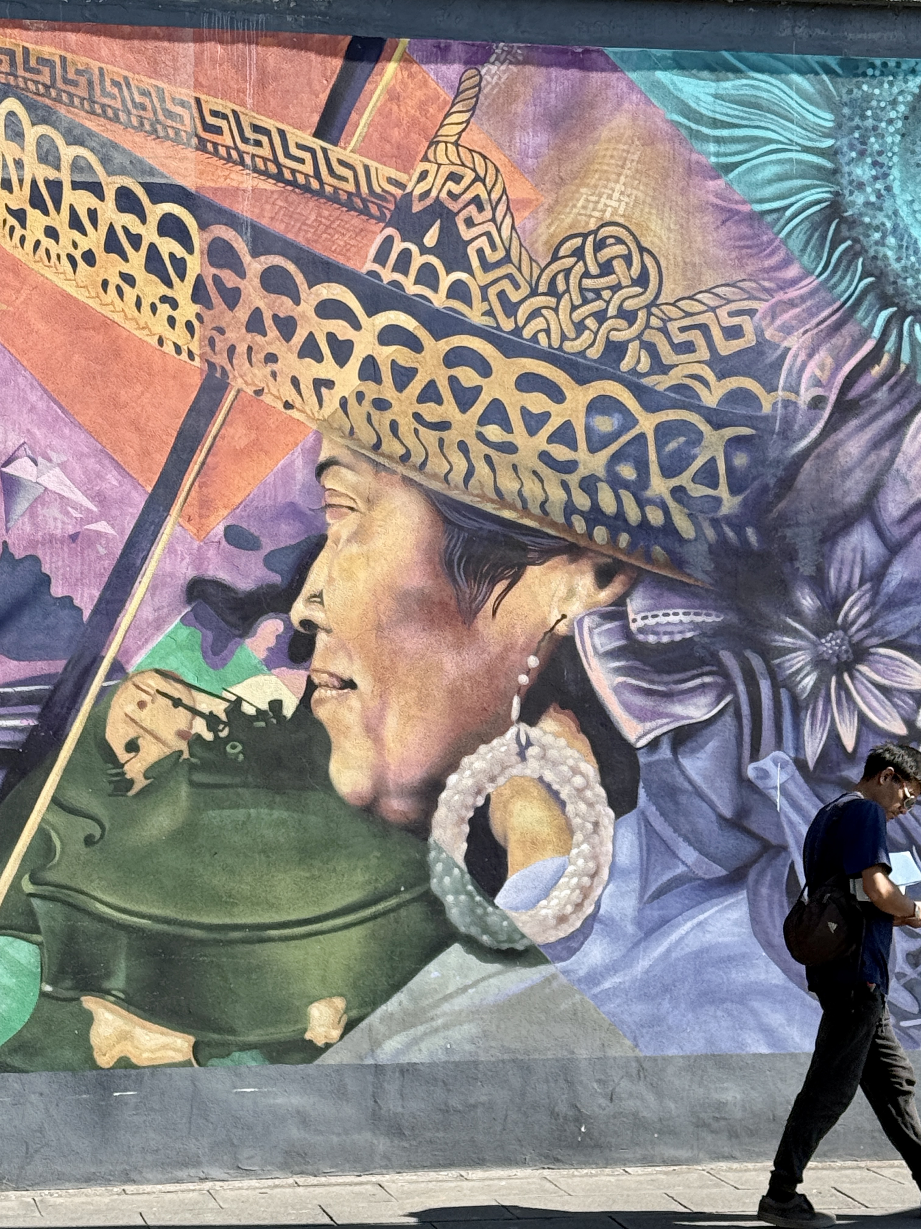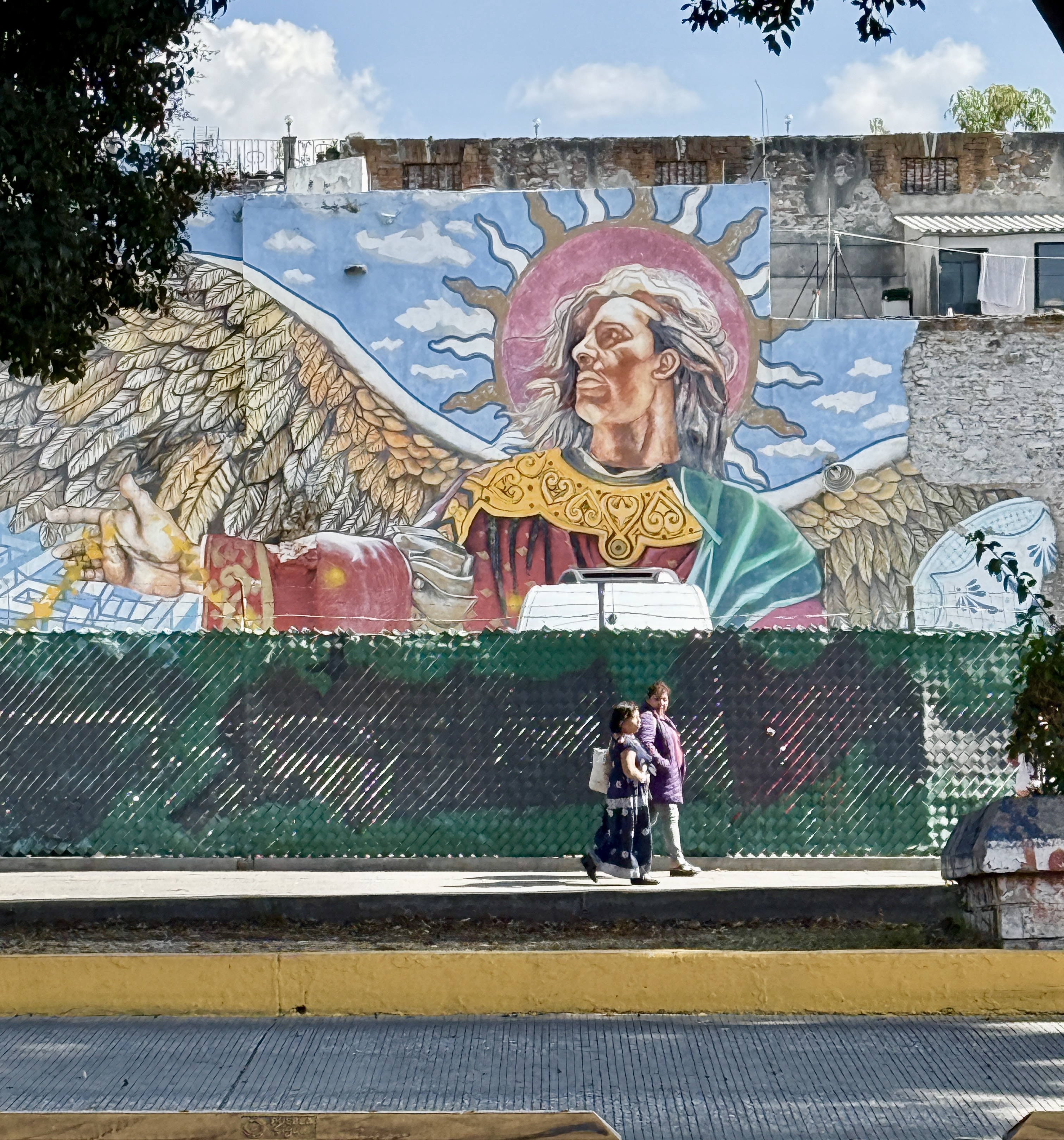 We were then headed to the market, but got sidetracked when we saw a street full of murals. And off we went– to a neighborhood whose name I cannot recall… and walked to see a host of murals. To be honest, I could visit these neighborhoods and see the different approaches to the murals — abstract design, politics, famous Mexicans, history, and more… This was a really modest neighborhood with a small makeshift market and streets lined with murals, many of which were now old and fading. We also passed a huge mural on the front of the department of social services.