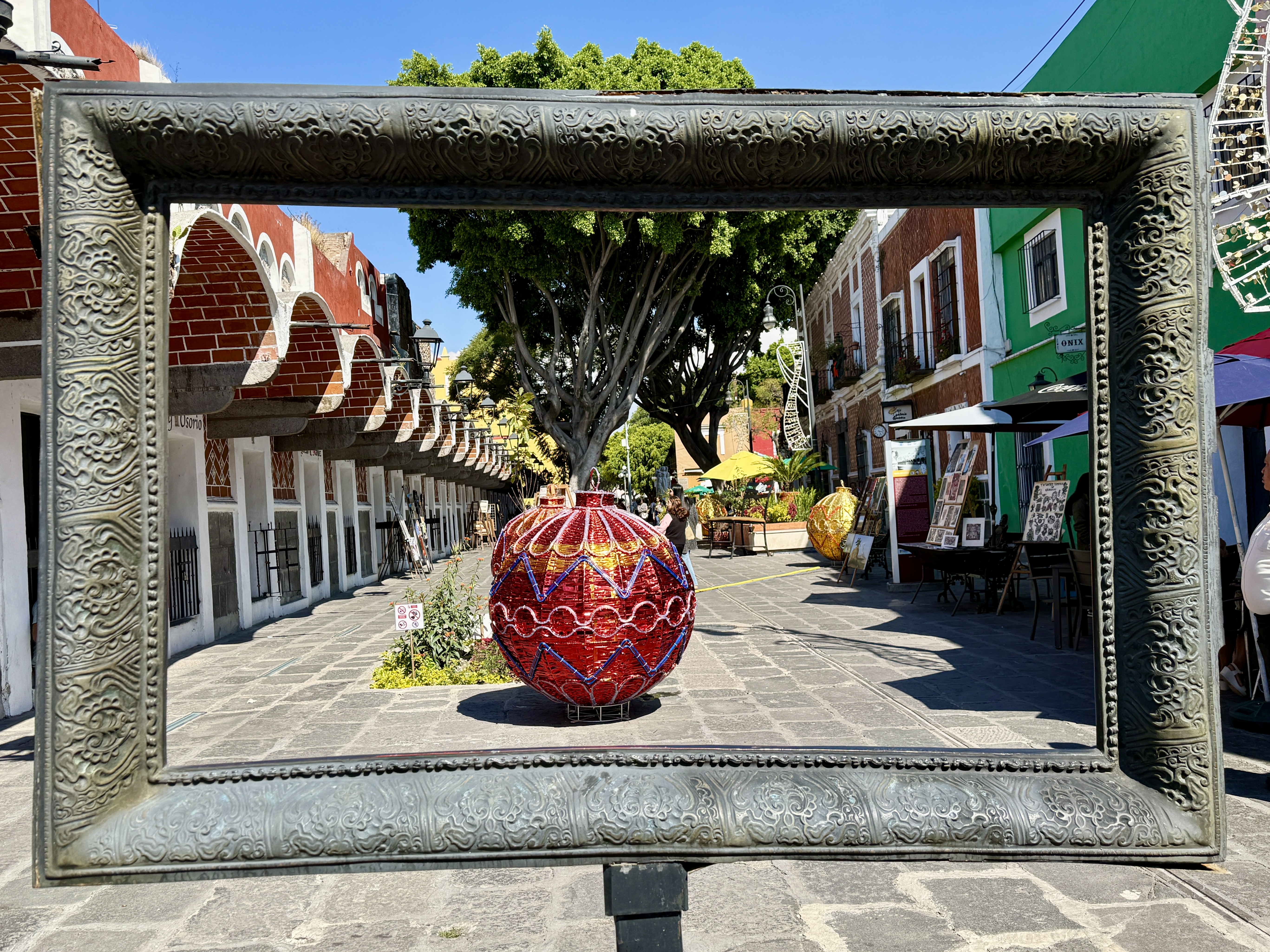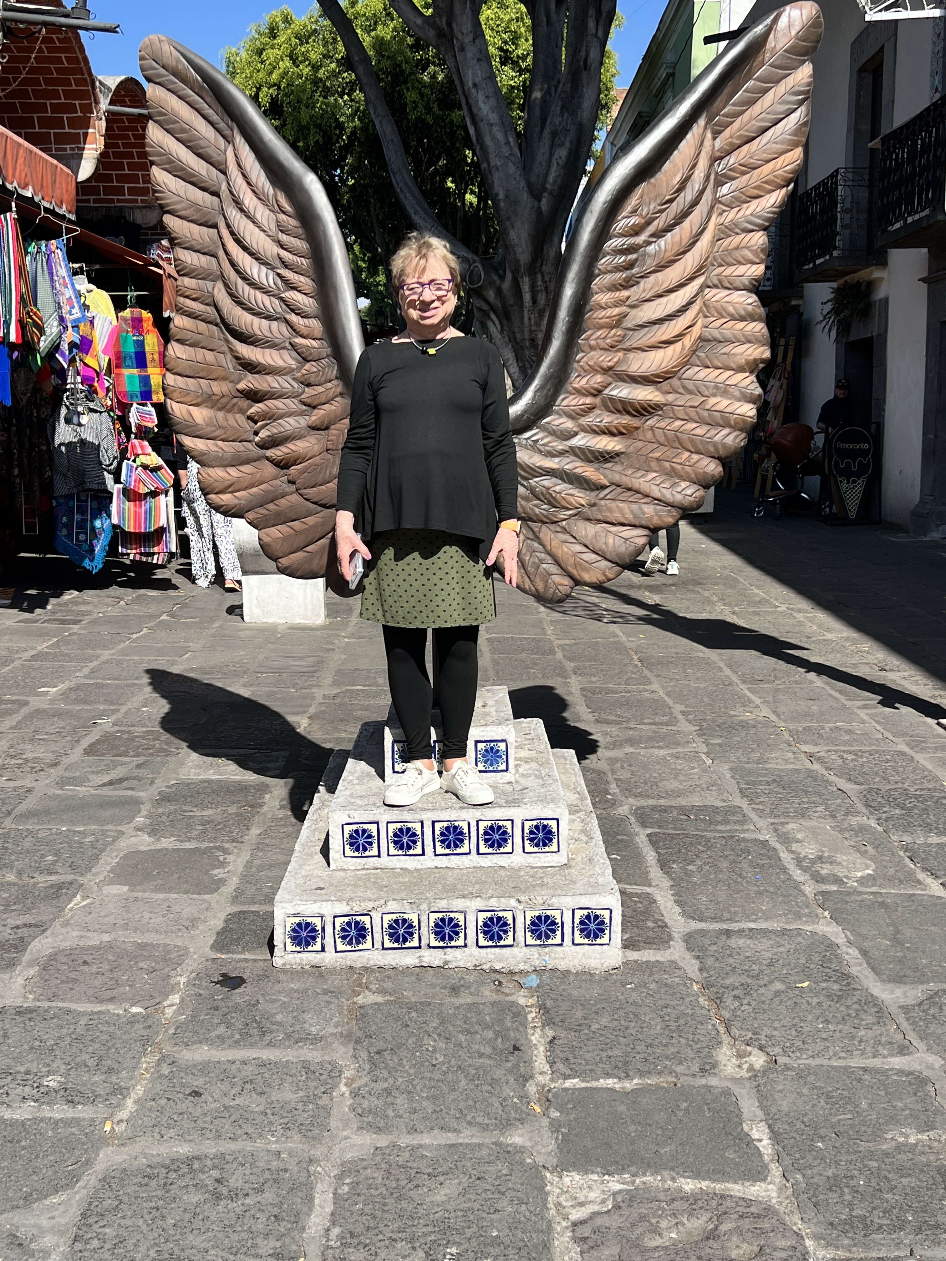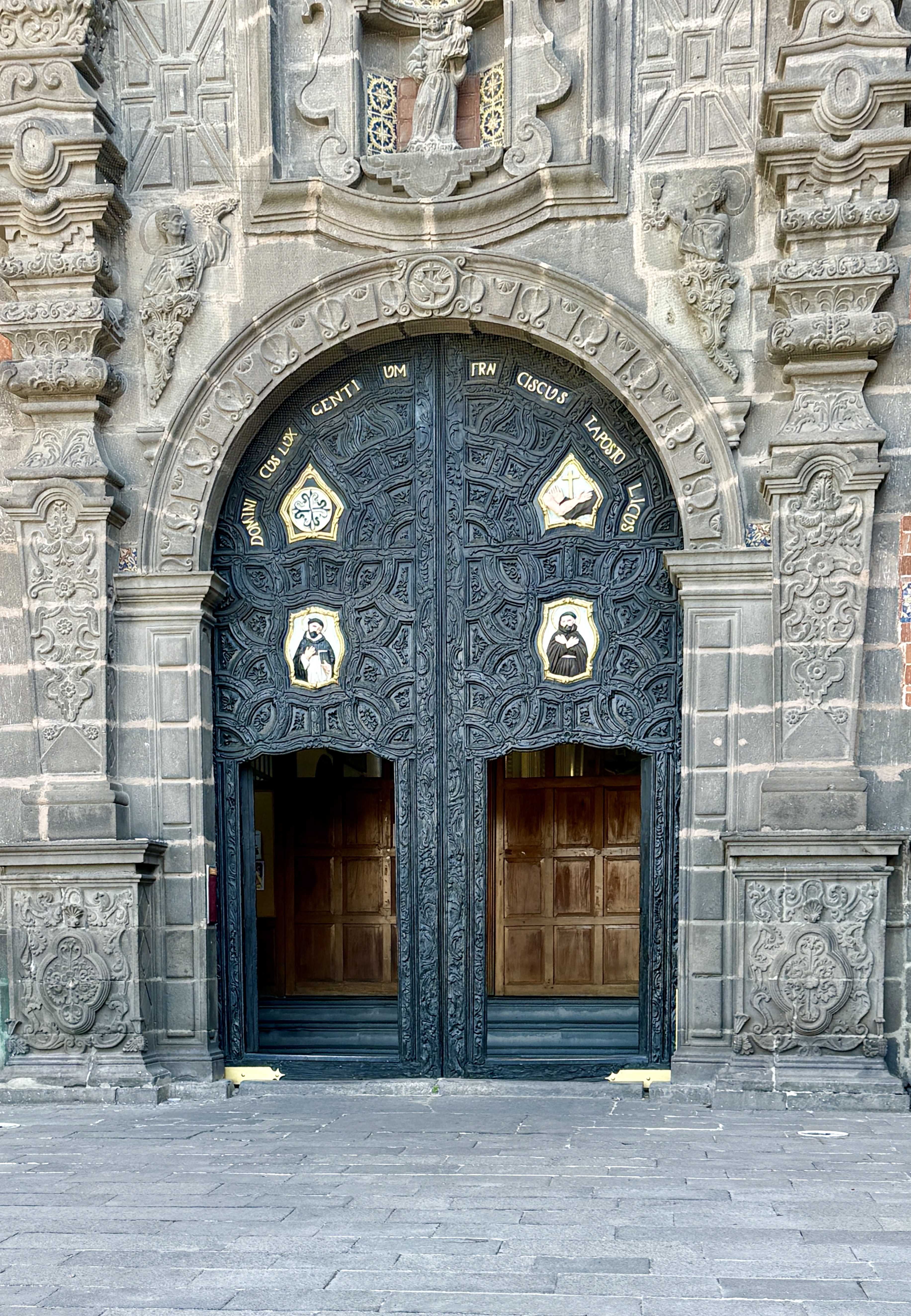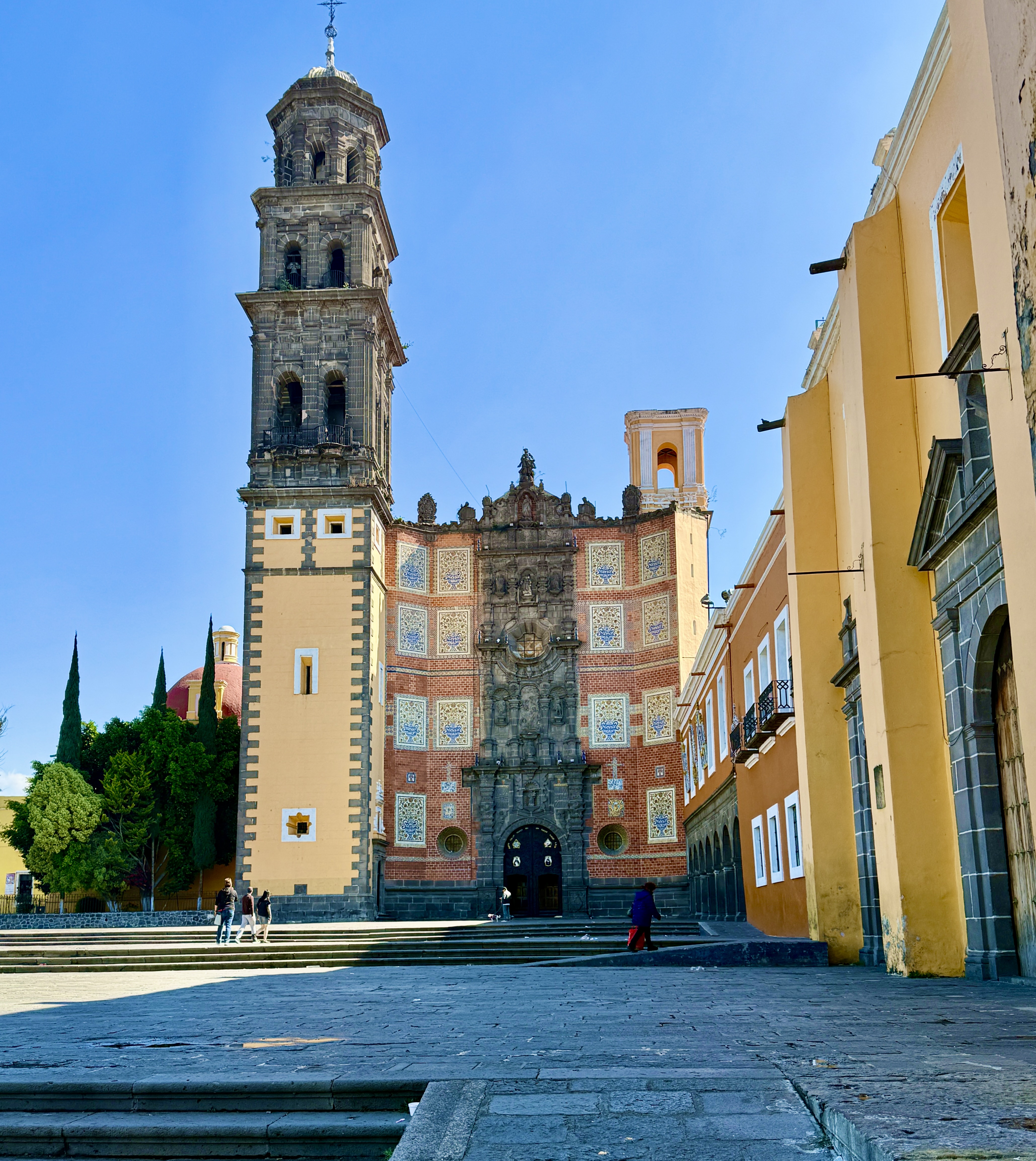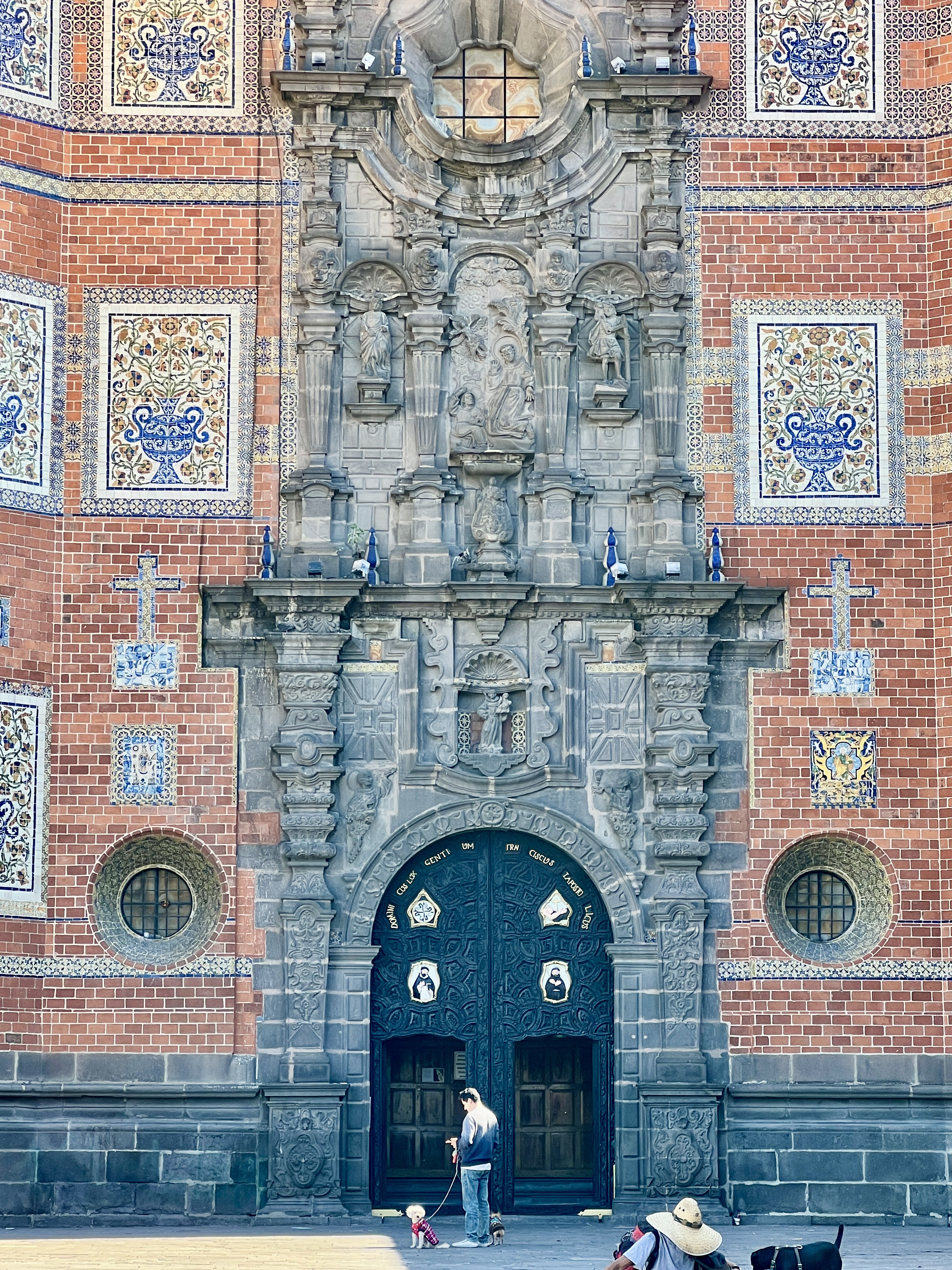 Given the issues with our room last night, and the fact that it was past 1;00 am when we were finally settled, we got a bit of a late start on breakfast, which we had at the hotel. Then we set out for the day, with a fairly long list of places we hoped to reach. First we went to the church we were able to see from our original room at the hotel: Convent Church of San Francisco, because we could tell it had lots of Talavera on the outside (and frankly I assumed it would have some inside as well), Anyway, we strolled over to see it. It’s tower is about 210 ft tall and while the building is (yet again) baroque, it has beautiful tile work on the facade. It’s eclectic and the tiles make it ereally special.
